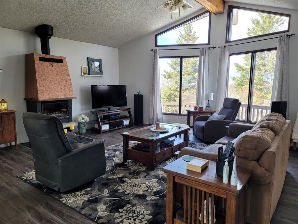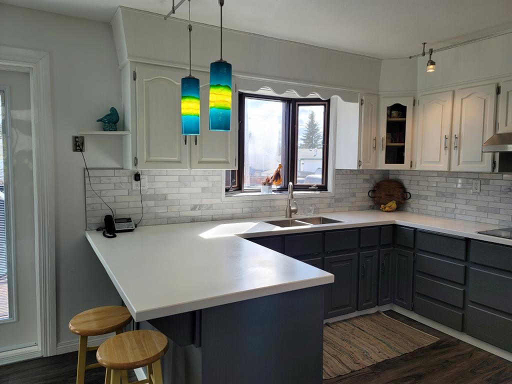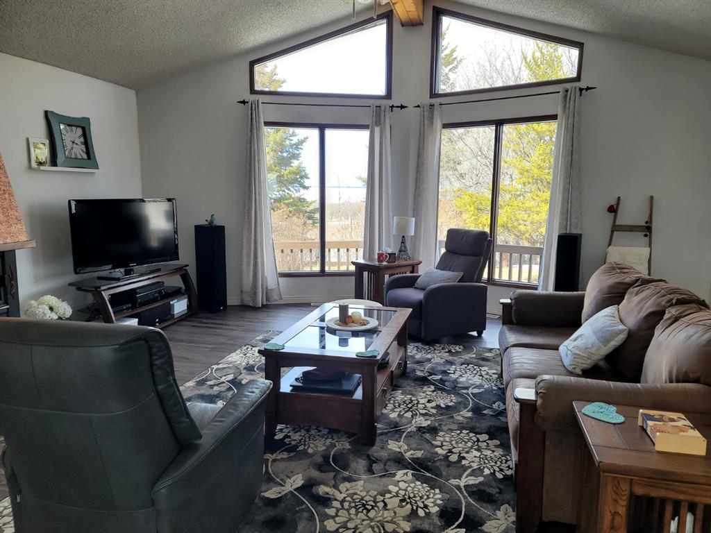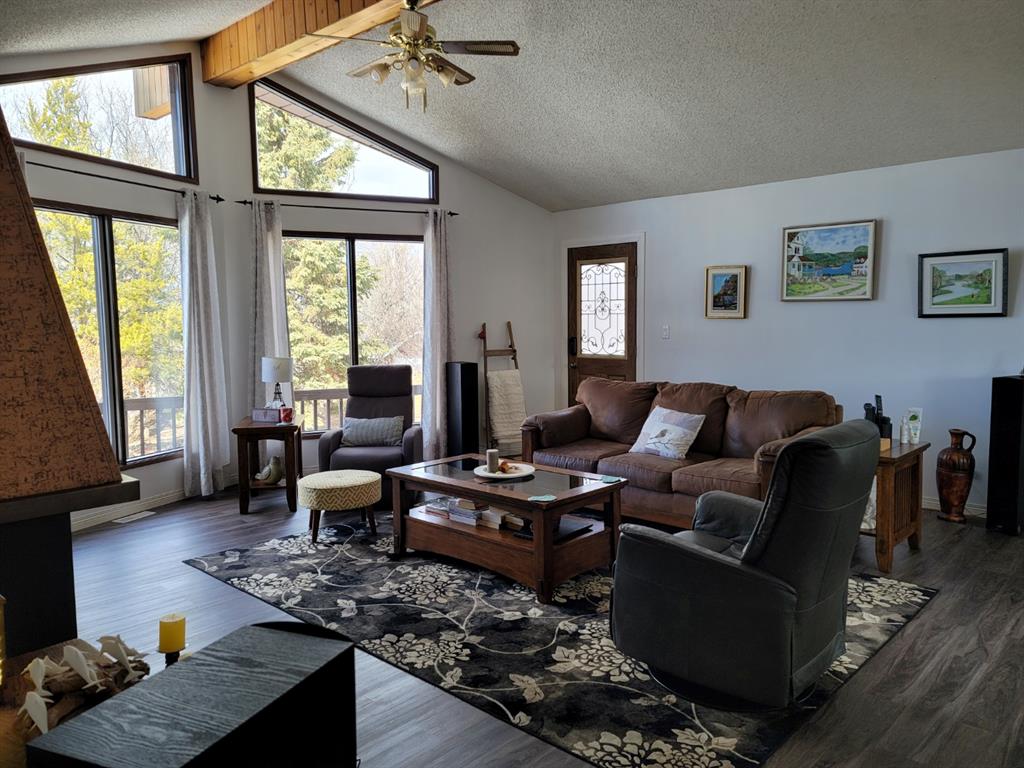 Private with a View! This amazing home speaks of pride of ownership and offers private living surrounded by mother nature. Situated on a 100'x130' oversized lot and beautifully landscaped with many trees, walkways, and flowerbeds. The livingroom with the vaulted ceilings and prow window and front wraparound deck access offer a stunning view of Kimiwan Lake. Wake up in the morning and enjoy the same lakeview from your Masterbedroom featuring a walk-in closet, and 3pc Ensuite. A further 2 bedrooms, 4pc bathroom, laundry room, diningroom with back deck access and a great working kitchen with new countertop range, and all the appliances you need to entertain your special guests complete the main floor. The basement is about 80% complete with 1 bedroom, 2pc bathroom(new Sept/25), and all that is left for you to do is choose your flooring. This home has undergone many recent renovations in the last 2-4 years including interior paint, refurbished kitchen cabinets, countertops,led lighting, back deck with composite decking, flooring,furnace, and shingles new Sept 2024.. The double detached garage constructed in 1997 is wired 220 and heated and as well there is additional parking in the back. This fantastic property is just waiting for you, don't delay!