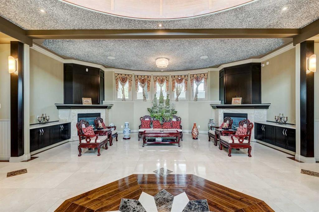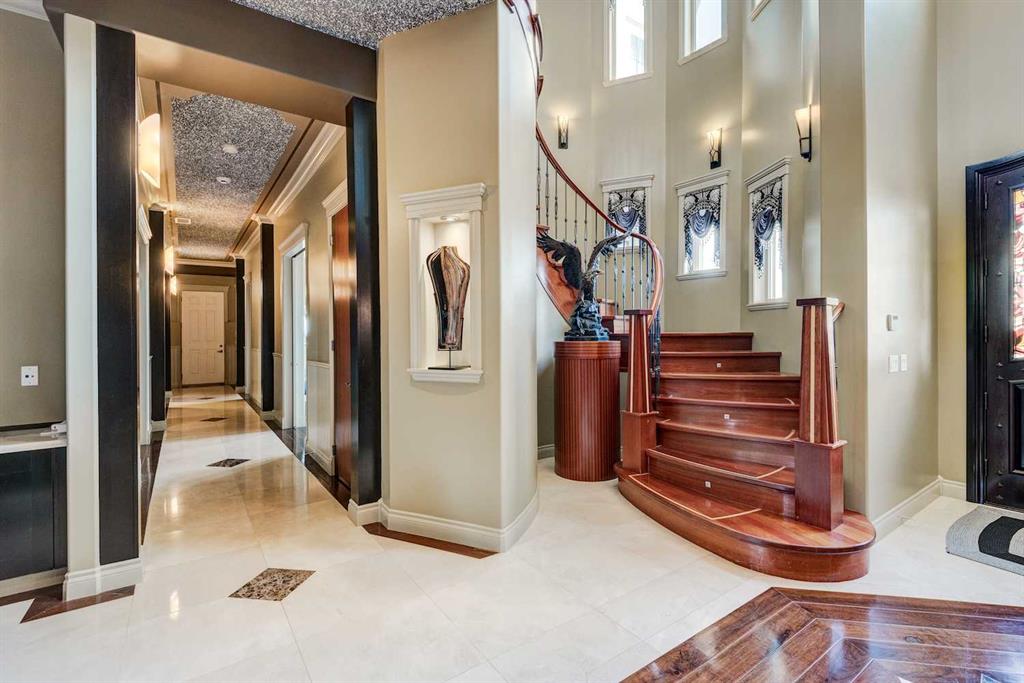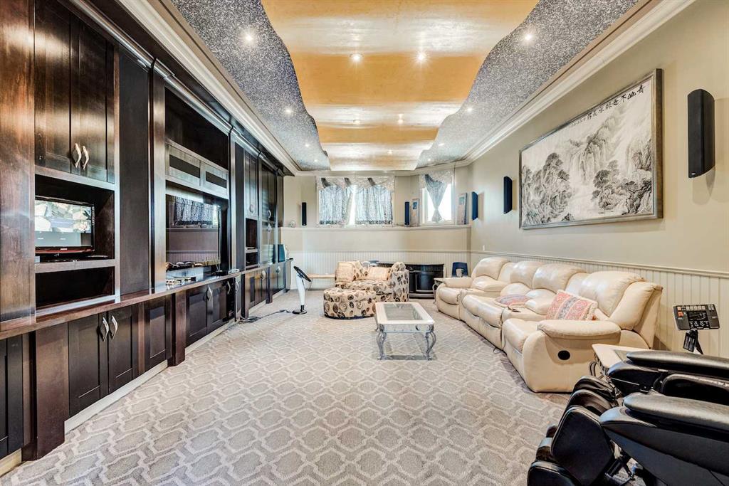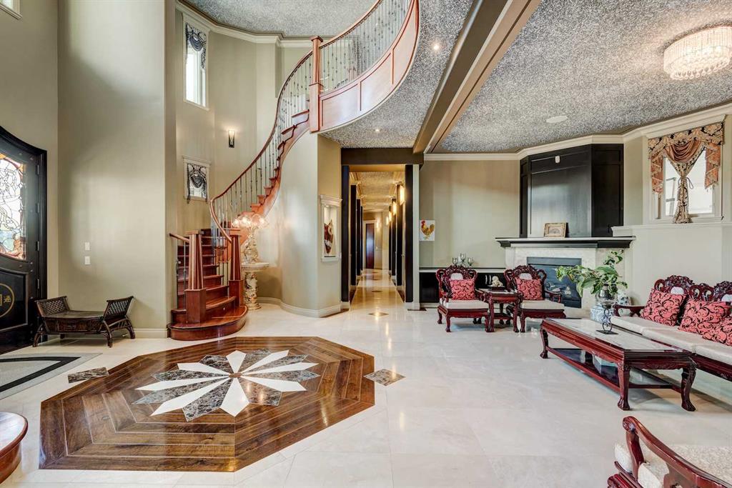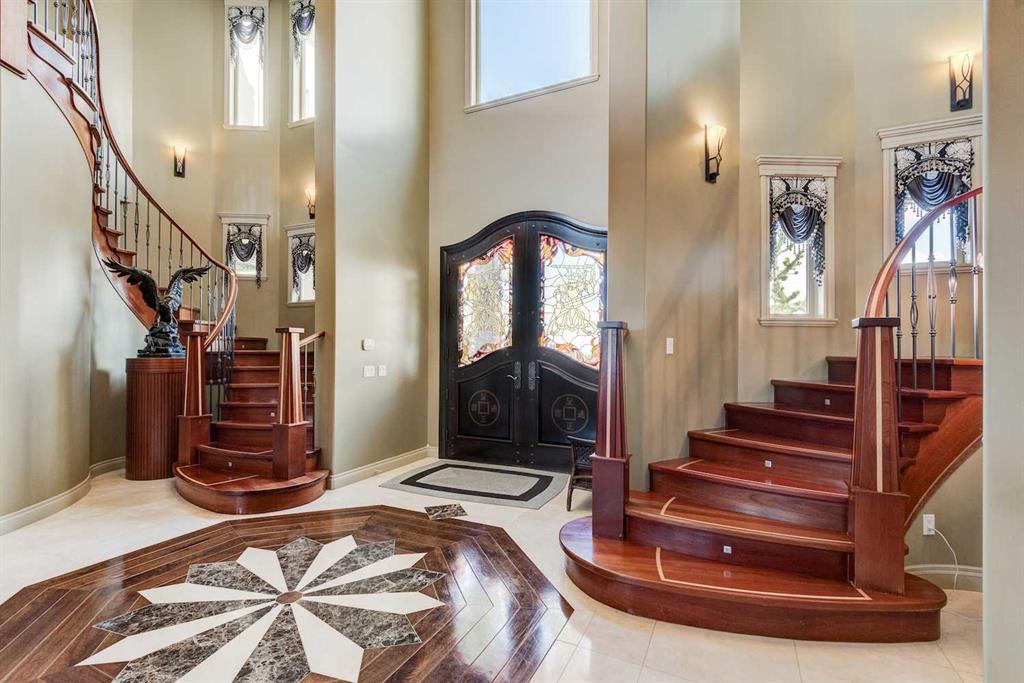 This architectural masterpiece offers an impressive fully furnished 13,500 SF of lavish living space, including a sprawling 2,700 SF gymnasium. A grand foyer, adorned with an imperial spiral staircase, warmly welcomes your guests. High ceilings grace this abode, featuring 7 bedrooms, 6 ensuite bathrooms, 3 additional bathrooms, an exercise room, a theatre room, and a formal dining room. This custom-designed residence offers an array of luxurious amenities, meticulously crafted for your entertainment and pleasure. The interior spaces are versatile, accommodating everything from formal dinners and cocktail soirées to movie nights, fully equipped karaoke system and lively games of basketball or badminton. The main level also boasts a bright sitting area with a well-appointed bar, a games area, and a magnificent sunroom. The open gourmet kitchen comes equipped with high-end built-in appliances, satisfying even the most discerning chefs. The primary bedroom retreat is a true oasis, complete with a cozy sitting area, a balcony, a walk-in closet with custom organizers, a soothing waterfall shower, and a rejuvenating Jacuzzi tub. Outside, a multi-level deck and terrace provide covered and open spaces for outdoor entertainment, all while offering panoramic views of the rolling Calgary hills. The private backyard is enveloped by lush landscaping and towering trees. With a 5-car insulated oversized garage and ample paved parking for guests, convenience is never compromised. Ideally situated, this home is just a short 5-minute drive from Bearspaw Golf Club and only 10 minutes away from Calgary's shopping, restaurants, schools, and more. Designed with the principles of Feng Shui, this estate fosters balance and harmony between you and the natural world that surrounds it. Don't miss the opportunity to make this stunning property your own.