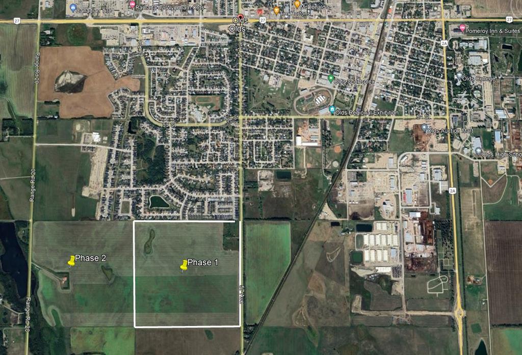 A full quarter of annexed land on the edge of Olds just waiting for the right developer to come and get going!! There has been an Area Structure Plan put into place a while ago but will need to be readdressed with the Town of Olds. It had a plan for 600 lots on the north 80 acres. All the services are to the boundary (just hook up and go). Housing already exists to the North of the property. The quarter to the west is available to be purchased if you are really looking into the long term future. Olds is a town of around 9000 population, just 45 minutes north of Calgary Airport and 35 minutes to Red Deer on the busy QE2 Highway. Very central in the province of Alberta. A portion of the population now commutes both to Calgary and Red Deer every day for work. The big box stores are already here. The planning for the future is already in place! Do your homework, then try and convince me that you can get this value in the larger centers!