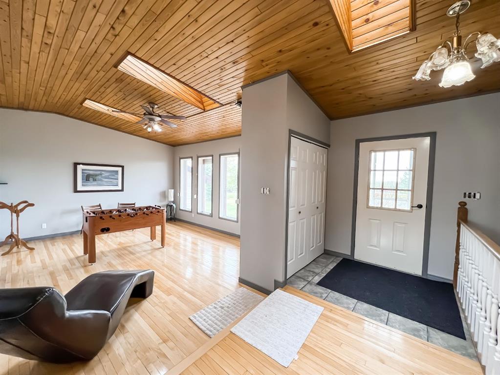 Welcome to this stunning 5-bedroom, 2-bathroom home set on an expansive 8.82-acre acreage, on beautiful crown land, offering the perfect blend of country living and modern convenience. As you enter the home, you'll immediately appreciate the abundance of natural light streaming through the beautiful skylights throughout the house. These skylights, combined with numerous large windows, illuminate the spacious interiors and highlight the natural woodwork finishes, creating a warm and inviting atmosphere. The gorgeous living area is bathed in natural light thanks to the skylights and large windows, providing a serene and airy ambiance. The kitchen is a chef's delight, boasting an abundance of cabinetry and countertop space, along with an eat-up bar perfect for casual dining. The adjoining dining area features patio doors that open to a deck, ideal for outdoor dining and entertaining. The primary bedroom features a large walk-in closet and direct access to a 4-piece bathroom, which also includes a skylight for added brightness. Two additional bedrooms on the main floor provide ample space for family or guests, and the dedicated laundry room adds to the home's convenience. Downstairs, a cozy yet spacious family room awaits, complete with a beautiful stone wood-burning fireplace and a wet bar, making it perfect for hosting and entertaining. This lower level also includes two more bedrooms, an office, and a large storage room, as well as direct access to the garage. Outside, you'll find a double-car garage for parking convenience, a large 40x60 shop, and a shed for all your storage needs. The 8.82-acre property is beautifully treed and adorned with many perennials, creating your own private country retreat. Despite its tranquil setting, the home is in close proximity to town, offering the best of both worlds. Don't miss this opportunity to experience country living at its finest. Check it out today!