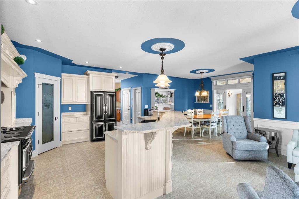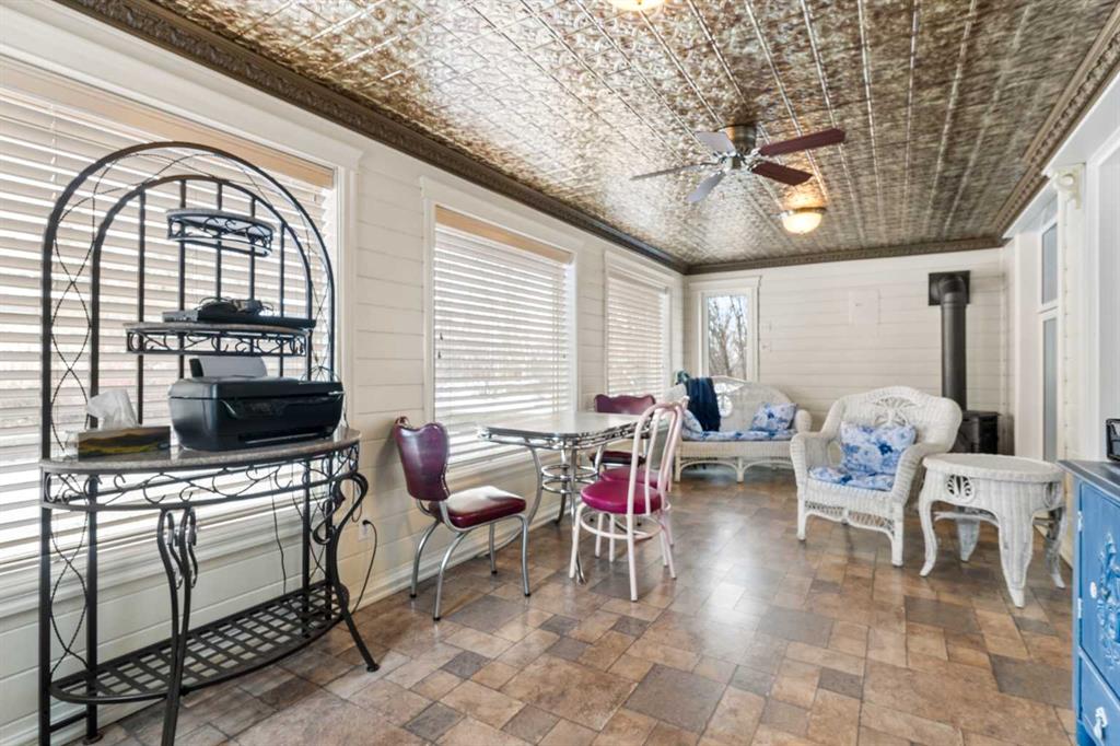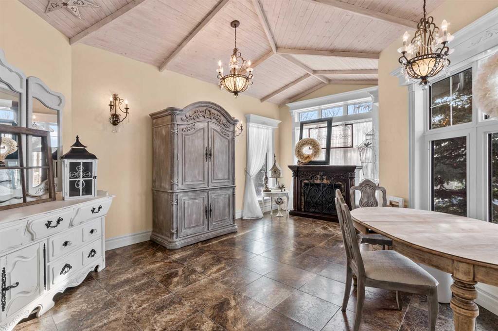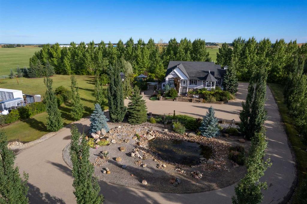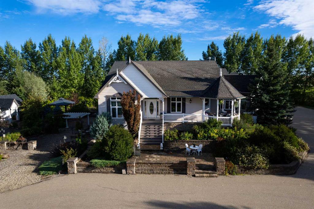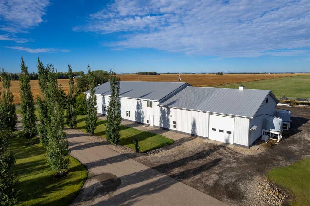 This beautifully landscaped 5.49-acre acreage offers exceptional potential for a small/medium-sized business and additional housing for extended or blended families. Located 5 minutes north of Didsbury, AB, and 10 minutes south of Olds, AB, just off Highway 2A, it boasts gorgeous mountain views. The main house, with 2,017 sq ft of French country charm, features crown moldings, barn and French doors, and hardwood floors. The spacious kitchen, updated in 2023, has a two-tiered island, quartz countertops, a farmhouse sink, hard wood floors and ample cabinet space. The main floor also includes a dining room, living room, covered maintenance-free veranda with an outdoor kitchen. Master bedroom with a 4-piece ensuite, fireplace, soaker tub, and walk-in closet. Additional spaces include a 2-piece bath, second bedroom, laundry room, mudroom, and garage entrance. The fully finished walk-out basement provides 1,735 sq ft, featuring 2 bedrooms, a media room, a 4-piece bath, a playroom, and storage. ICF construction, crown moldings, fresh paint (2023), and in-floor heating throughout enhance the home's appeal. The oversized, heated double garage has a paved driveway. The property includes a 6,400 sq ft shop (128' x 50') with three-phase power. Features include a 50’x24’ drive-through wash bay with 12’ overhead doors, a 50’x24’ welding bay with a 16’ overhead bay door and crane. 50’x80’ main shop area with two 14’ bay doors and 16’ clearance. The shop also has a wood workshop, paint storage, front office space, and a 3-piece bathroom. A new boiler (2024) ensures in-floor heating. Above the woodworking shop, a spacious living area includes a kitchen, laundry, 4-piece bathroom, 3 bedrooms, a master bedroom with a walk-in closet, and a storage room. The mezzanine adds additional living space, perfect for additional family members. This exceptional property has been meticulously maintained and offers an unparalleled combination of country residential comfort and business potential. Whether you are seeking a spacious family home, a live-work opportunity, or a combination of both, this acreage provides a rare and sophisticated setting with limitless possibilities.