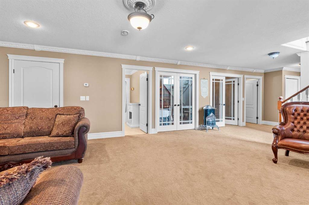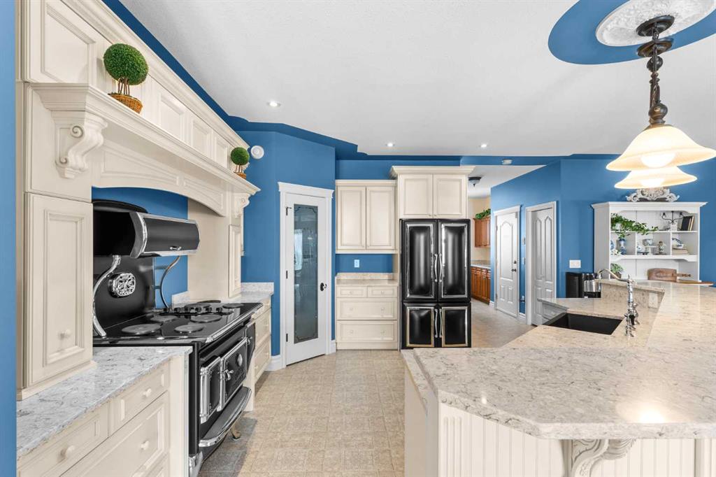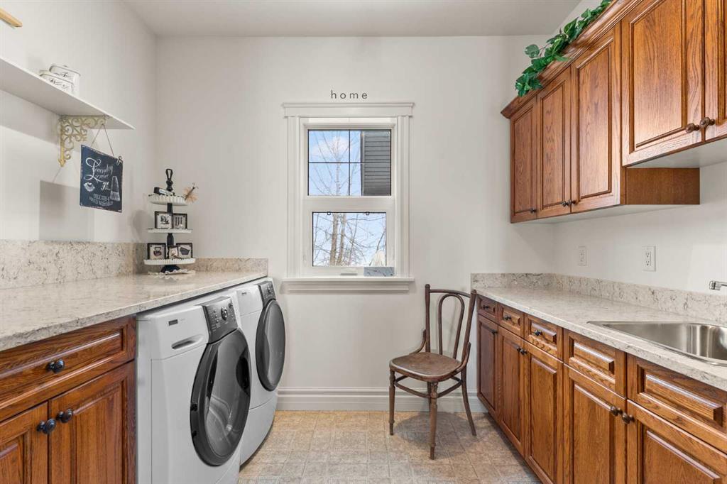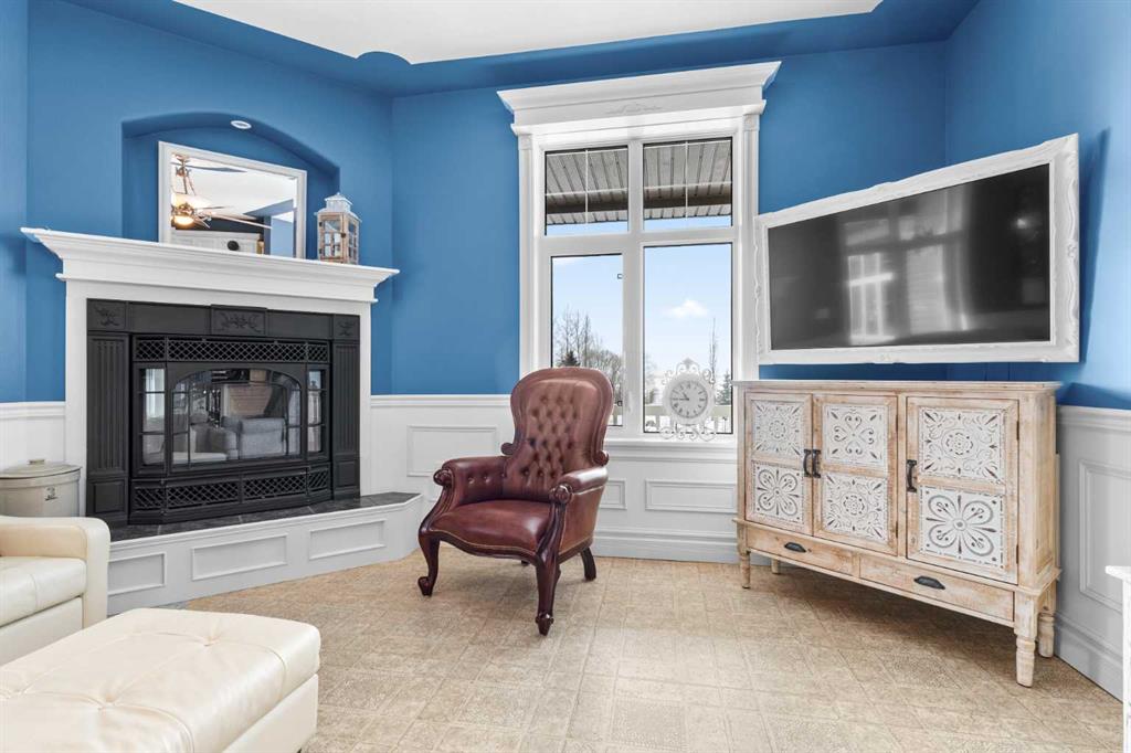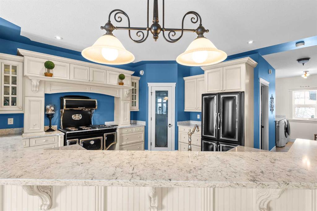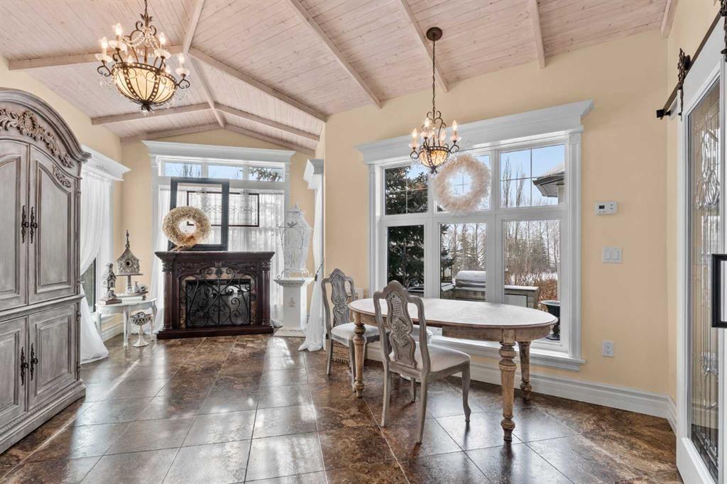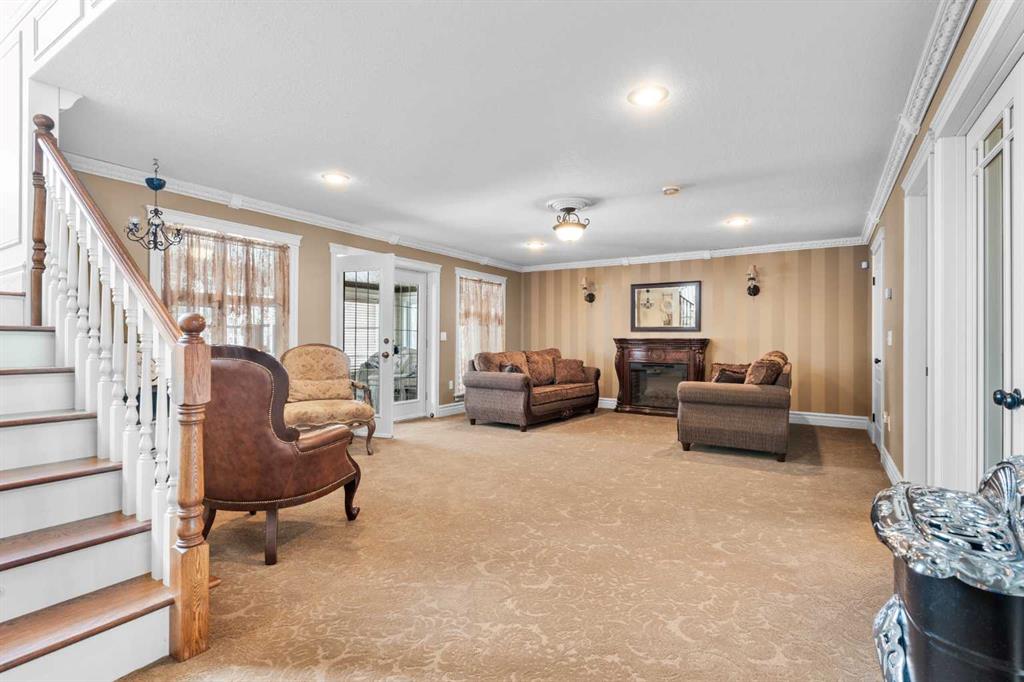 This beautifully landscaped 5.49-acre acreage offers exceptional potential for a small/medium-sized business and additional housing for extended or blended families. Located 5 minutes north of Didsbury, AB, and 10 minutes south of Olds, AB, just off Highway 2A, it boasts gorgeous mountain views. The main house, with 2,017 sq ft of French country charm, features crown moldings, barn and French doors, and hardwood floors. The spacious kitchen, updated in 2023, has a two-tiered island, quartz countertops, a farmhouse sink, hard wood floors and ample cabinet space. The main floor also includes a dining room, living room, covered maintenance-free veranda with an outdoor kitchen. Master bedroom with a 4-piece ensuite, fireplace, soaker tub, and walk-in closet. Additional spaces include a 2-piece bath, second bedroom, laundry room, mudroom, and garage entrance. The fully finished walk-out basement provides 1,735 sq ft, featuring 2 bedrooms, a media room, a 4-piece bath, a playroom, and storage. ICF construction, crown moldings, fresh paint (2023), and in-floor heating throughout enhance the home's appeal. The oversized, heated double garage has a paved driveway. The property includes a 6,400 sq ft shop (128' x 50') with three-phase power. Features include a 50’x24’ drive-through wash bay with 12’ overhead doors, a 50’x24’ welding bay with a 16’ overhead bay door and crane. 50’x80’ main shop area with two 14’ bay doors and 16’ clearance. The shop also has a wood workshop, paint storage, front office space, and a 3-piece bathroom. A new boiler (2024) ensures in-floor heating. Above the woodworking shop, a spacious living area includes a kitchen, laundry, 4-piece bathroom, 3 bedrooms, a master bedroom with a walk-in closet, and a storage room. The mezzanine adds additional living space, perfect for additional family members. This exceptional property has been meticulously maintained and offers an unparalleled combination of country residential comfort and business potential. Whether you are seeking a spacious family home, a live-work opportunity, or a combination of both, this acreage provides a rare and sophisticated setting with limitless possibilities.