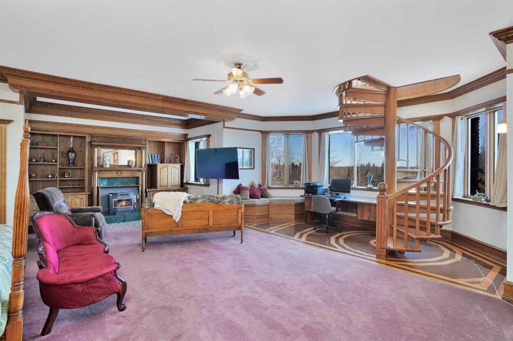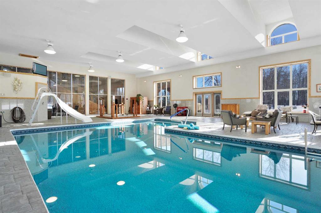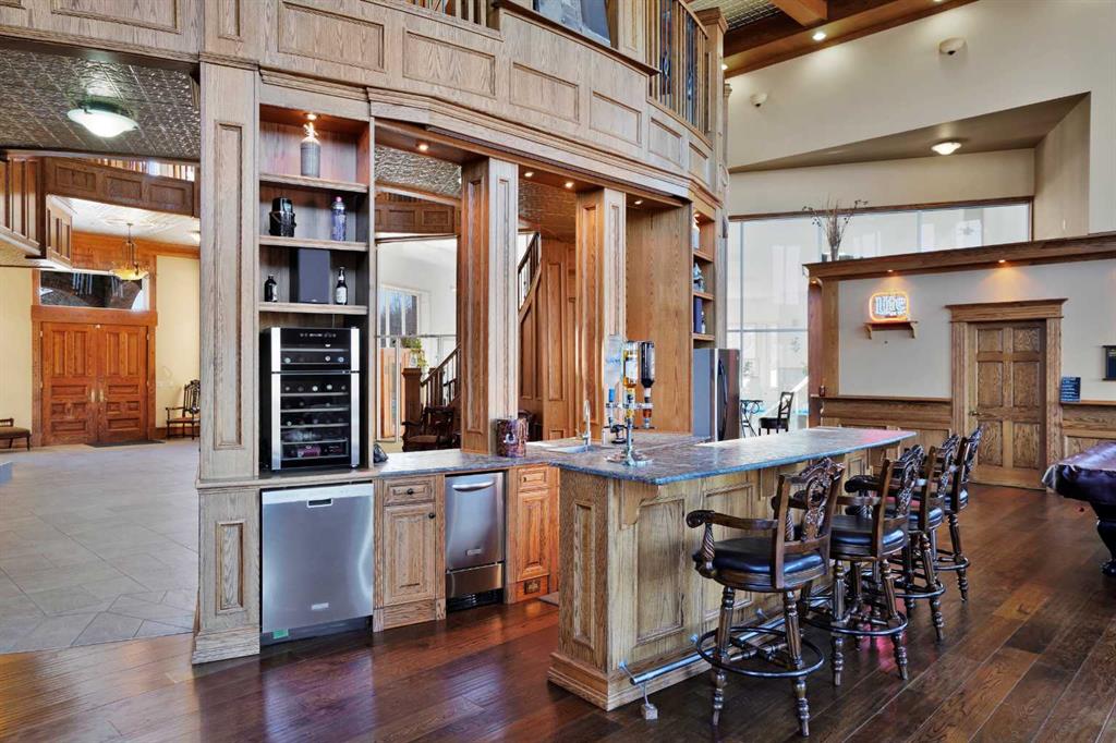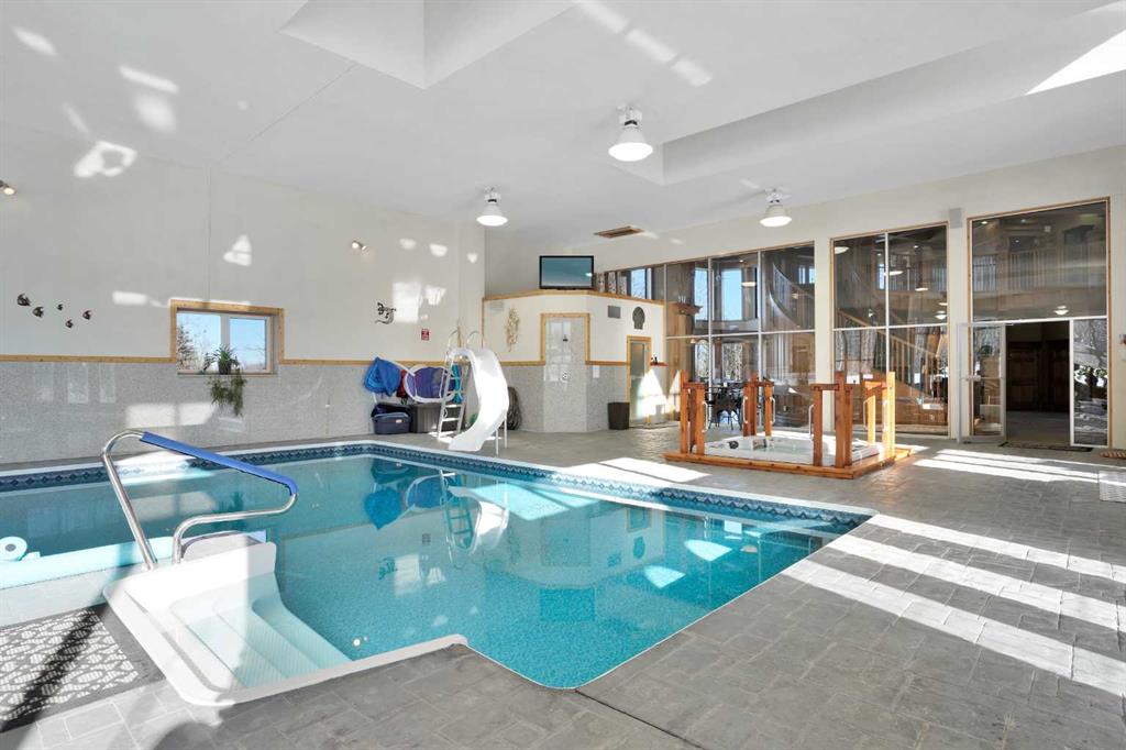 Nestled deep in the foothill, 45 minutes west of Calgary International airport, this completely custom-built masterpiece is a true work of art, designed for those who appreciate craftsmanship, privacy, and timeless beauty. The exterior is a testament to authentic, old-world craftsmanship, featuring hand-picked field stone sourced directly from the owner’s properties. The home hosts a level of craftsmanship rarely found today. Stepping inside, the grand foyer set the tone for the rest of the home. A vintage bronze fountain, meticulously built using porcelain, Alberta river rock, and Ammonites, adds an organic, artistic touch. The grand staircase, a structural and artistic masterpiece, was engineered for stability and handcrafted. An elevator, that services each floor. Through the main entrance is the stunning games room which is a true showpiece, A wine bar and custom full bar, complemented by a matching coffee bar and built-in window seats that double as discreet storage elevate the space. Off the games room is the indoor pool area which is a luxurious retreat. Whether you want to lounge in the warmth, swim at your leisure, soak in the hot tub , relax in the sauna, this space offers endless possibilities. At the heart of this home is a true “working” country kitchen, designed for multiple people to cook, prep, or gather. Conveniently located near the formal dining room and oversized pantry, it allows for providing both elegance and seamless functionality, while the spacious layout ensures effortless entertaining and everyday comfort. The basement level is a fully finished entertainer’s dream. Includes entertaining area with a 2 Pce bathroom and the theater room . The theater room is a dedicated cinematic retreat, featuring a custom-built permanent movie screen. Designed for peak sound retention, the entire space is fully insulated, ensuring an immersive experience. The main house includes 5 full bedrooms each with ensuites. The master suite is a private sanctuary, blending warmth, history, and comfort. A striking fireplace wall, handcrafted from solid oak, serves as a focal point, 2 walk-in closets and the private loft/turret. A hand-milled solid oak spiral staircase leads to this secluded space, which is bathed in natural light from multiple skylights. This loft offers a serene escape from the world below. An underground tunnel provides access between the lower agricultural level and the home. Three springs supply fresh, naturally sourced water straight from the property. A 3-bedroom suite above the garage and two apartments above the barn provide independent living space for staff, guests or family. The Upper Barn includes 9 Stalls, a wash bay & office perfect for an equestrian lifestyle. The original farmhouse & working barn yard adds to its functionality, charm and history. Every detail of this home has been carefully considered, combining expert craftsmanship, rare materials, and thoughtful design. This is more than a residence—it’s a true legacy property.