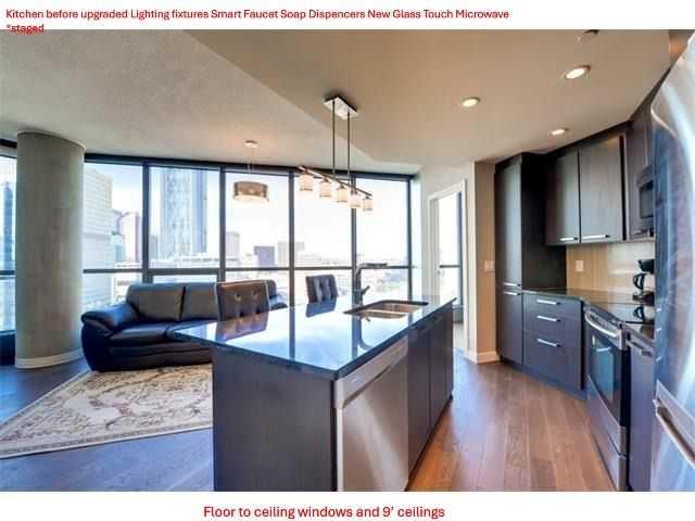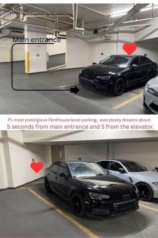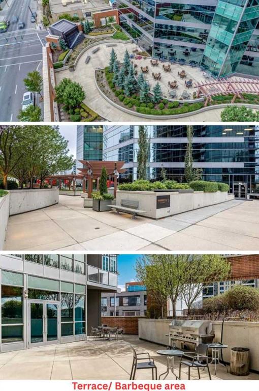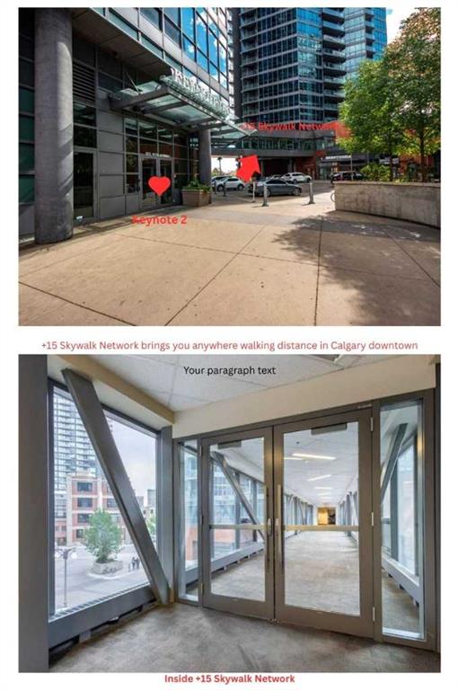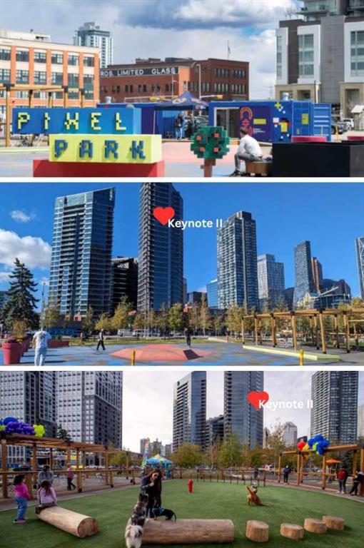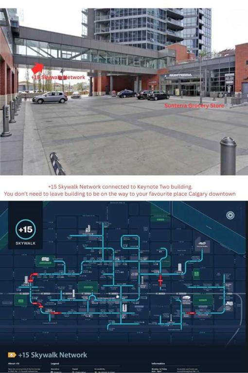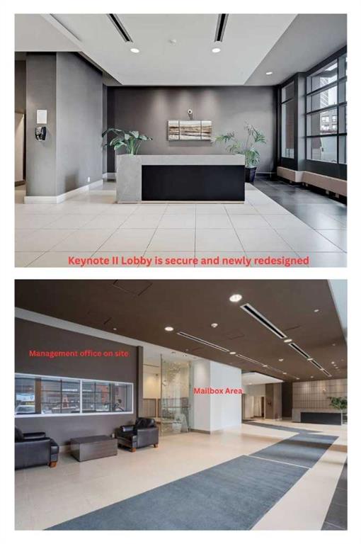 Click brochure link for more details. CALGARY TOWER VIEW, PENTHOUSE LEVEL PARKING, HIGH END, UPGRADED, GLASS FLOOR TO CEILING WRAP AROUD WINDOWS, CORNER unit (this not a typical 1 bedroom) in prestigious KEYNOTE 2 premier apartment residences, situated in the highly sought after downtown location of VICTORIA PARK and within the walk-zone to Calgary core amenities. This executive upgraded unit has the best PARKING on P1 level which will save 20-30 minutes every day to get to/from parkade while saving your car longevity not going over the parkade speed bumps and same level titled oversized storage. Unit offers exceptional privacy and tranquility compared to other buildings in downtown thanks to its ALL-CONCRETE construction, including shared walls. Its unique ALL-GLASS EXTERIOR sets it apart, making it a standout building in Calgary's skyline. The OPEN-CONCEPT LAYOUT is designed for comfort and style, this unit boasts 9' ceiling with WRAP AROUND FULL FLOOR TO CEILING WINDOWS with BLINDS at your fingertip to close/open at your convenience and enjoy spectacular views of Calgary Tower. It is well planned one bedroom walk-in/walk through closet, entrance/exit from both bedroom and bathroom, not like any other layouts and one full bath, ceiling-height kitchen with European cabinetry, GRANITE counter-tops, center island, engineered hardwood floors and “Samsung” stainless appliances. Enjoy the ease of in-suite laundry and the comfort of central AIR CONDITIONING, ensuring a perfect indoor climate year-round. This unit like no others has UPGRADES: P1/Level1 Parking right at the entrance of the parkade, oversized titled storage, “VOVO” smart toilet, smart touchless faucets in the kitchen and bathroom, rain shower, large, matte black sink in the bathroom, new modern lighting fixtures in the kitchen, living room and bathroom, “InSinkErator” Garbage Disposal, countertop soap dispenser, has professionally drilled hole in the countertop to install water filtration like Reverse Osmosis and a new “Samsung” Glass Touch LED microwave. The adjoining living room can accommodate full-size furniture and leads to the balcony where you can enjoy your morning coffee while watching the sun rise or sipping glass of wine watching lights of Calgary Tower in the evening. This air-conditioned complex has keyless main entry and a newly installed high security system. Keynote 2 boasts an array of exceptional amenities that cater to an active and social lifestyle. Stay fit in one of the 2 the state-of-the-art fitness centers or unwind in the owner's lounge complete with a large TV, pool table, kitchen and wet bar. Furnished guest suites, 24-hour security with surveillance cameras, and secured elevator access. The building also features a Plus-15 rooftop patio with outdoor space and BBQs, perfect for summer gatherings and relaxing with friends. Residents enjoy the convenience of full-time onsite management, secured elevator access, a guest room for visiting friends and family, two bike rooms.