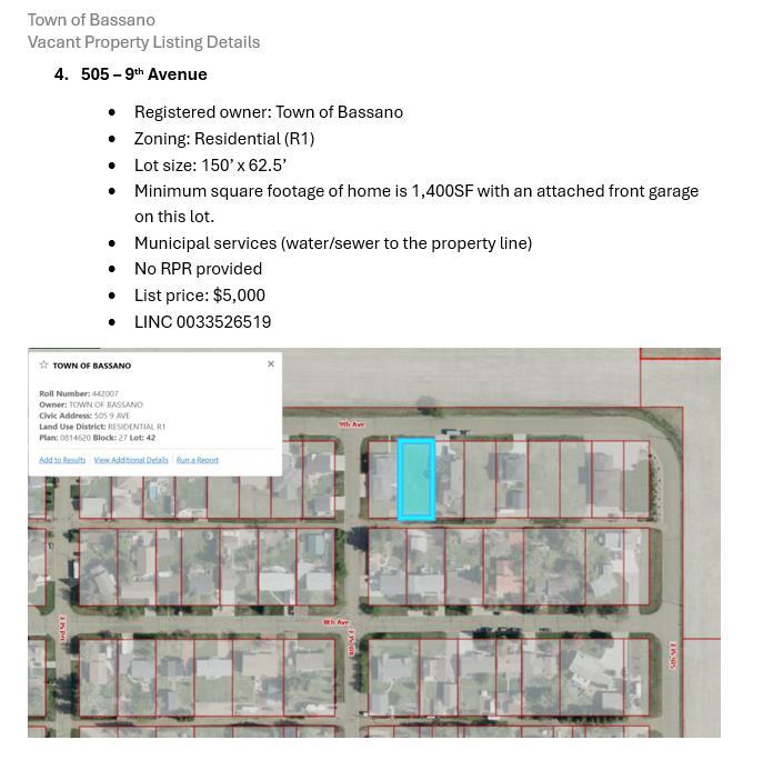 BEAUTIFUL BASSANO - Welcome to an incredible opportunity to build your dream home in vibrant Bassano! This prime lot has all town services conveniently run to the property line, ready for your vision. Enjoy Bassano’s charming community with an outdoor pool, local arena, parks, and a revitalized downtown. Buyers must submit a development permit application within 6 months of signing for a taxable improvement per LUB 921/21. There is also a build timeline requirement and minimum build size of 1400sqft with a front attached garage. Allowed property types include Prefab Homes and Stick Build. Mobile homes are NOT allowed. Call now to get more information as we have multiple lots available!