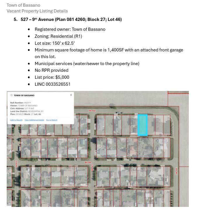BEAUTIFUL BASSANO - Welcome to an incredible opportunity to build your dream home in vibrant Bassano! This prime lot has all town services conveniently run to the property line, ready for your vision. Enjoy Bassano’s charming community with an outdoor pool, local arena, parks, and a revitalized downtown. Buyers must submit a development permit application within 6 months of signing for a taxable improvement per LUB 921/21. There is also a build timeline requirement and minimum build size of 1400sqft with a front attached garage. Allowed property types include Prefab Homes and Stick Build. Mobile homes are NOT allowed. Call now to get more information as we have multiple lots available!