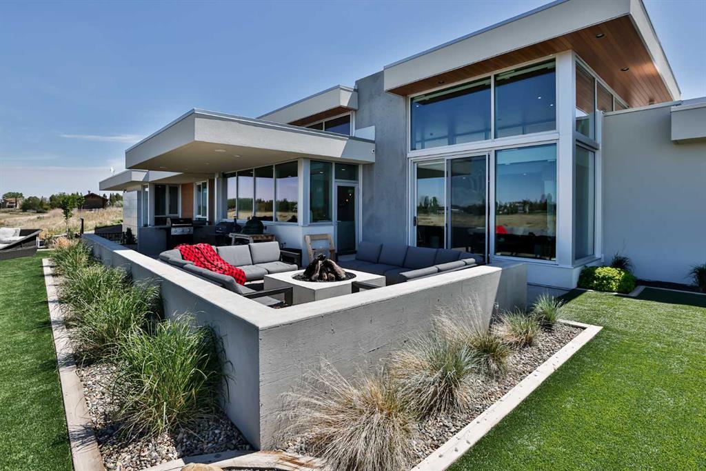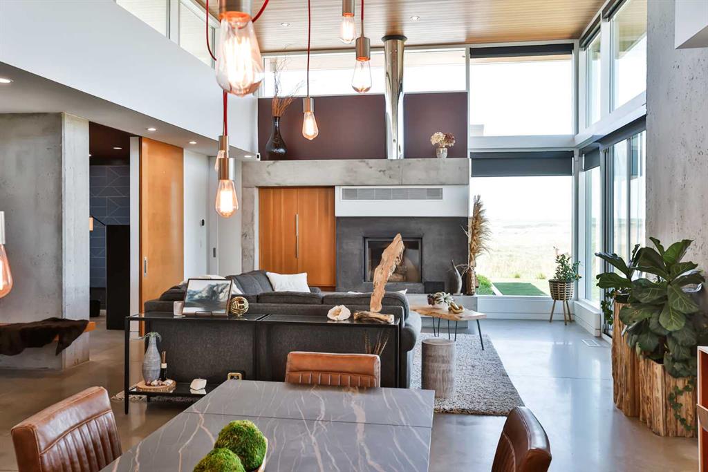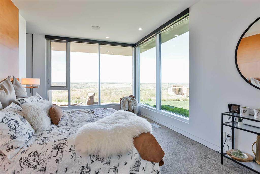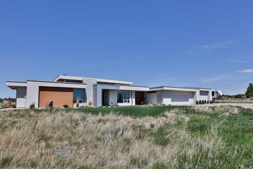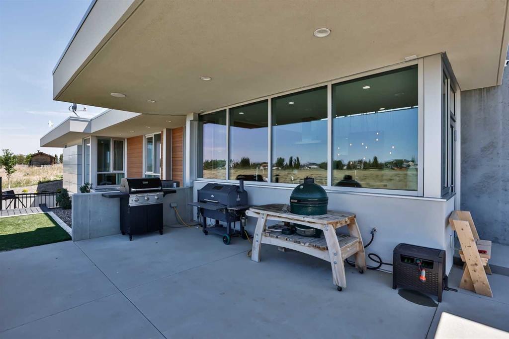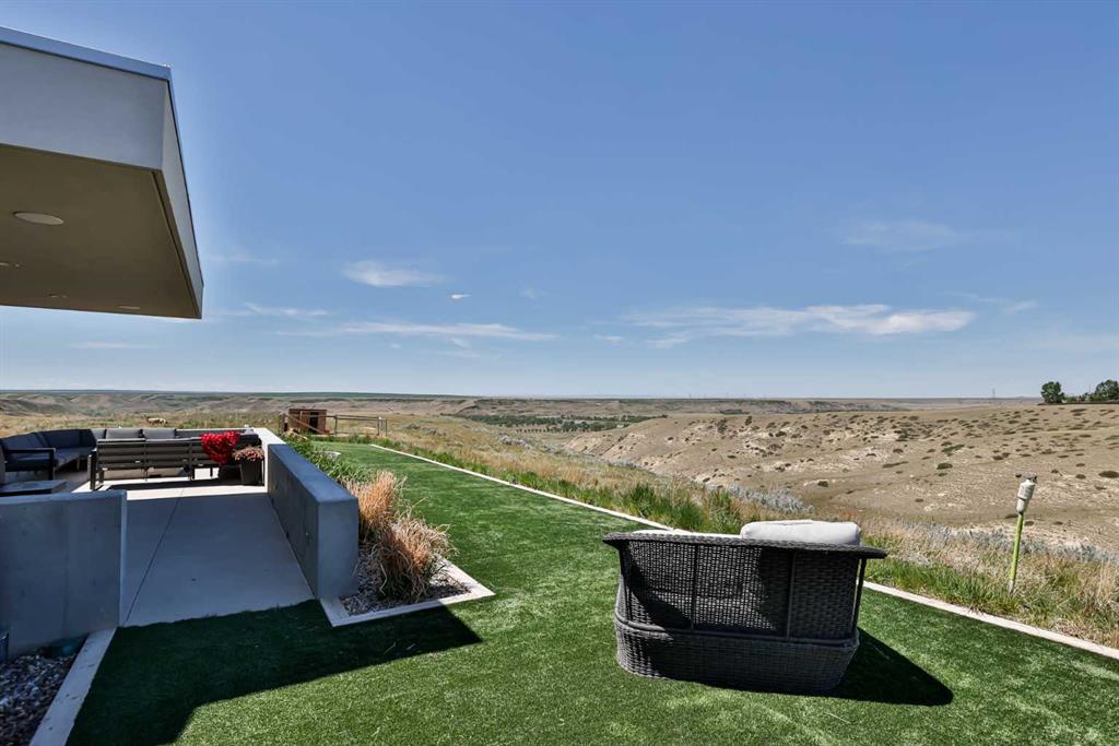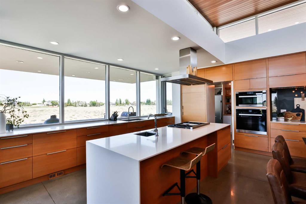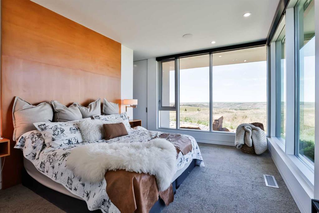 This property is as close to *Selling Sunset* as you'll find in Southern Alberta! This sprawling modern bungalow will capture your attention with the breathtaking view of the coulee in the distance. Stepping through the impressive wood pivot door, you know you're in for a treat. The main floor features 14-foot ceilings, complemented by floor-to-ceiling triple-pane commercial glass windows that will leave you speechless! The open-concept layout seamlessly combines the dining, living, and kitchen areas, with polished concrete floors being warmed by light wood cabinetry. The sleek white, quartz countertops, showcase your kitchen and island area, with windows that create a delightful connection between your indoor and outdoor spaces. The impressive appliance package, featuring a gas cooktop, a cabinet-paneled oversized fridge, a built-in microwave and oven, and a wine fridge. A coffee lover's dream, a built-in Miele espresso machine rivals even the best cafés. A cleverly hidden pantry door adds an extra touch of seamlessness! The living room is anchored by an oversized wood-burning fireplace, transom windows fill the space with natural light. There is an office with stylish floating shelves sits off of the Living room. The primary suite, features floor-to-ceiling windows that wrap the corner, providing spectacular morning & sunset views right from your bed. The walk-around closet is a shopper's dream, while the bright and airy ensuite features double vanities and a luxurious steam shower. Off the kitchen lies a spacious laundry/all-purpose room perfect for sewing or supervising homework while you prepare dinner. In the east wing, you’ll find three spare bedrooms. One has its own ensuite bathroom, while the other two share a Jack and Jill bathroom with a beautifully tiled shower, double vanities, and a skylight that invites natural light. Continuing down the hallway, another floor-to-ceiling glass panel reveals your very own gymnasium, measuring an impressive 32 x 40 feet with 20-foot ceilings, complete with built-in basketball hoops, pickleball court & 3 wide closet for organizing all your sports gear. Floating wood stairs with striking black railings lead you to the basement living room, perfect for movie nights, and entertaining with your side bar. With large windows typical of a walkout basement, this space feels open and bright, completed by a half bath. Outside the gym exit, is a newly installed large sunken patio that blends with the home’s aesthetic. Complete with double gas fireplaces, a pergola, and oversized hot tub. The main patio off the kitchen features a covered deck, built-in speakers, a gas fire pit, and views that are unmatched in all of Southern Alberta. Equipped with cutting-edge technology, most lights, blinds, heating, cooling, and music can be controlled via a control panel or your phone—an upgrade valued at $100,000! The home also offers both forced air and indulgent in-floor heating. Call your REALTOR® for a private viewing today!