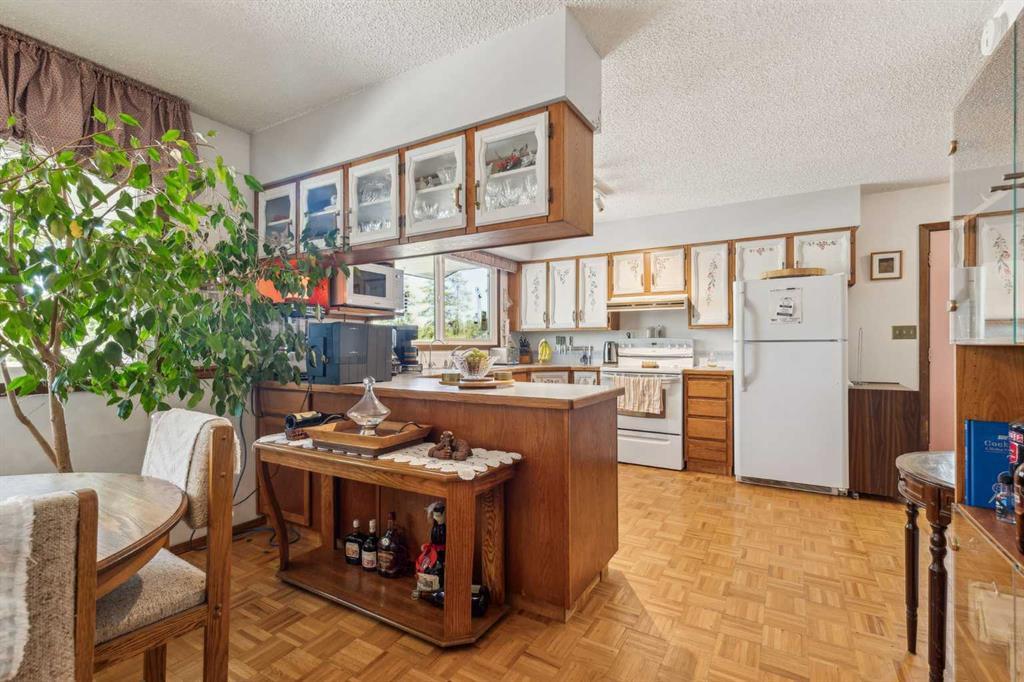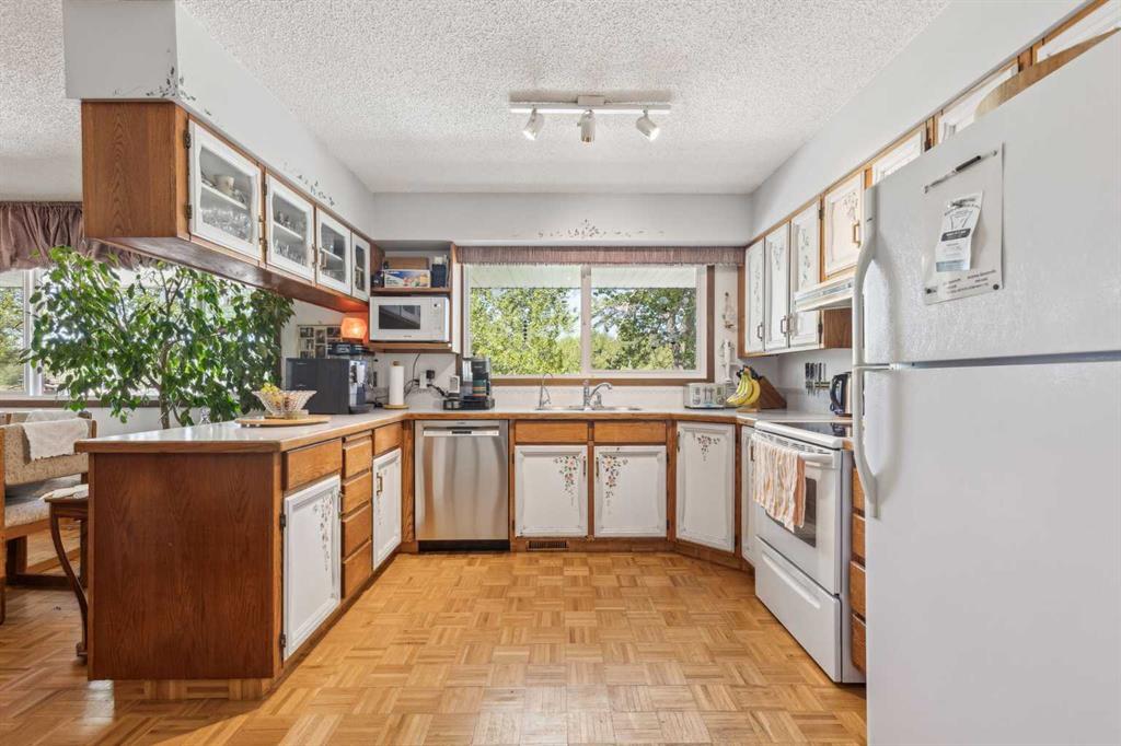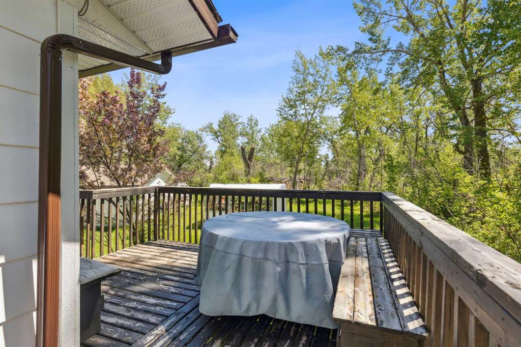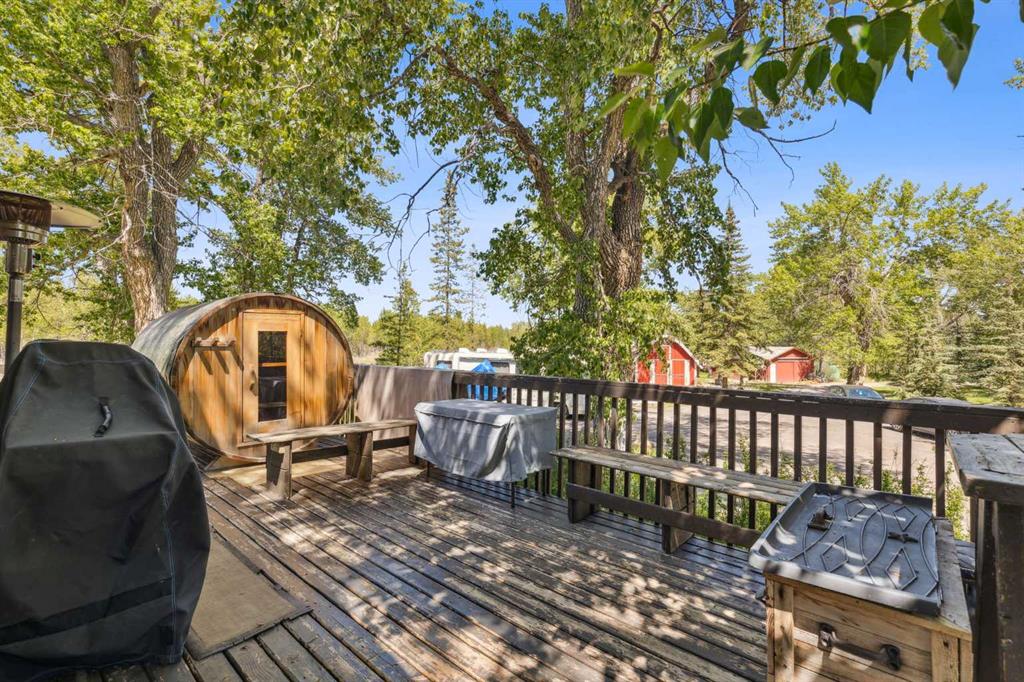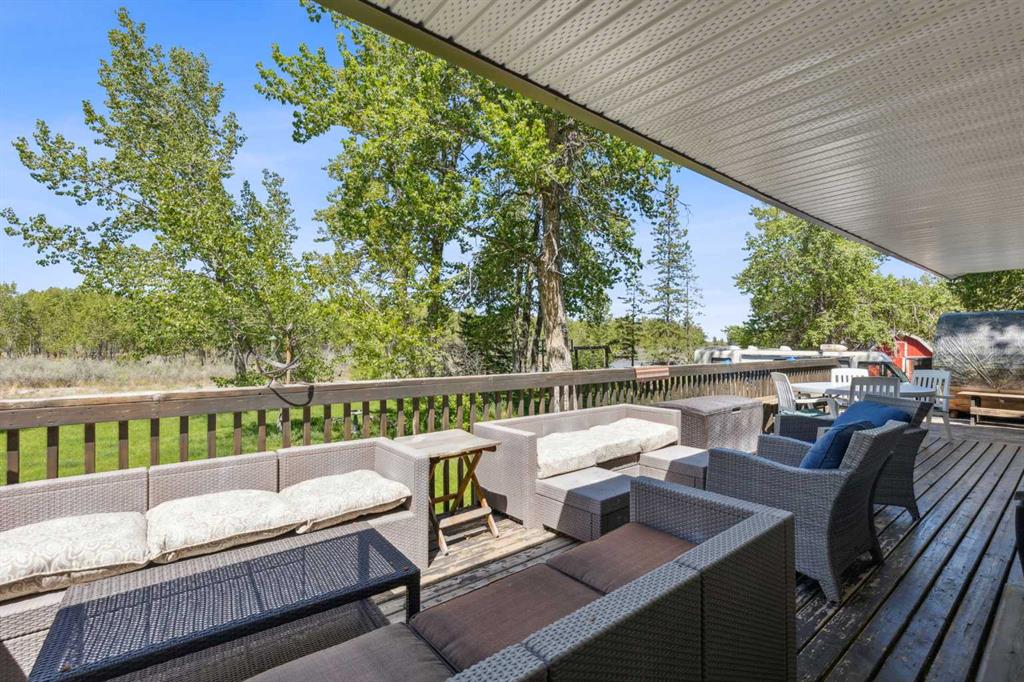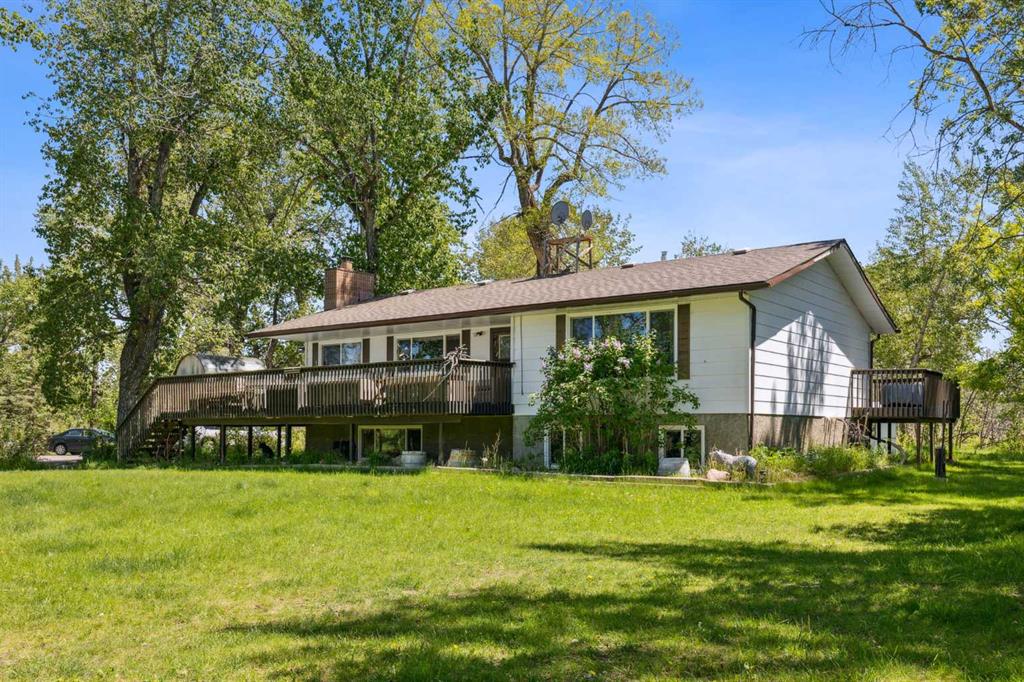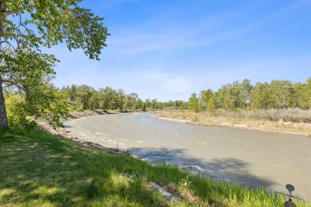 Discover the perfect blend of tranquility and recreation just outside of town with this exceptional property, set on 10 beautifully staked acres with 1,200 feet of private riverbank. This unique retreat offers year-round serenity and a wealth of outdoor activities, including swimming, snorkeling, tubing, and canoeing in the summer, as well as snowshoeing in the winter.The property sits 18 feet above the flood barrier berm in SW High River, ensuring safety and peace of mind. The basement experienced about 3 feet of water and river mud in 2013, but it was fully remediated, making it ready for your personal touch. The main house is a charming raised bungalow featuring 1,385 sq ft of comfortable living space, including 3 bedrooms and 1.5 bathrooms. It boasts an original kitchen with updated appliances, new windows, and a spacious living area. Step through the dining room access door onto a massive 1,300 sq ft deck, designed for relaxation while you listen to the soothing sounds of the river and the gentle rustle of trees. Unwind in the inviting cedar sauna, perfect for enjoying after a long day. Recent updates include new soffits and eavestroughs, replaced in 2022. Embrace the bounty of nature with chokecherry trees, saskatoon berries, raspberry bushes, a pear tree, an apple tree, ornamental cherries, and rhubarb flourishing on the property. The greenhouse, complete with blueberries, strawberries and edible cherries, and the garden is currently thriving with potatoes, chives, and asparagus. Additional features include a detached double garage next to the house, a small workshop behind the garage, and a larger 22.11'x22.11' shop with electricity. The owner has taken tremendous care and maintenance to riprap the riverbank to create stability and security. He planted willows as well to further stabilize the soil. This property is truly one-of-a-kind! Although you sit on the outside of town within 5-10 minutes you have access to the hospital, grocery stores, banking and anything else you need. Schedule a showing today to experience the beauty and potential for yourself!
