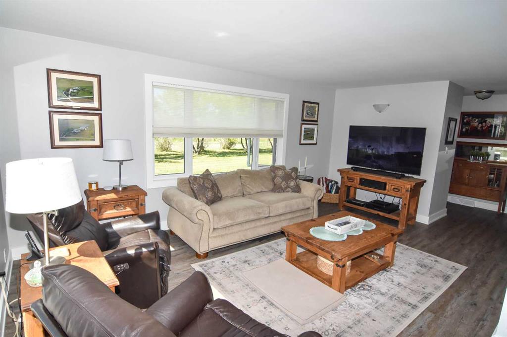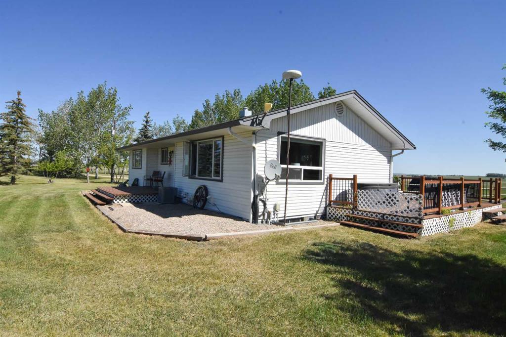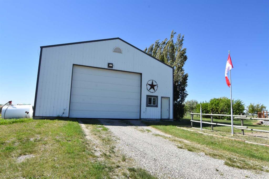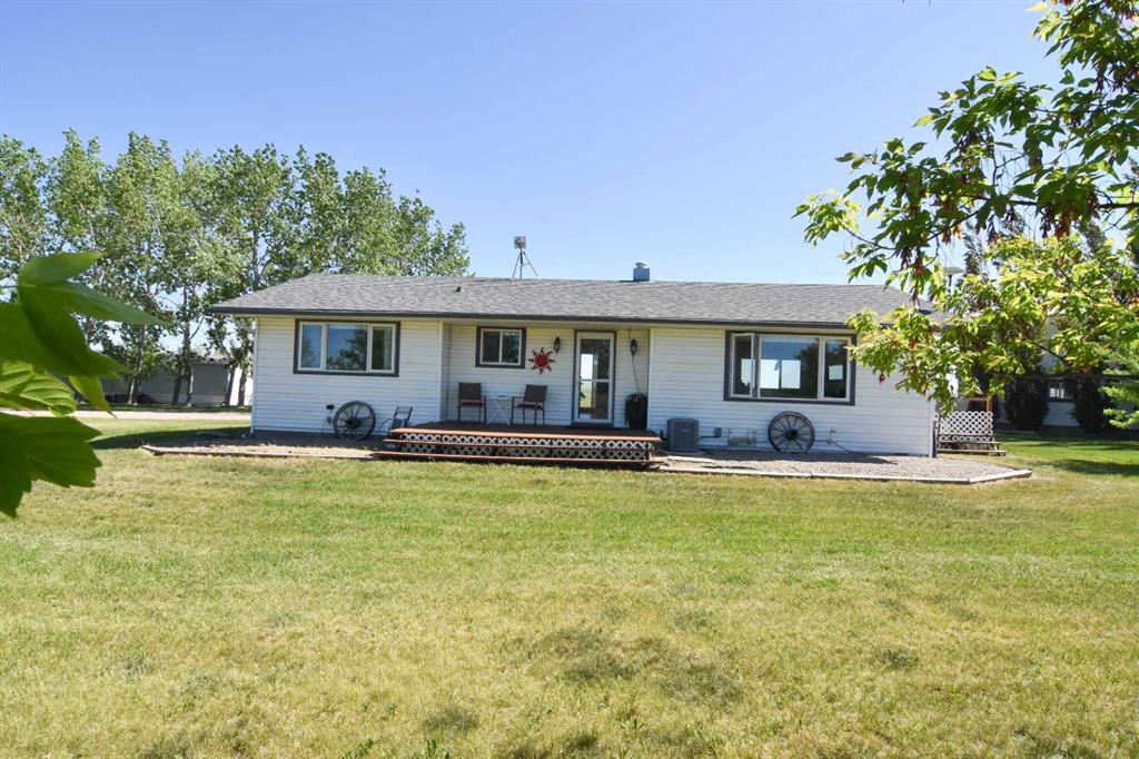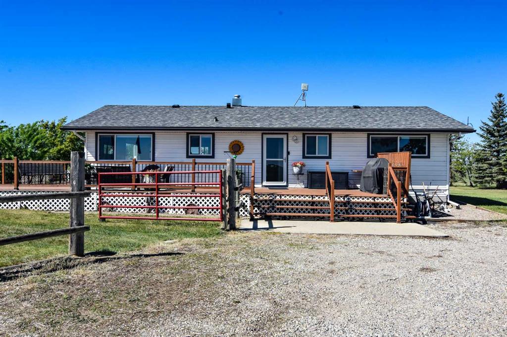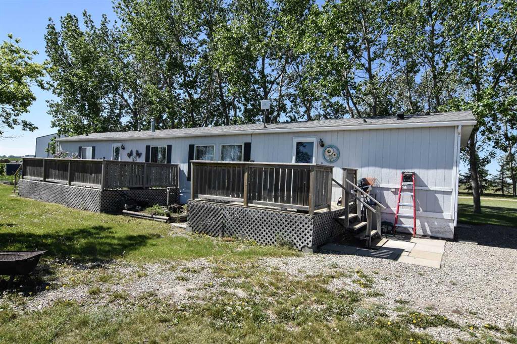 DISCLOSURE: The five bedrooms and three bathrooms are shared between both homes. See RMS in the Documents Tab for floor plans and measurements of both homes: The main home has two bedrooms and one bathroom (plus one roughed-in bathroom in the basement). The modular home has three bedrooms and two bathrooms TWO-HOME ACREAGE WITH A LARGE SHOP, 10-MINS NE OF STRATHMORE. This 12.2-acre, well-treed, cross-fenced property features not one, but two homes and is ideal for horse lovers, with five rail-fenced pastures, two shelters, and two automatic stock waterers. Each home has its own private driveway with large trees separating the two homes for privacy, log gate entry. The main home is a recently renovated 2-bedroom, 1-bath bungalow with a bright open-concept kitchen/living/dining layout, featuring quartz countertops, stainless steel appliances (gas stove). The white custom kitchen cabinetry offers loads of storage with soft-close cupboards/drawers/pantry. Large windows allow for plenty of natural light. All main floor windows have remote open/close Hunter Douglas blinds. The basement has loads of potential, including a roughed-in bathroom. New central air (2025). Septic tank and furnace replaced (2024). Well pump replaced (2023). Main home has two decks (one large wrap-around deck in back and one smaller deck out front). Roof re-shingled (2021). The second home is a 3-bedroom, 2 full-bath modular home, perfect for rental income/mortgage helper OR making this a two-family property. Open-concept kitchen/living/dining layout. Includes fridge/stove/DW/WD and upright freezer. New hot water tank (2024).Roof re- shingled (2021). The modular home has three decks and a shed for additional storage or workshop. The large 40 x 80 x 20 shop has two 14-foot overhead doors and two man-doors. The shop sits on cement pony walls and is roughed-in with plumbing for water/sewer. The shop also has a 30-amp RV plug-in, numerous overhead lights and plenty of electrical outlets. Lightning protection is installed on the roof. Beside the shop are two sheds and a hitching post, ideal for a tack room or convert one shed to a chicken coop.