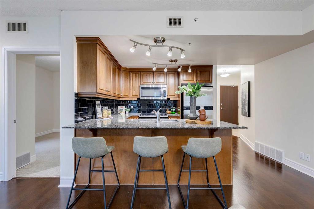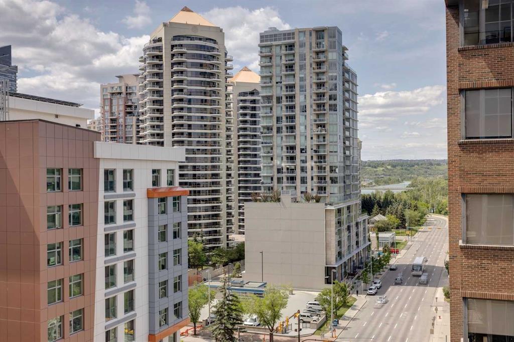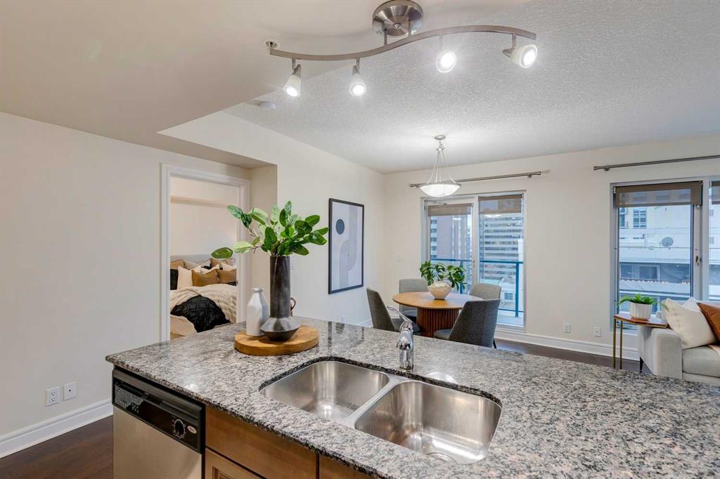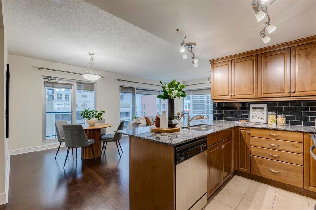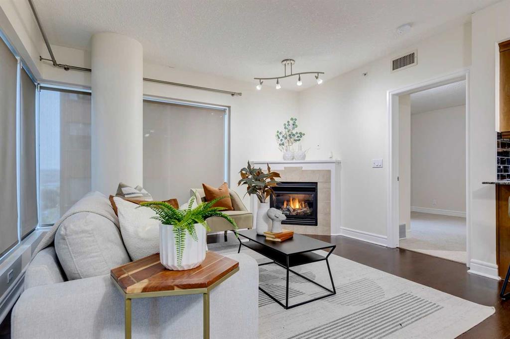 Bright + stylish corner unit in popular building + with expansive urban views; this 2 bedroom 2 bathroom unit has recently been freshly painted + move in ready. The layout offers comfort, style + convenience. Gleaming hardwood flooring + an abundance of natural light throughout. The spacious living area is highlighted by a cozy corner fireplace and large windows that showcase urban views and westerly sun—creating a warm, inviting atmosphere all day long. The spacious kitchen provides ample counter + cabinet space + seamlessly connects to the dining and living areas, making it ideal for both everyday living and entertaining. The well-designed floor plan ensures privacy, with well-separated bedrooms including a primary suite with a walk-in closet and private 3-piece en-suite, and a second bedroom with its own discrete ensuite access—perfect for guests, roommates, or a home office. In suite laundry room with extra storage, underground parking + secure storage unit, bicycle storage, car wash, party room + roof top deck as well as a very friendly concierge service in the welcoming lobby. This pet friendly building is steps from an off leash park, close to the river + trendy restaurants, cafes + shopping. Flexible possession + very easy to show. A wonderful walkable property in excellent location.