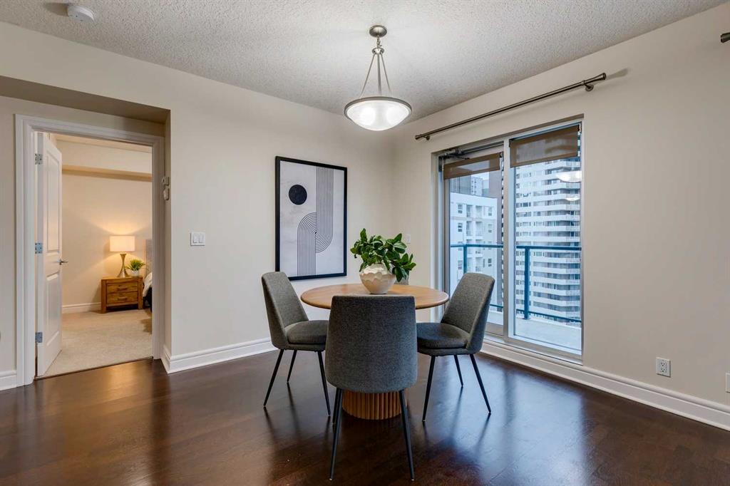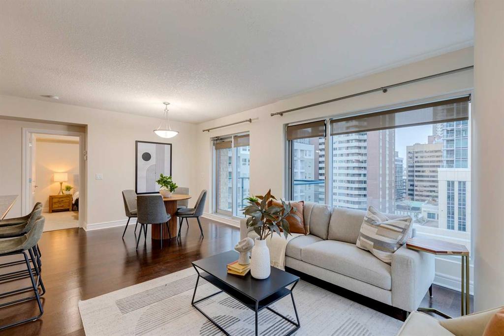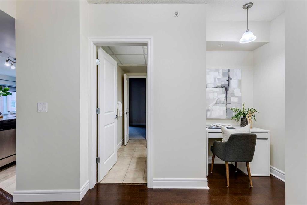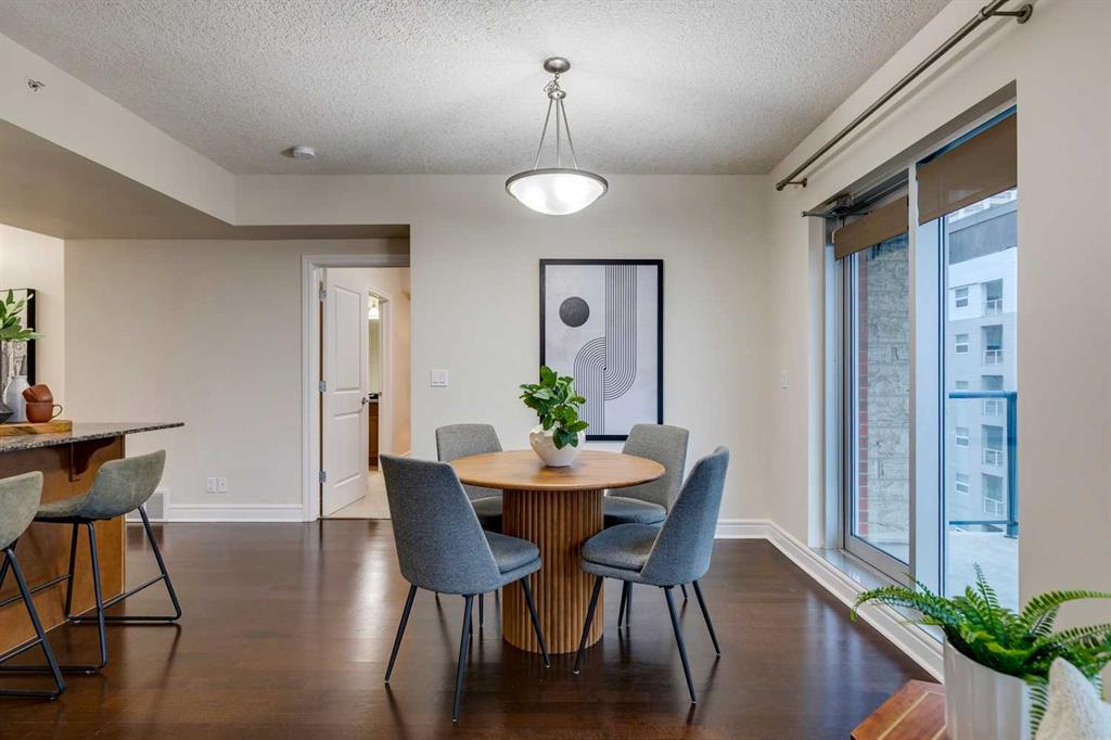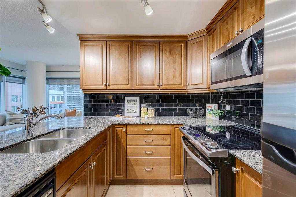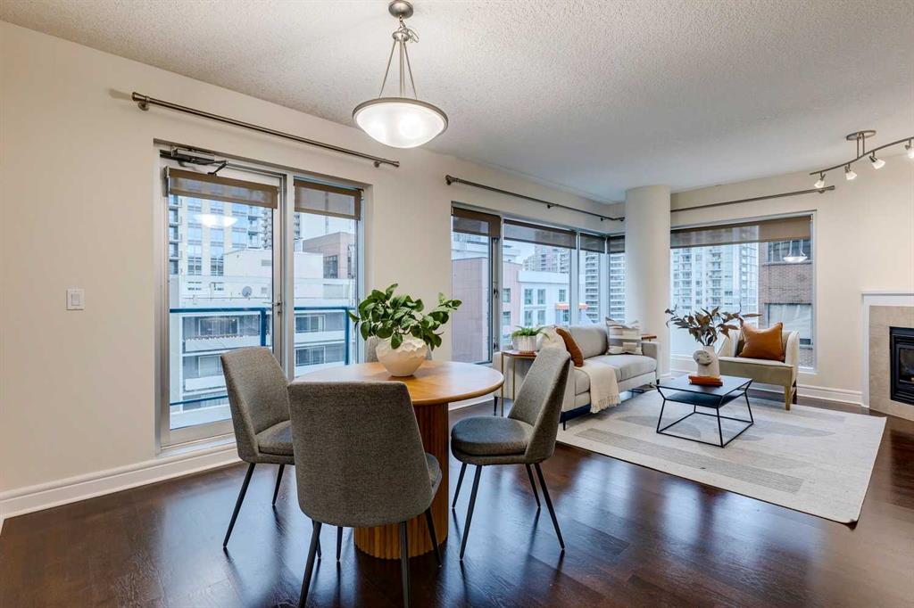 Bright + stylish corner unit in popular building + with expansive urban views; this 2 bedroom 2 bathroom unit has recently been freshly painted + move in ready. The layout offers comfort, style + convenience. Gleaming hardwood flooring + an abundance of natural light throughout. The spacious living area is highlighted by a cozy corner fireplace and large windows that showcase urban views and westerly sun—creating a warm, inviting atmosphere all day long. The spacious kitchen provides ample counter + cabinet space + seamlessly connects to the dining and living areas, making it ideal for both everyday living and entertaining. The well-designed floor plan ensures privacy, with well-separated bedrooms including a primary suite with a walk-in closet and private 3-piece en-suite, and a second bedroom with its own discrete ensuite access—perfect for guests, roommates, or a home office. In suite laundry room with extra storage, underground parking + secure storage unit, bicycle storage, car wash, party room + roof top deck as well as a very friendly concierge service in the welcoming lobby. This pet friendly building is steps from an off leash park, close to the river + trendy restaurants, cafes + shopping. Flexible possession + very easy to show. A wonderful walkable property in excellent location.