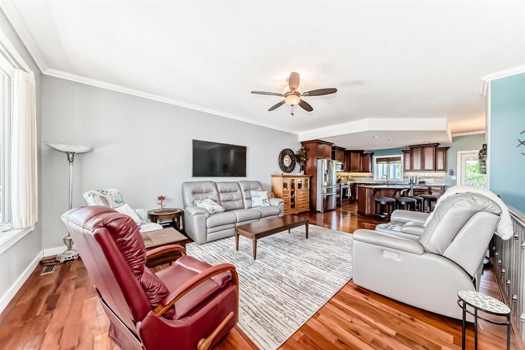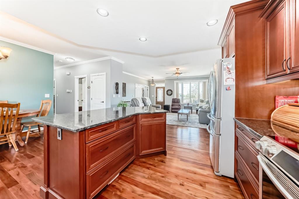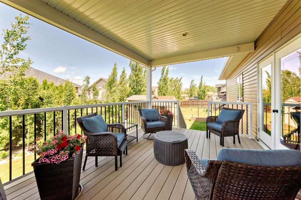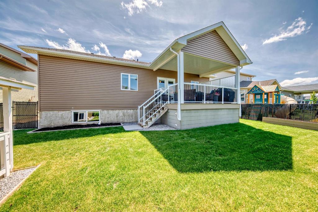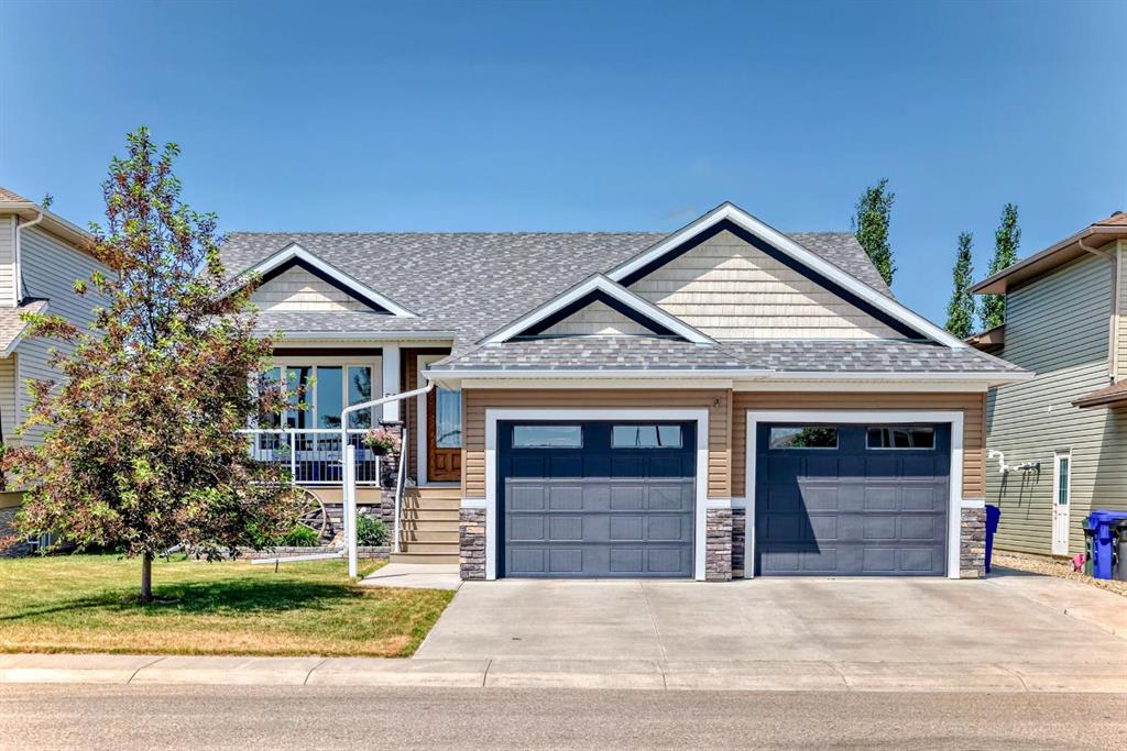 Gorgeous Bungalow on Winter Drive In the Town of Olds. This beautifully maintained home offers the perfect blend of style, space, and comfort. The bright, open entry leads to a functional mudroom/laundry area and an 25 x 26 sq.ft attached double garage. The open-concept main floor is ideal for entertaining, featuring a cozy living room with clear sight lines to the kitchen and dining area. The kitchen is a chef’s dream with stainless steel appliances, granite countertops, large center island with eating bar, rich mocha cabinetry and ample counter space. French doors off the dining area open to a spacious covered deck—perfect for year-round enjoyment. The main level includes a 4 pce bathroom, a versatile bedroom or office and a generous primary suite with a walk-in closet and 5 pce ensuite featuring double vanity, jetted tub and separate shower. The fully finished basement boasts a large family room with custom built-in shelving, fireplace, a wet bar, two additional bedrooms and another 4 pce bathroom. Enjoy in-floor heating during the colder months and central A/C in the summer. The fully fenced and landscaped yard includes a garden shed and a large covered deck. Located in a quiet, family-friendly neighborhood close to schools, shopping, and walking paths. Book your private showing today!!