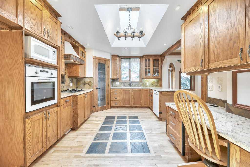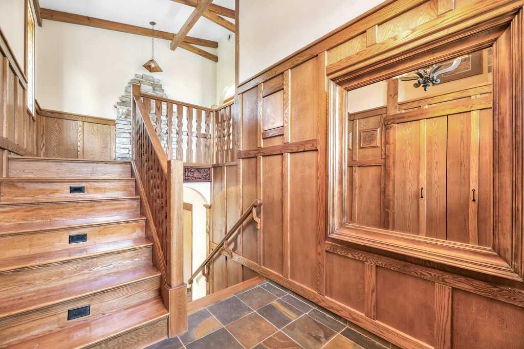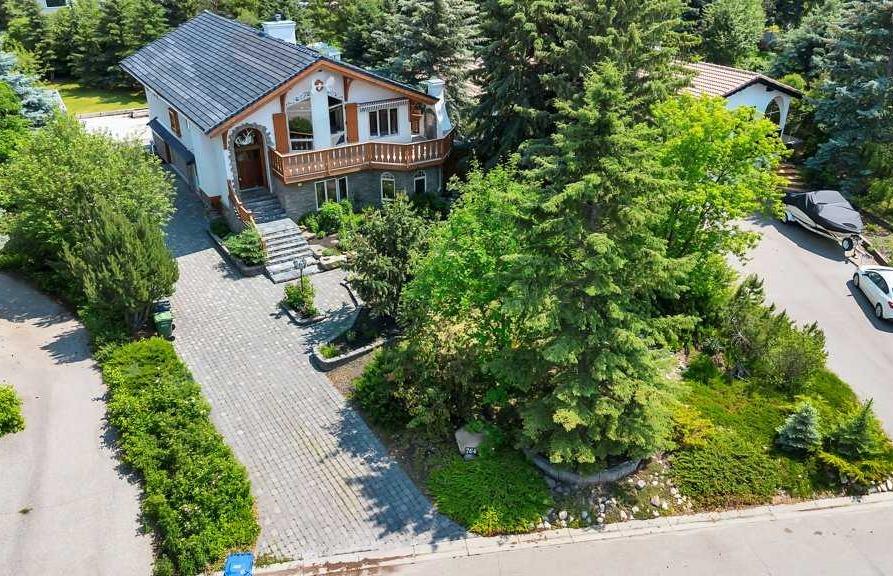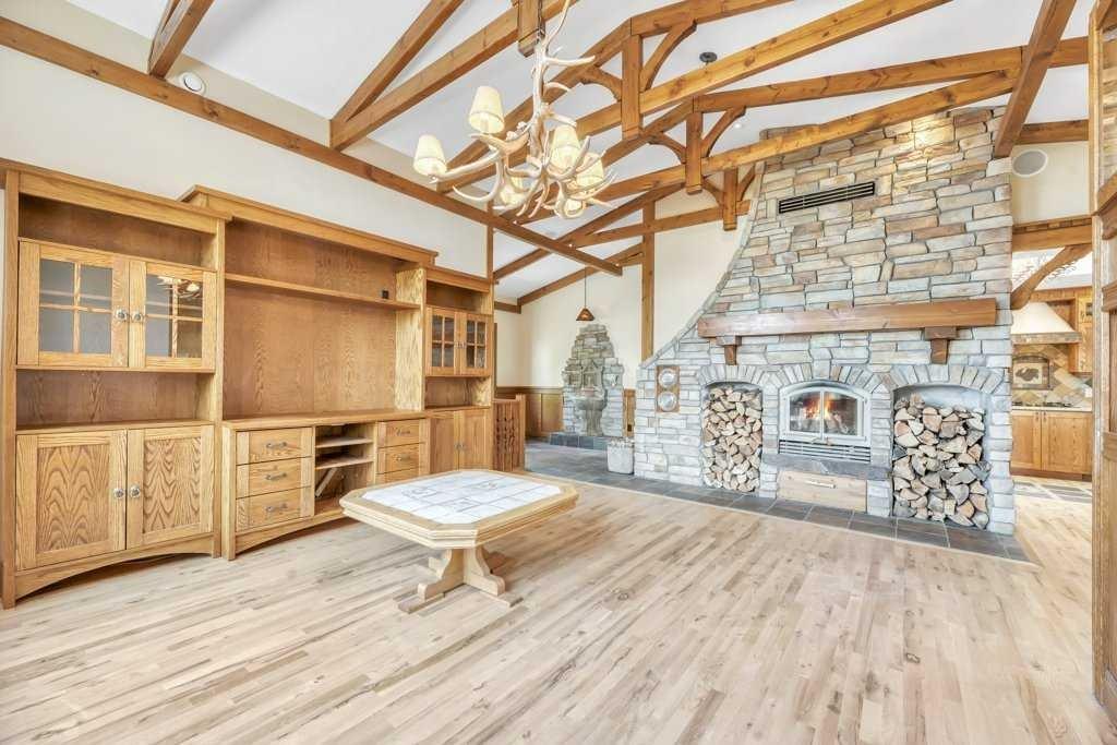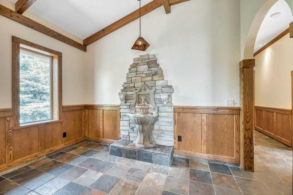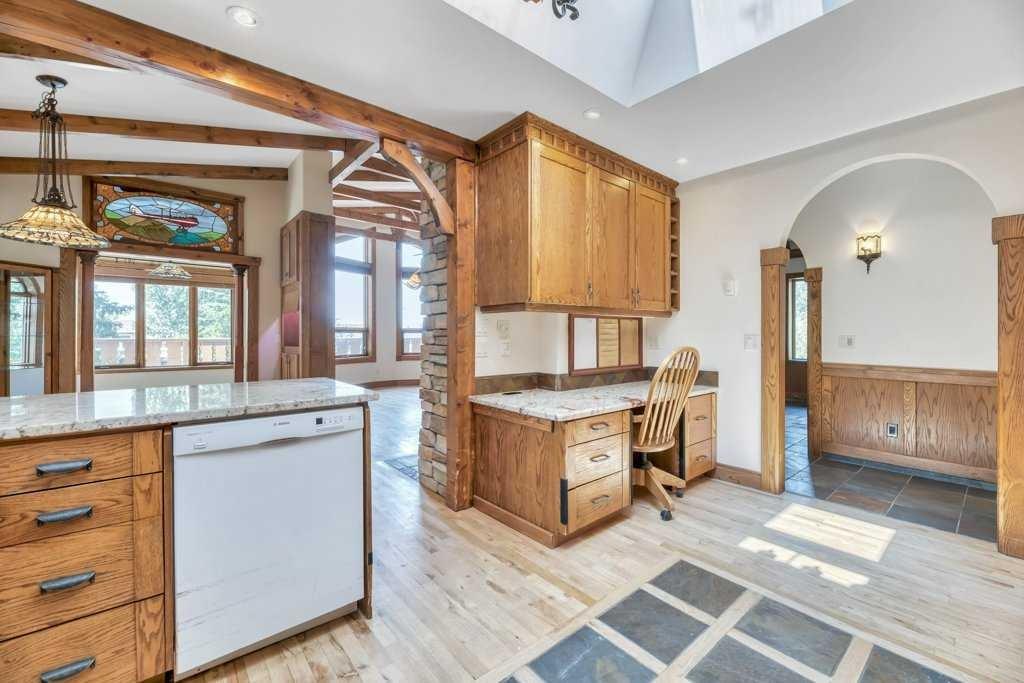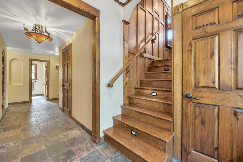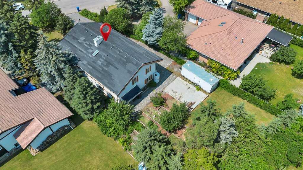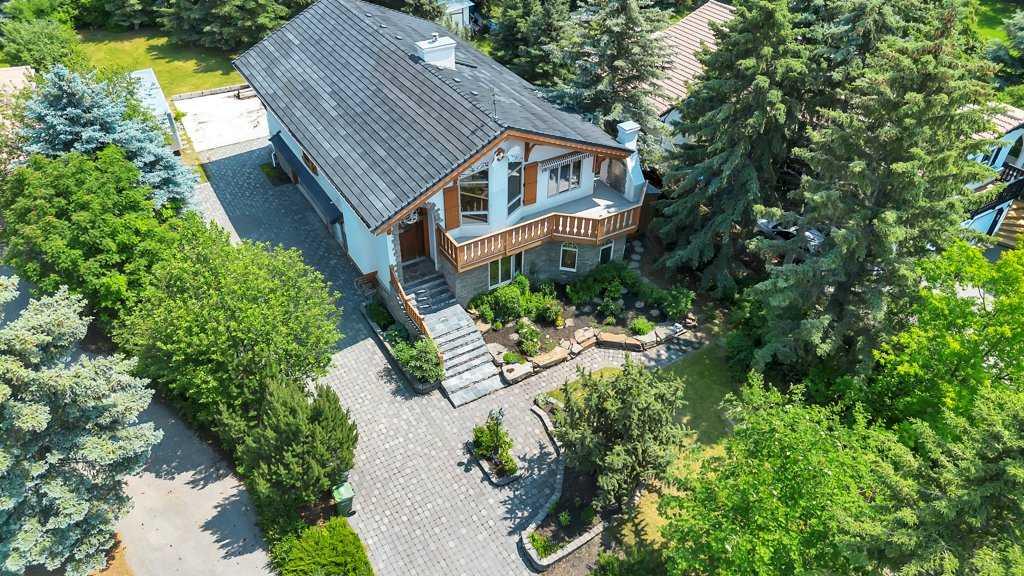 Nestled on a beautifully landscaped 1/3 acre lot adorned with mature trees, this German-inspired masterpiece offers timeless character & thoughtful design at every turn. Across the street from the lake, this one-of-a-kind home boasts stunning curb appeal with lush garden areas, complemented by abundant off-street parking & an additional poured parking pad with roughed-in in-floor heating — ready for a future garage. Inside, you're greeted by intricate custom woodwork, hand-carved detailing, slate flooring, cozy in-floor heating throughout both levels of the home & a custom front-entry fountain. The roof features tiles with a remarkable 50-year lifespan, ensuring peace of mind for years to come. As you ascend to the main level, be captivated by soaring vaulted ceilings with exposed wood beams, stained-glass accents & expansive west-facing windows that fill the space with natural light. The open-concept living & dining area centers around a charming wood-burning fireplace & beautifully crafted built-in cabinetry, blending comfort with artisan craftsmanship. Just off the dining area, a bonus room awaits — ideal as a reading nook, plant retreat, or serene home office. Step out onto the large west-facing deck to enjoy the built-in pizza oven, retractable awning & even a dumbwaiter to easily transport firewood from the ground level. The entire home has ample storage — cleverly built above the closets & on the sides of fireplaces. The kitchen is a chef’s delight, with ample prep space, a gas cooktop, built-in work station and a skylight for added light. There are 2 bedrooms on the main level feature soaring custom wood ceilings, with the primary suite offering his-and-hers closets, a cozy electric fireplace, dual window seats, and a luxurious five-piece ensuite. A convenient main floor laundry room with even more storage & a workspace as well as a stylish three-piece bathroom complete the main level. Downstairs, the lower level offers incredible flexibility, including a spacious cold room, 2 separate grade-level entrances, and two more bedrooms — each with distinctive features. One bedroom includes a mini bar, another boasts a kitchenette, open beam ceilings, electric fireplace, & walk-in closet (with a window) with space for a private office. The third versatile room could easily serve as a secondary kitchen or home office, with its own entrance & sink. A 3-piece bathroom rounds out this impressive lower level. The oversized, heated garage (19'9" x 27'5") includes an integrated workshop & abundant storage options. With instant hot water, quality finishes throughout, & exceptional attention to detail, this home offers a rare combination of craftsmanship, functionality & warmth — a true lakeside gem unlike any other.