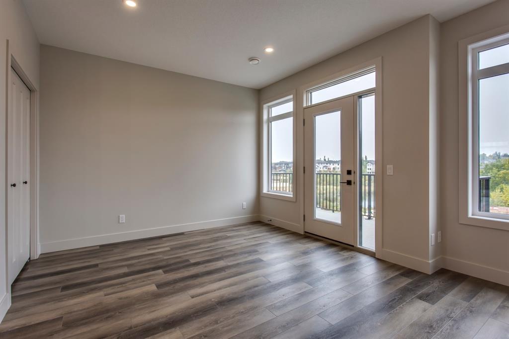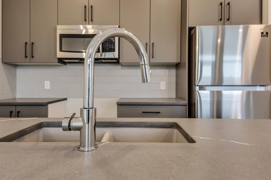 Ravines of Royal Oak by Janssen Homes offers unmatched quality & design, located on the most scenic & tranquil of sites in the mature NW community of Royal Oak. This 2BR, 1-full bath 1,167sf (1,167RMS) 24’-wide stacked townhouse with single attached garage boasts superior finishings. Open-concept-plan features a fresh, modern kitchen with full-height cabinets, soft close doors/drawers & full extension glides, quartz counters, undermount sink, plus 4 S/S appliances & convenient peninsula island opening onto both dining area with access to rear balcony & spacious living room. With over 900sf on the main living level there is ample space for a roomy master retreat, 4-pce bath with tile floor & quartz vanity, an additional bedroom which can be used as an office, & ultra-convenient laundry area. Single attached garage with room to park an extra car on front driveway completes the package. Ravines of Royal Oak goes far beyond typical townhome offerings; special attention has been paid to utilizing high quality, maintenance free, materials to ensure long-term, worry-free living. Acrylic stucco with underlying 'Rainscreen' protection, stone, & Sagiwall vertical planks (ultra-premium European siding) ensure not only that the project will be one of the most beautiful in the city, but that it will stand the test of time with low maintenance costs. Other premium features include triple-pane, argon filled low-e, aluminum clad windows, premium grade cabinetry with quartz countertops throughout, 9' wall height on all levels, premium Torlys LV Plank flooring, 80-gal hot water tank, a fully insulated & drywalled attached garage that includes a hose bib & smart WiFi door opener, among other features. Condo fees include building insurance, exterior building maintenance & long-term reserve/replacement fund, road & driveway maint., landscaping maint., driveway & sidewalk snow removal, landscaping irrigation, street & pathway lighting, garbage/recycling/organics service. Bordered by ponds, natural ravine park, walking paths & only minutes to LRT station, K-9 schools, YMCA & 4 major shopping centres. Note - photos from a similar model in the complex.