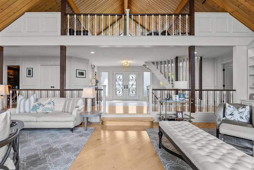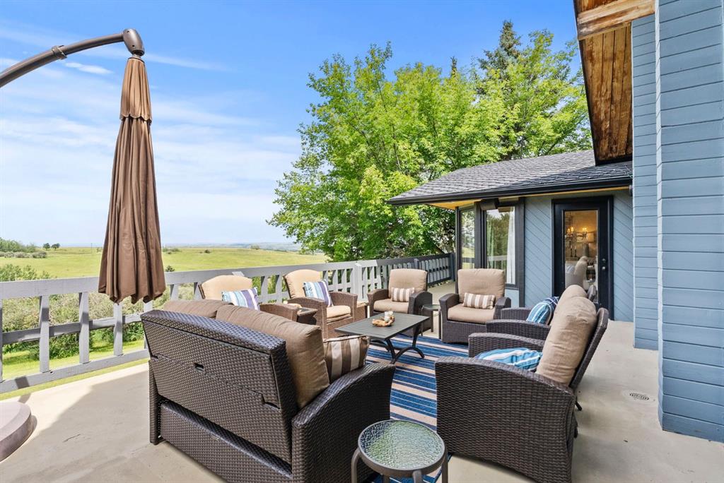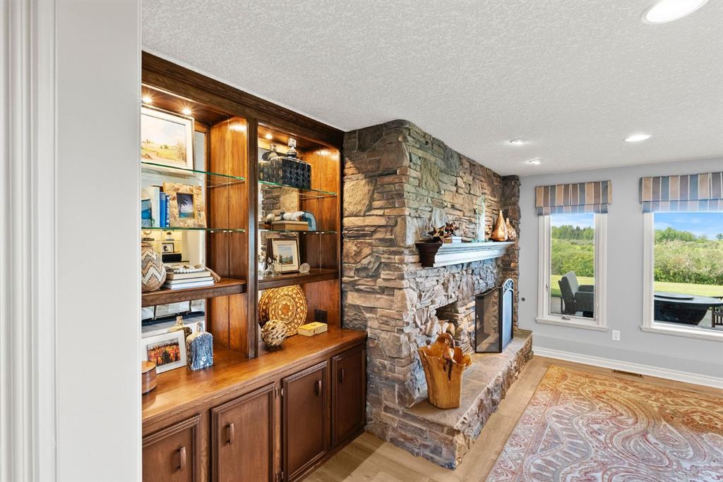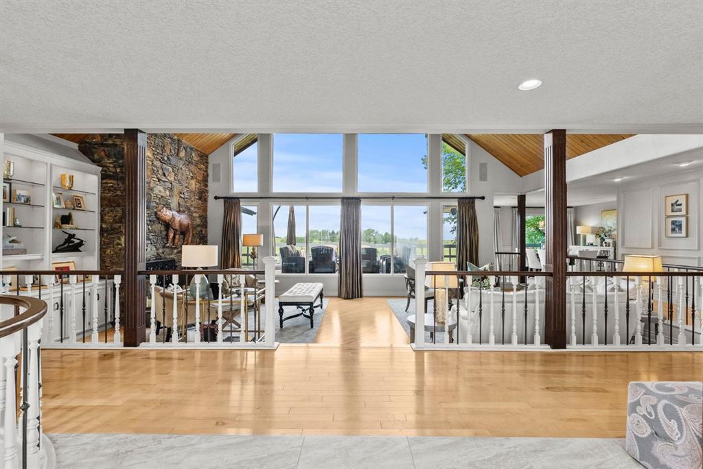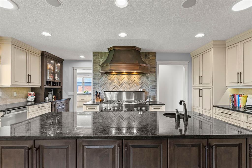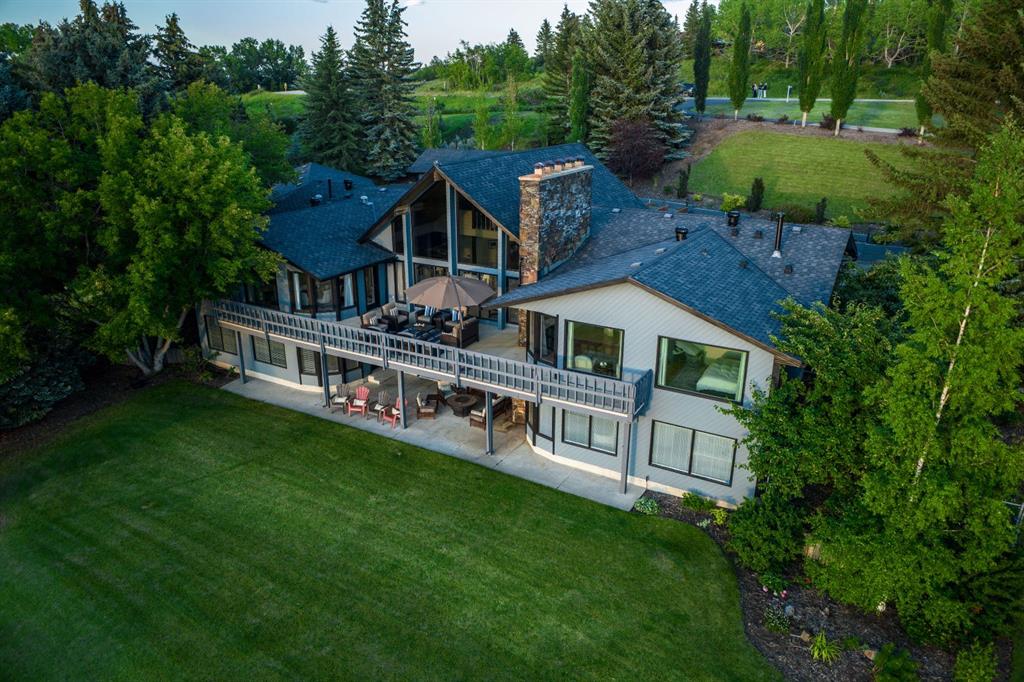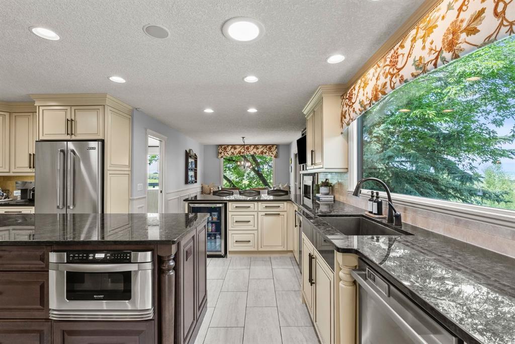 A truly distinctive offering in the prestigious enclave of Artists View West, where homes rarely come to market. This architecturally distinctive, mid-century inspired hillside bungalow is anything but cookie-cutter, blending timeless character with thoughtful modern renovations. Offering over 7,800 sq ft of finished living space, a full walkout basement, and panoramic mountain views, this home delivers exceptional scale, charm, and privacy—just minutes from Calgary’s west edge. Solidly and securely constructed by the well-known Peters Brothers Construction, the home reflects a level of craftsmanship and build quality that continues to stand the test of time. The main level showcases 22’ cedar ceilings, expansive picture windows, rich custom woodwork, and a dramatic stone wood-burning fireplace—hallmarks of enduring construction paired with modern comfort. The chef’s kitchen features high-end appliances, granite countertops, a large island with seating, custom cabinetry, and a statement copper range hood, opening to a breakfast nook with built-in banquette and fireplace. A formal dining room connects directly to an outdoor patio dining area designed to capture sweeping mountain vistas and sunsets. The layout is ideally suited for large families or multigenerational living, with a spacious main-floor bedroom wing and a private lower level offering flexible living arrangements. The primary suite includes a fireplace, spa-inspired ensuite with in-floor heating, and a generous walk-in closet. Two additional large bedrooms, a private office with coffered ceilings, an upper loft, and a spacious laundry/mudroom with custom cabinetry complete the main floor. The fully finished walkout basement further enhances the home’s versatility, featuring a nanny or in-law suite with private living area and ensuite, along with a large recreation room, bar/kitchenette, multiple family spaces, an additional wood-burning fireplace, steam shower, and extensive custom storage. Two dedicated mechanical rooms house 3 furnaces, 2 A/C units, and 4 hot water tanks, providing infrastructure capacity well suited to a larger household. Additional highlights include two separate 3-car garages—one attached and one detached, Armour shake shingles, sound-reducing insulation, paved driveway, fully fenced chain-link yard, underground irrigation system, mature landscaping, integrated security system, and multiple private outdoor living areas. Water service is via a co-op system (not city water). Ideally located 5 minutes to Highway 1 and Stoney Trail, approximately 20 minutes to downtown, Foothills Hospital, and the University, and under an hour to Canmore and Banff. Close to top public and private schools, city amenities, horse boarding, and the mountains. A rare opportunity to own a home of true character, scale, and flexibility in one of the west side’s most tightly held communities.