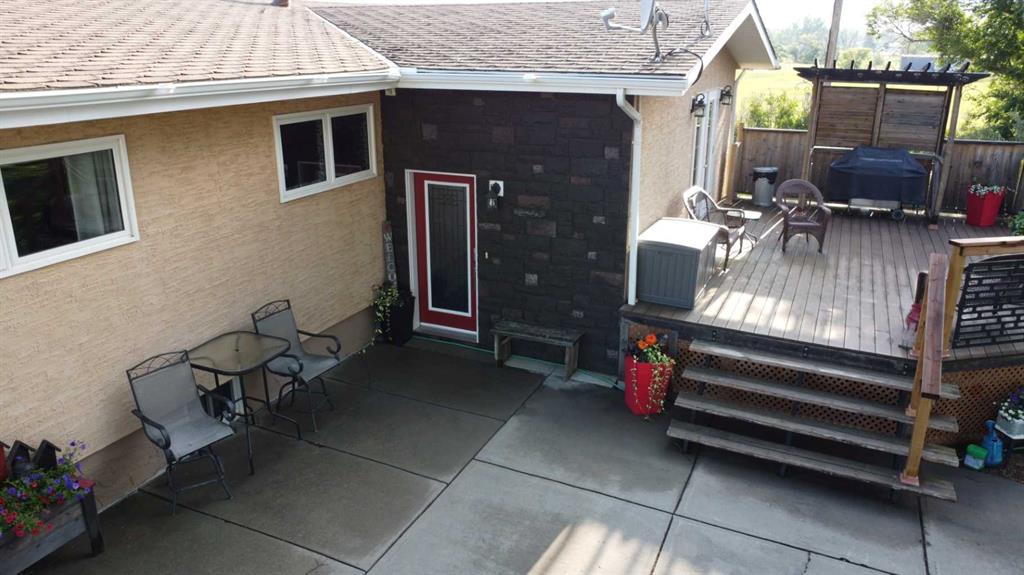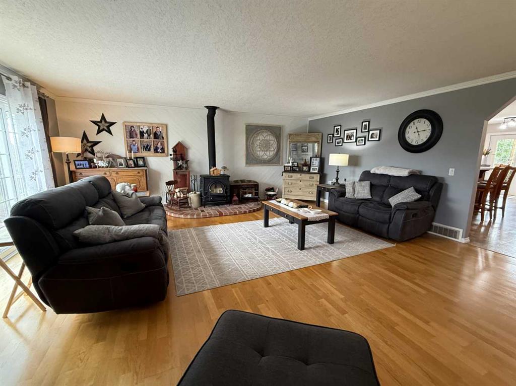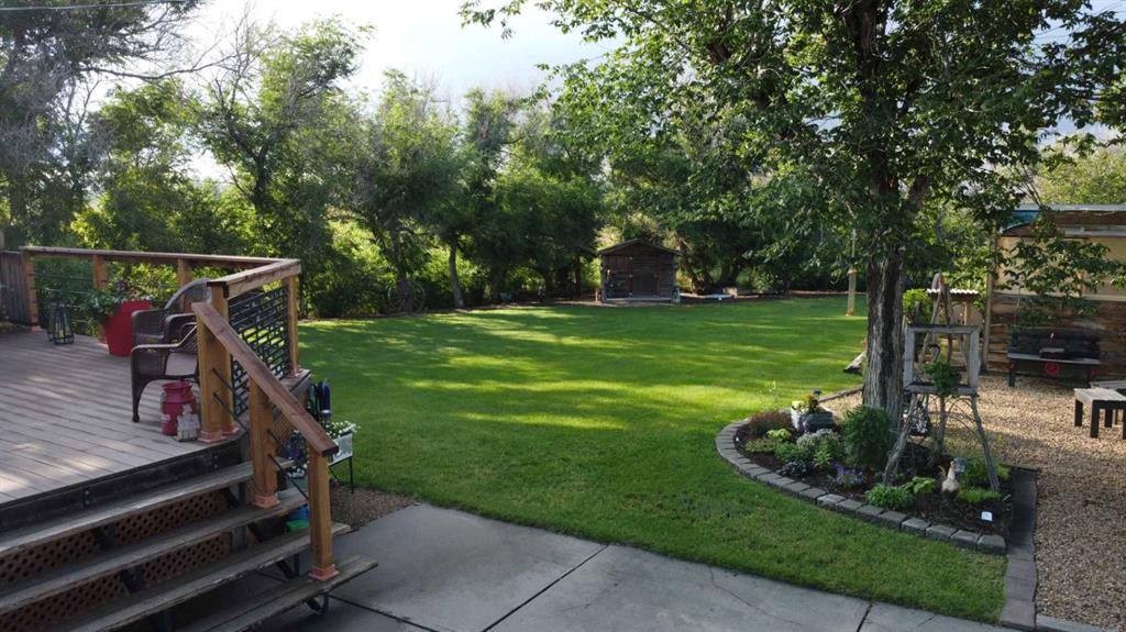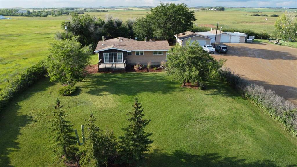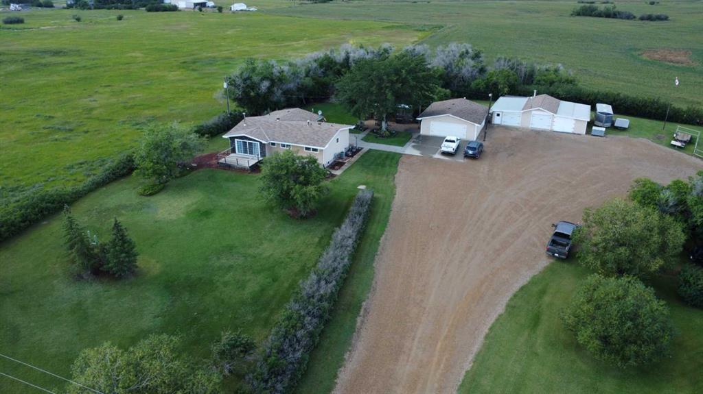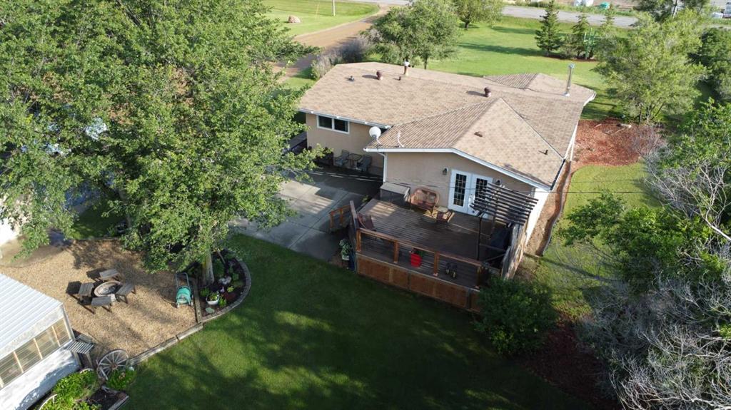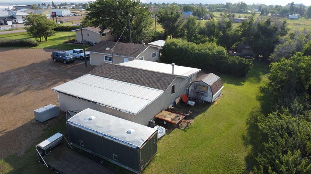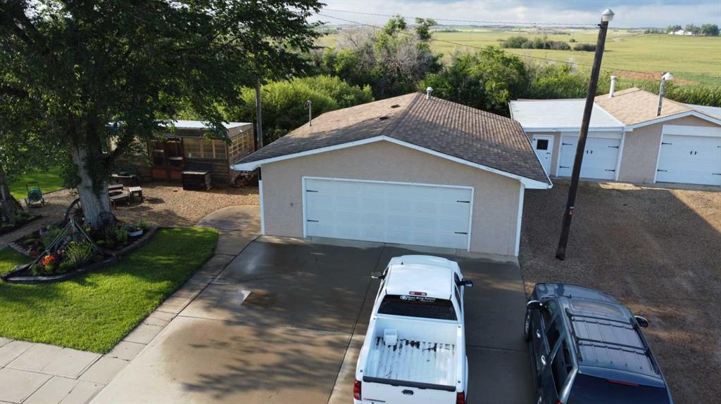Situated on an impressive 1.64 acres within the town of Hanna, this meticulously manicured property offers the best of both worlds—acreage living with in-town convenience. With no neighbors behind (just peaceful farmland views), this one-of-a-kind property is truly a private retreat. Perfect for hobbyists, mechanics, or anyone in need of extra space, this property features a 28x32 double garage, a 49x32 triple garage currently used as a workshop, a charming “she shed”/party shack, and a garden shed tucked at the back for tools and lawn care equipment. There’s also RV parking or space for all your extra toys behind the double garage. Step inside the extensively updated home and be welcomed by a spacious foyer with ample closet space. The main floor boasts a bright, open-concept kitchen designed for entertaining, complete with custom maple cabinetry with cherry accents, a walk-around island, walk-in pantry, and updated patio doors leading to the rear deck. The living room is equally impressive, featuring a cozy wood-burning fireplace set on cottage-style brick and another set of patio doors that open to your front deck—ideal for soaking in both sunrises and sunsets. The main floor also includes a large primary bedroom with a 2-piece ensuite, a second bedroom (currently used as an office), and a 4-piece main bathroom with a jetted tub. Downstairs, you’ll find a spacious family room, two additional bedrooms, a 3-piece bathroom, a large laundry area, and cold storage—plenty of space for the whole family or guests. Additional highlights include town water service with the convenience of a private well for watering the yard, central air conditioning to keep you comfortable all summer long, and thoughtfully curated perennial landscaping that adds color and charm to the yard year after year. Enjoy quiet evenings around the outdoor firepit, host gatherings on your front and back decks, and appreciate the quality craftsmanship and care that has gone into every corner of this home and property. With numerous upgrades throughout—including windows, exterior doors, and mechanical systems—this home is as functional as it is beautiful. This property truly has it all—privacy, space, and luxury—all within the town of Hanna. Whether you're looking to settle down, run a home-based business, or simply enjoy more room to breathe, this is the opportunity you've been waiting for. Call your REALTOR® today to book your private showing. Don’t miss out on this exceptional property!