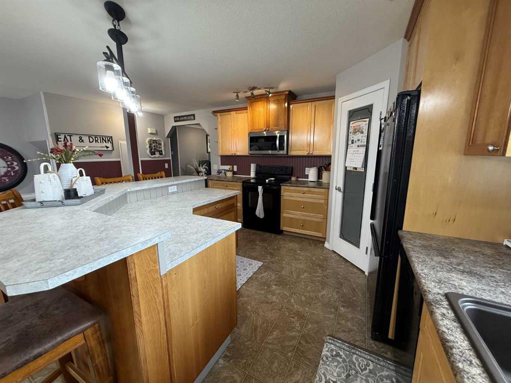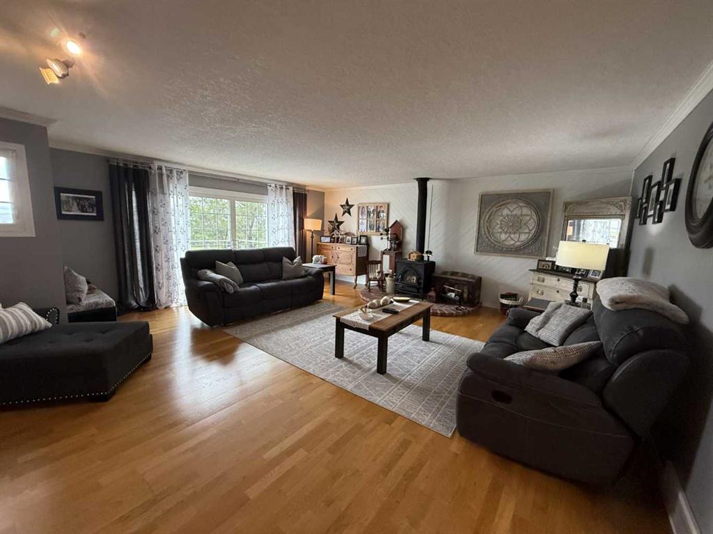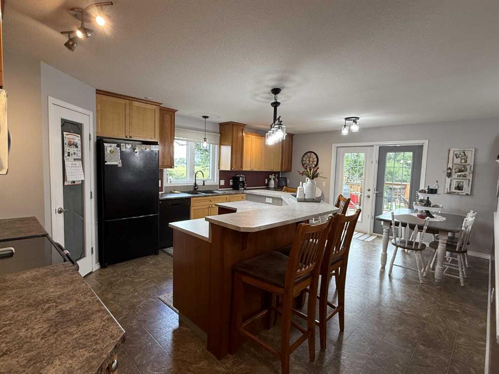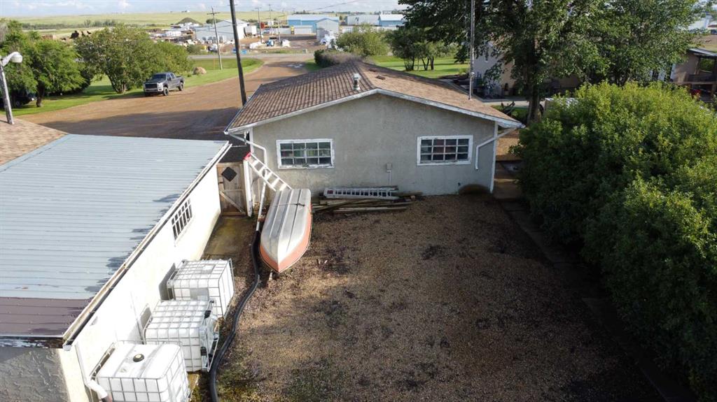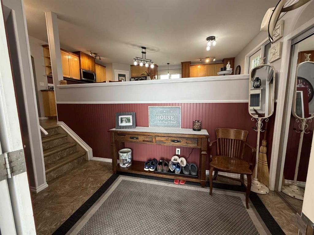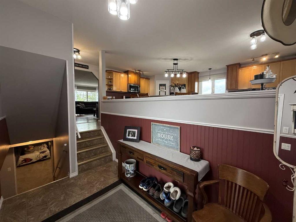 Situated on an impressive 1.64 acres within the town of Hanna, this meticulously manicured property offers the best of both worlds—acreage living with in-town convenience. With no neighbors behind (just peaceful farmland views), this one-of-a-kind property is truly a private retreat. Perfect for hobbyists, mechanics, or anyone in need of extra space, this property features a 28x32 double garage, a 49x32 triple garage currently used as a workshop, a charming “she shed”/party shack, and a garden shed tucked at the back for tools and lawn care equipment. There’s also RV parking or space for all your extra toys behind the double garage. Step inside the extensively updated home and be welcomed by a spacious foyer with ample closet space. The main floor boasts a bright, open-concept kitchen designed for entertaining, complete with custom maple cabinetry with cherry accents, a walk-around island, walk-in pantry, and updated patio doors leading to the rear deck. The living room is equally impressive, featuring a cozy wood-burning fireplace set on cottage-style brick and another set of patio doors that open to your front deck—ideal for soaking in both sunrises and sunsets. The main floor also includes a large primary bedroom with a 2-piece ensuite, a second bedroom (currently used as an office), and a 4-piece main bathroom with a jetted tub. Downstairs, you’ll find a spacious family room, two additional bedrooms, a 3-piece bathroom, a large laundry area, and cold storage—plenty of space for the whole family or guests. Additional highlights include town water service with the convenience of a private well for watering the yard, central air conditioning to keep you comfortable all summer long, and thoughtfully curated perennial landscaping that adds color and charm to the yard year after year. Enjoy quiet evenings around the outdoor firepit, host gatherings on your front and back decks, and appreciate the quality craftsmanship and care that has gone into every corner of this home and property. With numerous upgrades throughout—including windows, exterior doors, and mechanical systems—this home is as functional as it is beautiful. This property truly has it all—privacy, space, and luxury—all within the town of Hanna. Whether you're looking to settle down, run a home-based business, or simply enjoy more room to breathe, this is the opportunity you've been waiting for. Call your REALTOR® today to book your private showing. Don’t miss out on this exceptional property!