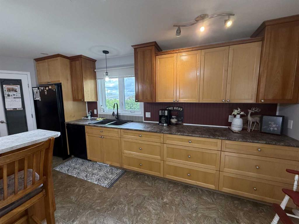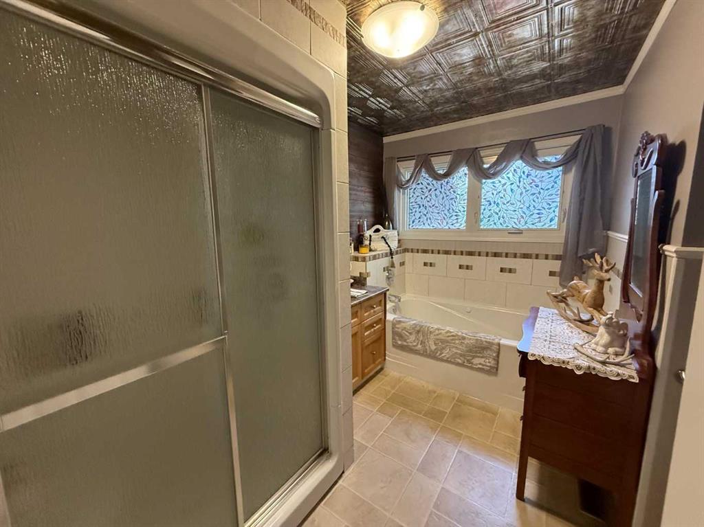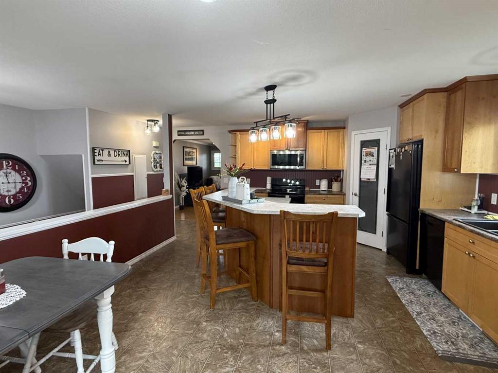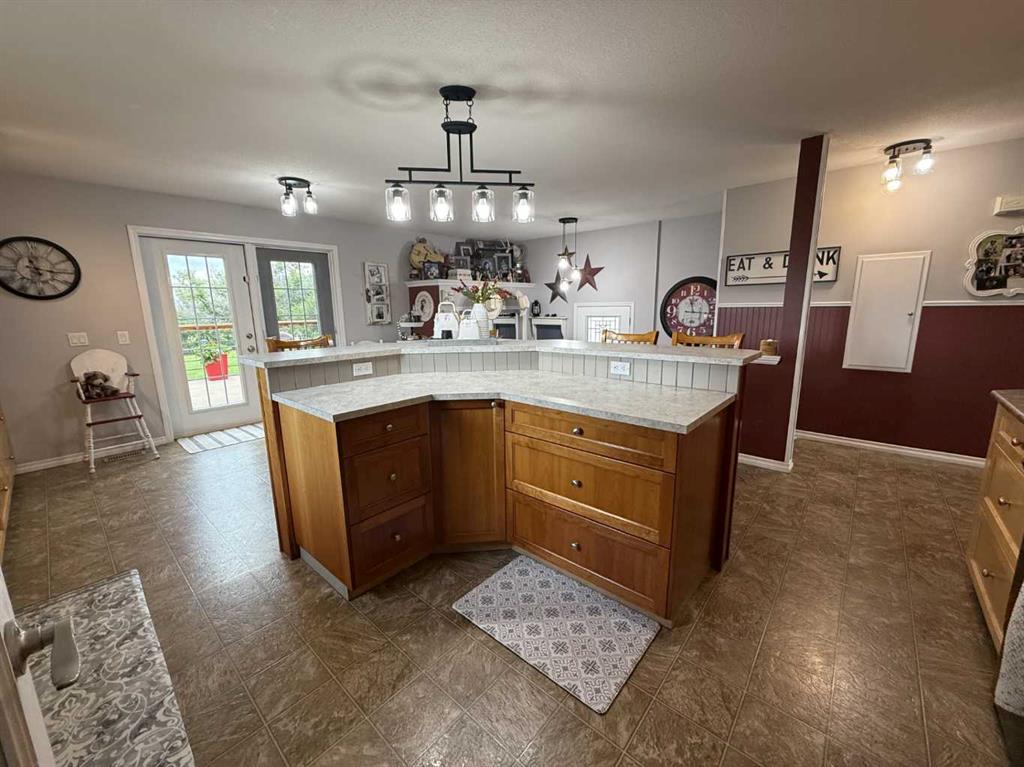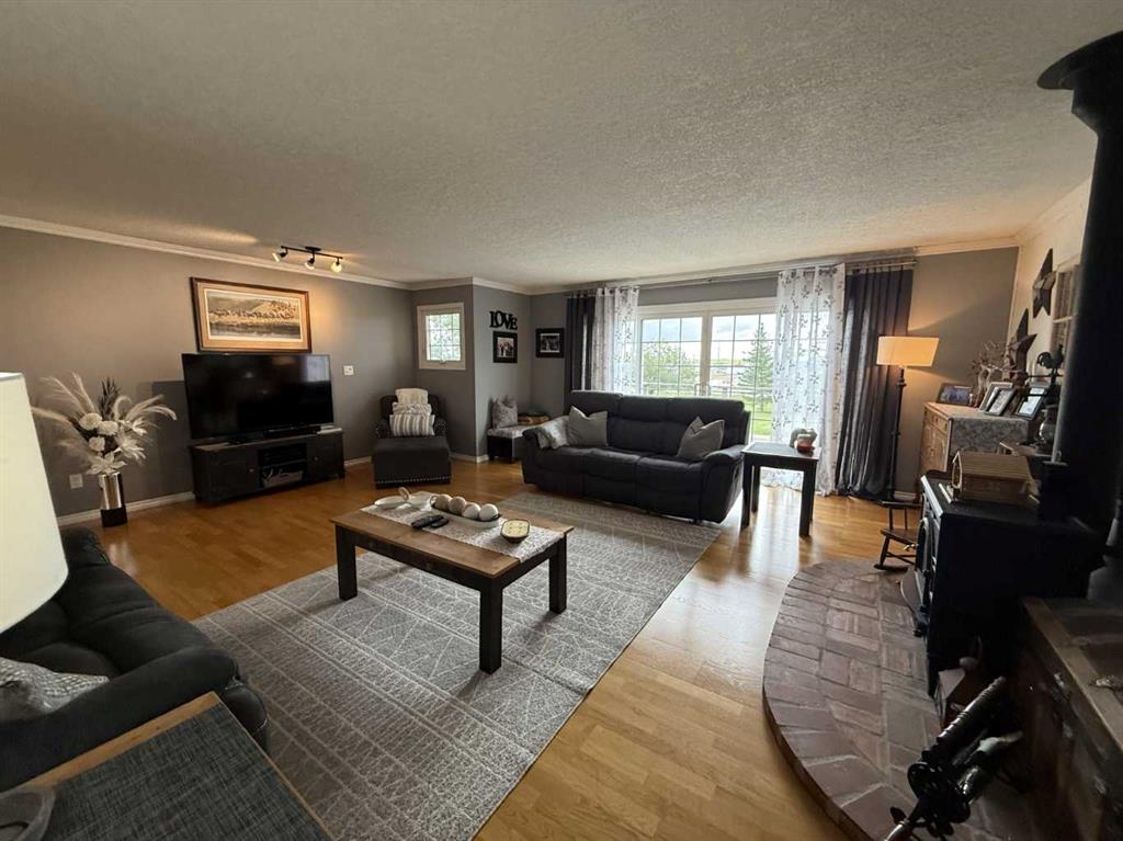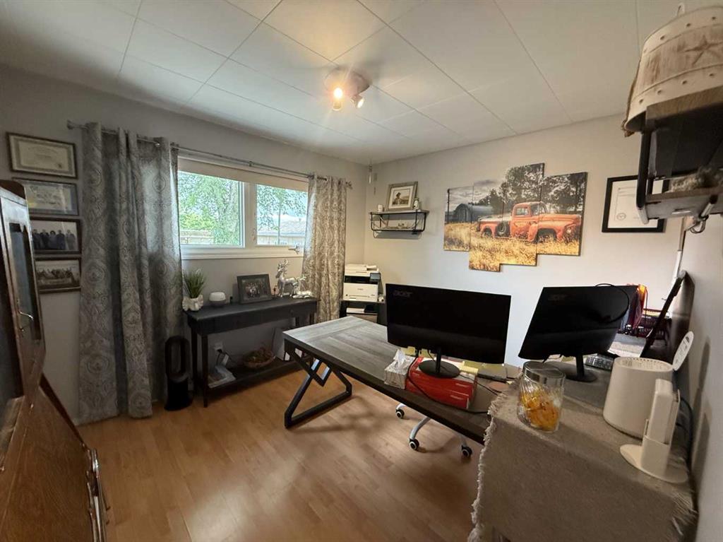 Situated on an impressive 1.64 acres within the town of Hanna, this meticulously manicured property offers the best of both worlds—acreage living with in-town convenience. With no neighbors behind (just peaceful farmland views), this one-of-a-kind property is truly a private retreat. Perfect for hobbyists, mechanics, or anyone in need of extra space, this property features a 28x32 double garage, a 49x32 triple garage currently used as a workshop, a charming “she shed”/party shack, and a garden shed tucked at the back for tools and lawn care equipment. There’s also RV parking or space for all your extra toys behind the double garage. Step inside the extensively updated home and be welcomed by a spacious foyer with ample closet space. The main floor boasts a bright, open-concept kitchen designed for entertaining, complete with custom maple cabinetry with cherry accents, a walk-around island, walk-in pantry, and updated patio doors leading to the rear deck. The living room is equally impressive, featuring a cozy wood-burning fireplace set on cottage-style brick and another set of patio doors that open to your front deck—ideal for soaking in both sunrises and sunsets. The main floor also includes a large primary bedroom with a 2-piece ensuite, a second bedroom (currently used as an office), and a 4-piece main bathroom with a jetted tub. Downstairs, you’ll find a spacious family room, two additional bedrooms, a 3-piece bathroom, a large laundry area, and cold storage—plenty of space for the whole family or guests. Additional highlights include town water service with the convenience of a private well for watering the yard, central air conditioning to keep you comfortable all summer long, and thoughtfully curated perennial landscaping that adds color and charm to the yard year after year. Enjoy quiet evenings around the outdoor firepit, host gatherings on your front and back decks, and appreciate the quality craftsmanship and care that has gone into every corner of this home and property. With numerous upgrades throughout—including windows, exterior doors, and mechanical systems—this home is as functional as it is beautiful. This property truly has it all—privacy, space, and luxury—all within the town of Hanna. Whether you're looking to settle down, run a home-based business, or simply enjoy more room to breathe, this is the opportunity you've been waiting for. Call your REALTOR® today to book your private showing. Don’t miss out on this exceptional property!