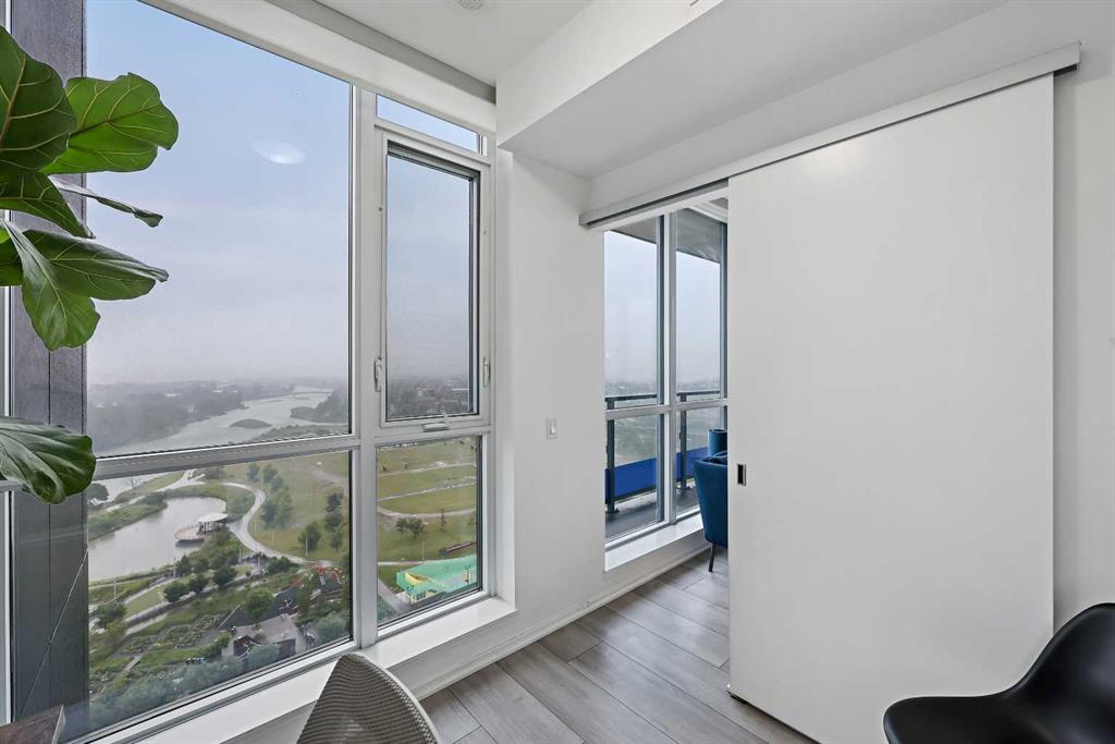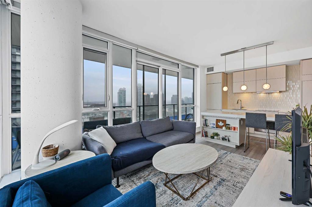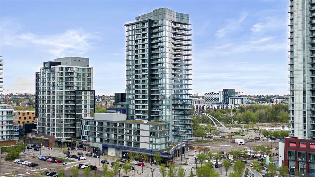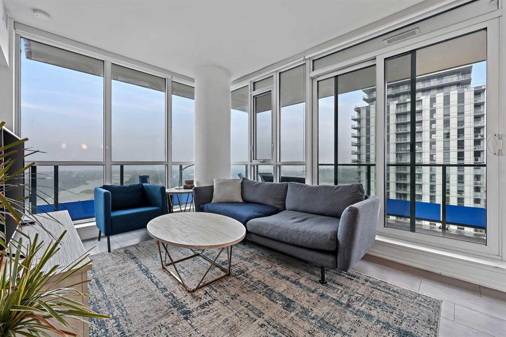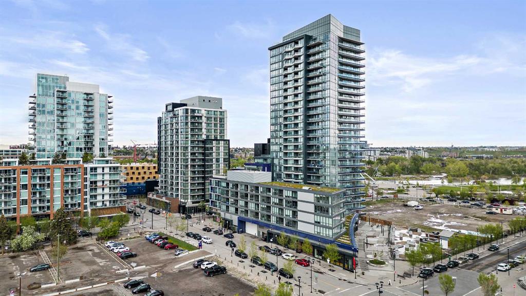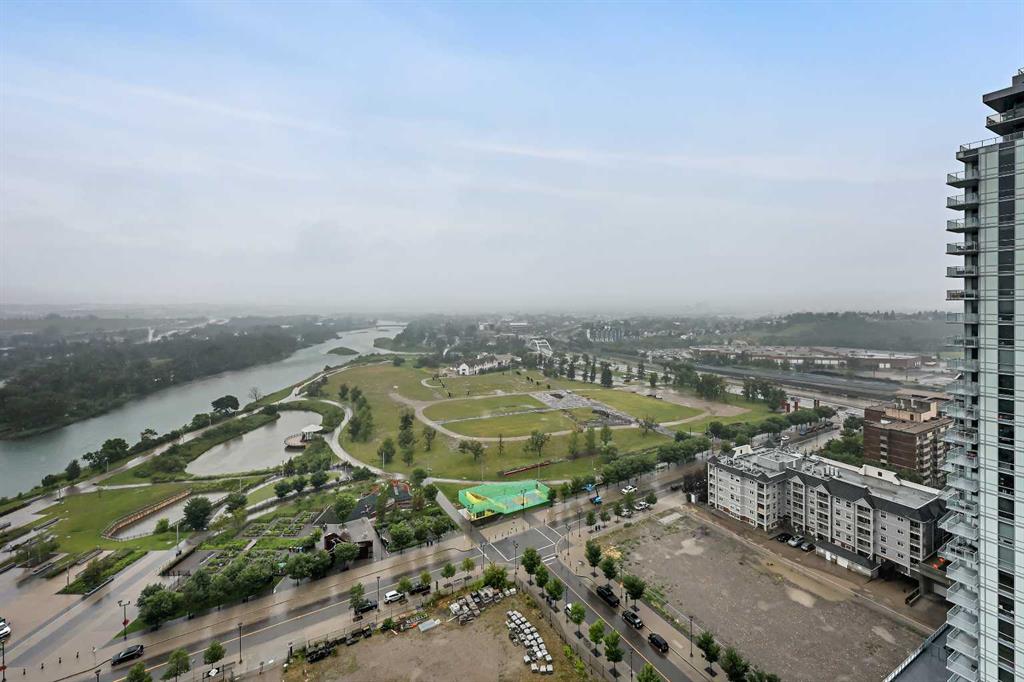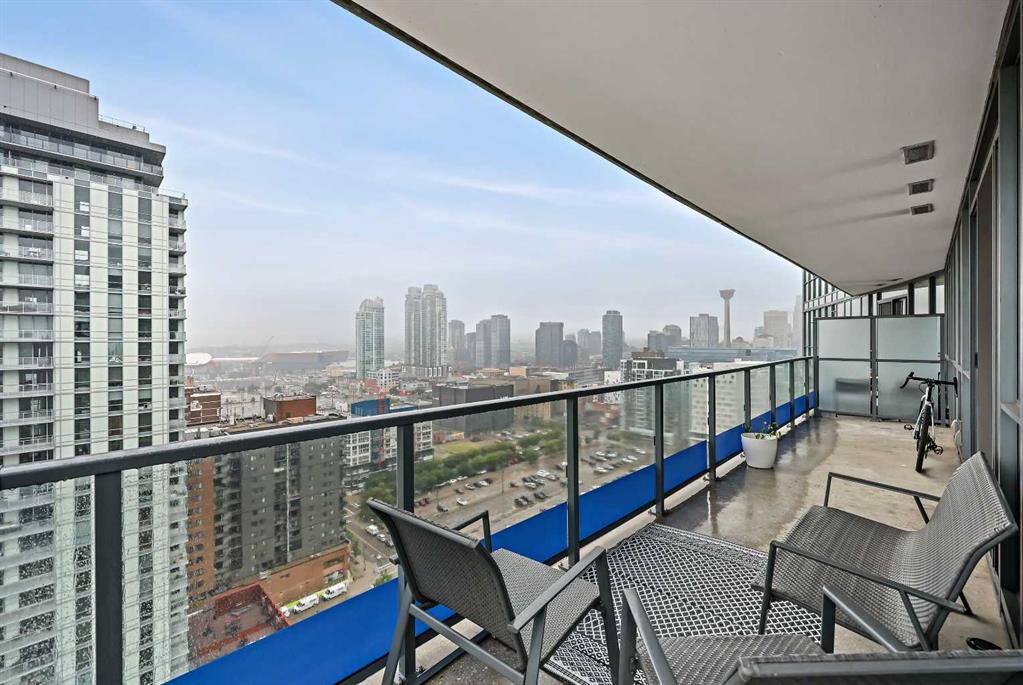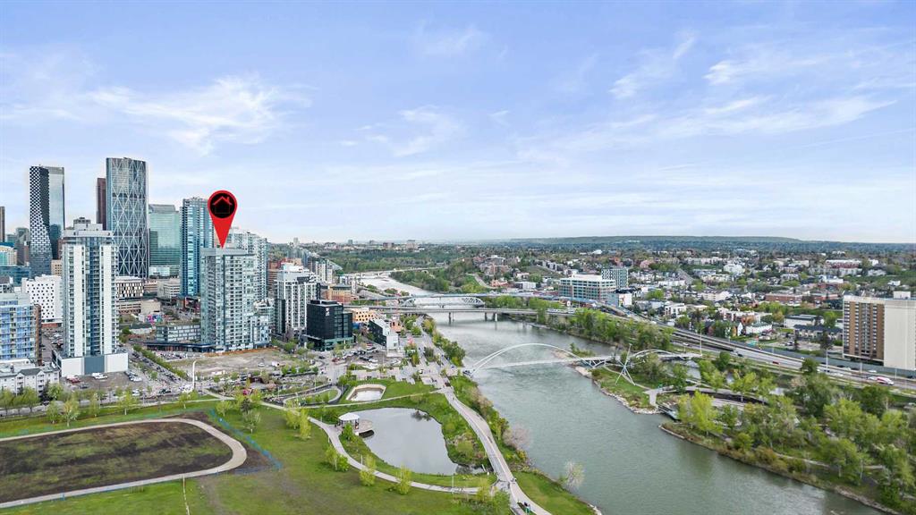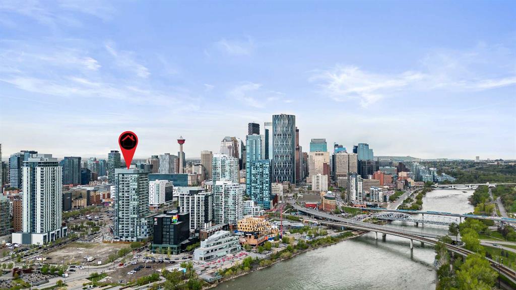 Experience elevated city living in this spectacular 21st-floor corner unit in the Verve, located in the vibrant heart of East Village. With unobstructed southeast views overlooking the Bow River, Fort Calgary, Stampede Park, and downtown skyline, this 2-bedroom, 2-bathroom residence combines location, light, and lifestyle in one of Calgary’s most walkable neighbourhoods. Floor-to-ceiling windows flood the open-concept space with natural light, while the set-back deep windowsills create an expansive, airy feel rarely found in high-rise condos. The 200+ sq ft wraparound balcony invites you to BBQ, lounge, and soak in the panoramic vistas day or night. Thoughtfully designed for comfort and style, the kitchen features sleek cabinetry, quartz countertops, a large island perfect for entertaining, and a built-in electric cooktop. The primary bedroom offers a tranquil retreat with stunning views and a modern 3-piece ensuite, while the second bedroom is ideal for guests, a home office, or den. A spacious 4-piece main bath, in-suite laundry room, and central air conditioning add to everyday convenience. The unit also includes a rare, oversized titled underground parking stall—big enough to fit a truck—and an assigned storage locker. The Verve offers exceptional amenities: a second-floor fitness centre, social lounge with kitchen and terrace, guest suites, and an exclusive 25th-floor rooftop patio and party room with unobstructed views. Perfectly positioned for active professionals, pet lovers, and investors alike. You're steps from the RiverWalk, bike paths, and an off-leash dog park across the street. The Central Library, Superstore, Studio Bell, and a growing list of East Village cafes, restaurants, and breweries are all within a 5-minute walk. Plus, you're in Calgary's free fare LRT zone for stress-free downtown commuting. Whether you're searching for a pet-friendly river-view condo, a modern downtown home with amenities, or a turnkey rental in a high-demand location, this top-floor end unit delivers it all. Don’t miss your opportunity to own one of East Village’s most desirable views. Book your showing today.