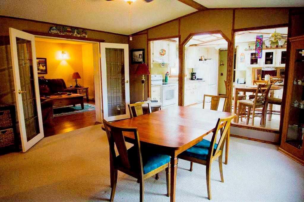 Welcome to 50+ living in this adult community designed with seniors in mind. This single wide mobile home with a generous addition creates a unique floor plan boasting a lovely living/ TV room overlooking the deck, a 4th bedroom (currently used as an office), and a generous foyer complete with large coat closet and ample seating to conveniently change footwear. The irregular shape of this front entry accommodates space to welcome several guests at one time. The original living room is now a semi-formal dining room, featuring a west facing large window, carpet flooring, and French doors to the adjacent living room. Glass partition walls either side of the entrance to the bright eat-in kitchen creates an open flow while delineating the space for furniture placement. The kitchen workspace is flooded with natural light from the skylight and window overlooking the deck. Other features include ample cupboard space , a built in China cabinet, and pantry with slide out shelving for convenience. Down the hall a step or two is the laundry/storage/mechanical room opposite the back door which accesses the generous deck. Here is an outdoor space for B-B-Q, summer suppers in a private space sheltered from northerly and westerly breezes, overlooking the fenced back yard. Back inside the entire south end of the home is the primary bedroom featuring a 3 piece ensuite. The walk-in shower there was created by "Bath Fitter" in 2020 replacing the original tub. Two good sized closets with mirrored doors complete this lovely retreat . At the north end of the home you will find 2 more bedrooms, a 4 piece bath with tub, large linen closet and a smaller utility closet for vacuum etc. This very well thought out floor plan clicks all the boxes for many couples.