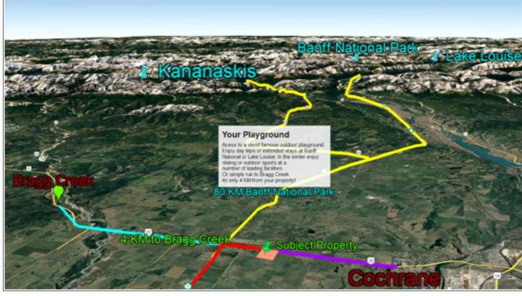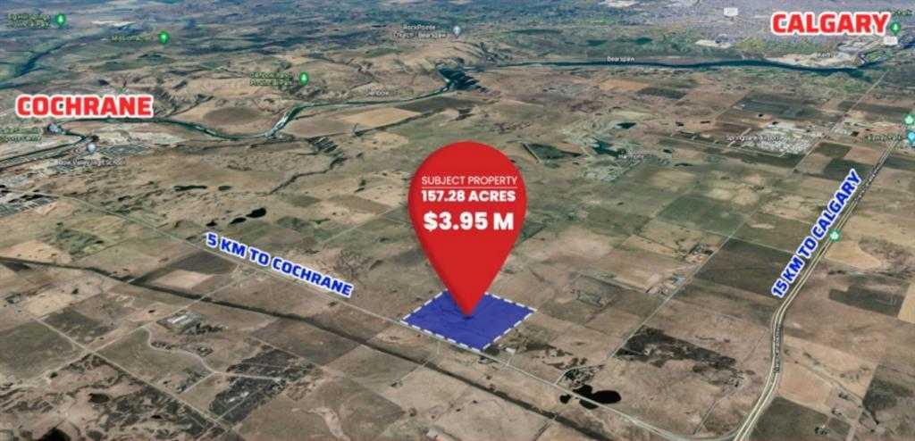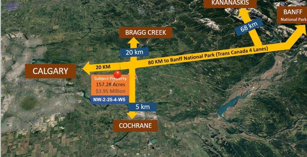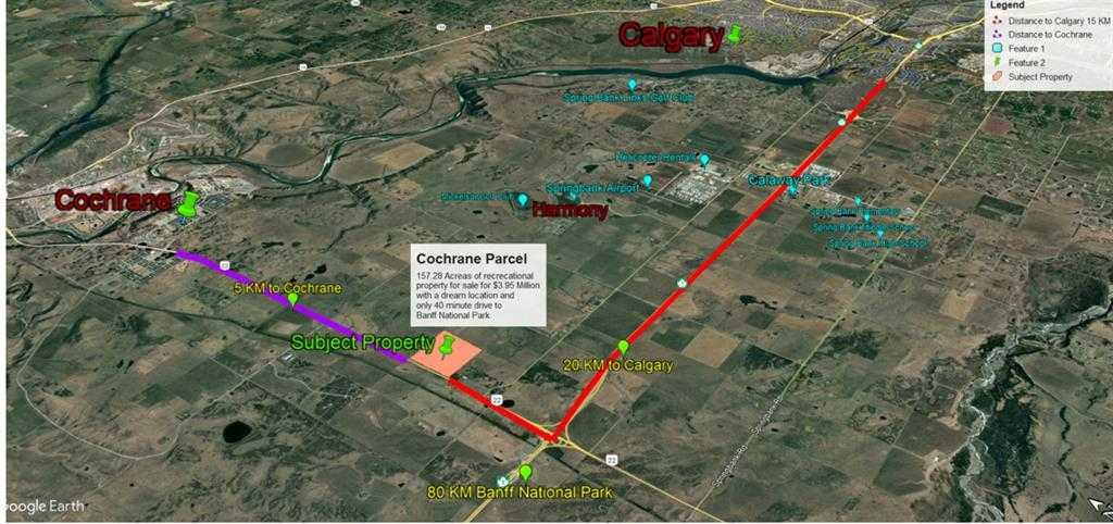 It is an incredibly located piece of land for sale, one mile north of Highway One, right on Highway 22 towards Cochrane. There are multiple possibilities for the usage of this property due to the location, such as Rv parking and recreational facilities. There can be a huge scope to drop by entertain the visitors on the way from Calgary to Banff National Park. Being very close to the newly built Harmony community, there are bright chances to get it zoned country residential development from Rocky View County. There is a small subdivision of 10 to 20 acres is quickly possible to build a farmhouse.