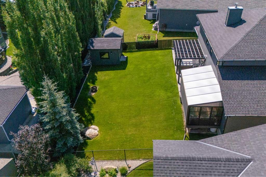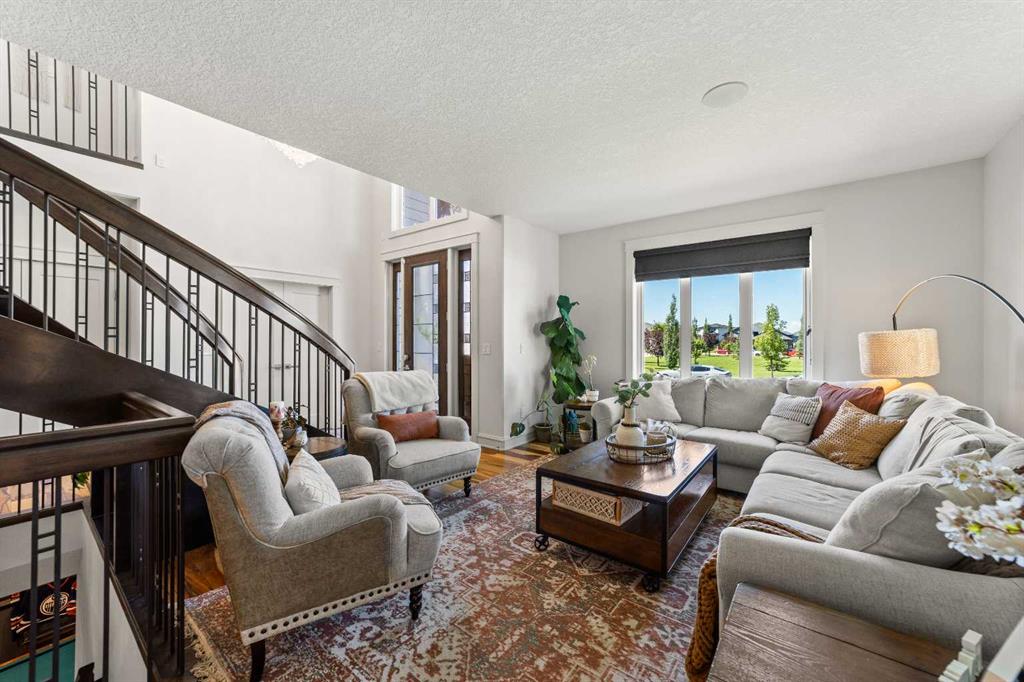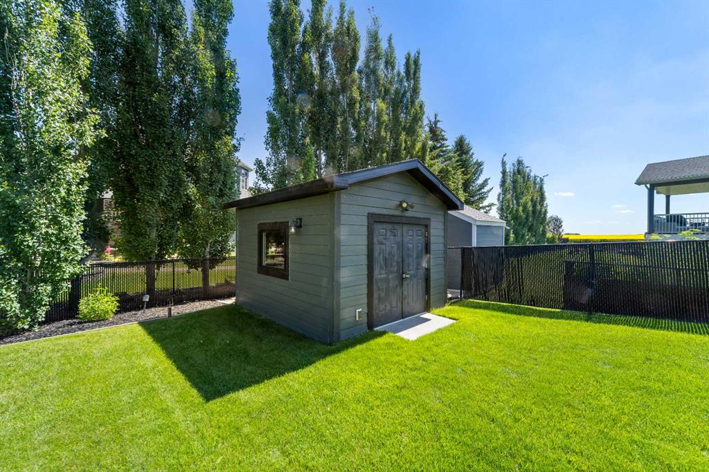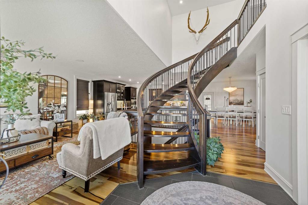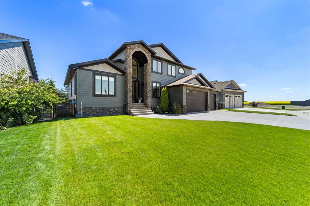 Welcome to this exceptional 5-bedroom luxury home, located on Harrison Green in the Olds Highlands. Situated on a generous lot with a beautiful central green space right out front, this property blends high-end finishes, thoughtful design, and an unbeatable location in one of Olds’ most desirable neighborhoods. From the moment you enter, you're greeted by a grand open staircase and elegant features throughout. The chef’s kitchen is the heart of the home—perfectly designed for entertaining and everyday living—with a large center island, full-size stove, wall oven and microwave, pot filler, wine fridge, and ample work space. There's also plenty of room for a large dining table, making it ideal for hosting family gatherings and dinner parties. Beside the dining area, a cozy, tucked-away family/TV room offers a perfect spot to unwind, separated by a double-sided fireplace that adds warmth and ambiance to both spaces. Enjoy total comfort in the 3-season east-facing enclosed patio room, perfect for morning coffee or evening relaxation. Step outside to a beautifully landscaped yard with a hot tub, rear shed with power, and a full irrigation system keeping the lawn green and lush. All five bedrooms feature walk-in closets, and the primary suite is a true retreat with a spa-inspired ensuite, including a freestanding tub and a double-sided fireplace shared with the bedroom—offering the perfect blend of comfort and luxury. The fully finished basement features in-floor heating, wet bar, a home theatre, and two large bedrooms—perfect for teenage children, guests, or visiting grandchildren needing space and privacy. Car lovers and hobbyists will appreciate the heated 4-car garage, complete with in-floor heat, a car hoist, air compressor with air lines throughout, and plenty of space for vehicles, tools, and toys. Additional highlights include a reverse osmosis water system, upgraded lighting, and premium finishes throughout. Don’t miss out on this incredible property that offers luxury, comfort, and room to grow in a prime location.