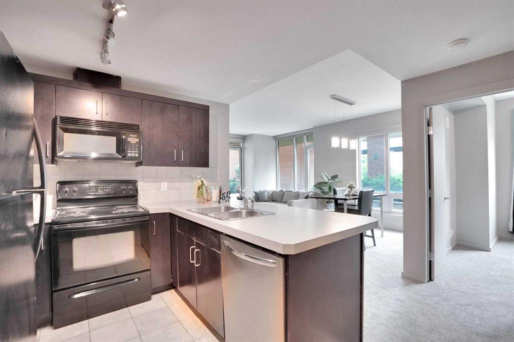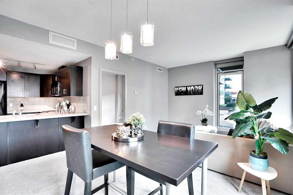 Welcome to " SASSO " an exclusive, LUXURY RESIDENCE ideally located just steps from Calgary’s vibrant DOWNTOWN CORE, Stampede Park, the BMO Centre, and the renowned 17th Avenue, famous for its upscale dining and nightlife. With the VICTORIA PARK LRT Station directly across the street, this prime location offers unparalleled access to the entire city. This prestigious apartment building offers a host of EXCEPTIONAL AMENITIES, including underground parking, FULL CONCIERGE services, a pool table and game room, a private movie theatre, a sauna, steam room, hot tub, and a FULLY EQUIPPED fitness centre, ensuring that every convenience is at your fingertips. This beautifully designed 2-bedroom, 2-bathroom residence boasts a spacious and thoughtfully floor plan. The rare wraparound terrace provides direct access to the second-floor courtyard, offering a tranquil outdoor space – perfect for those who love open-air lounging. KEY FEATURES: include modern finishes, white countertops, a stylish eating bar, and stainless steel appliances complemented by generous kitchen storage. Floor-to-ceiling windows allow natural light to flood the living space, creating an airy, inviting atmosphere. The master bedroom is a retreat in itself, featuring a walk-in closet. Recent upgrades include brand-new carpet and brand new baseboards, further enhancing the comfort and appeal of this exceptional home. Additionally, this unit includes a heated underground parking stall and a dedicated storage locker for added convenience. Property is 18+, does NOT allow dogs and it is currently VACANT. Easy to show.