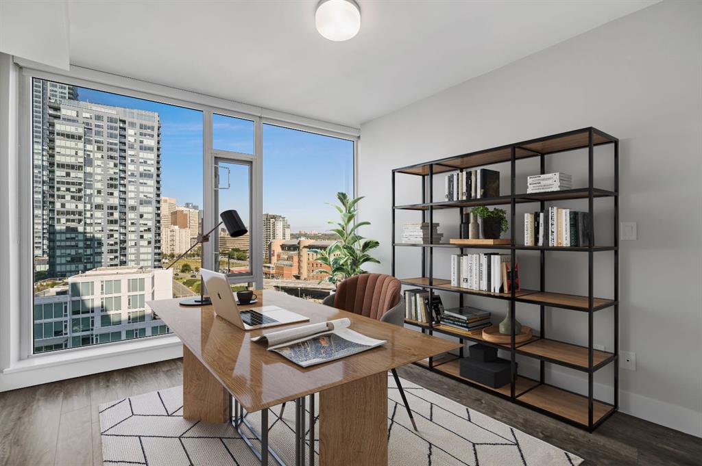 Tremendous value in this beautifully maintained and spacious 2-bedroom, 2 full bath unit with amazing river and NW Calgary views from the 11th floor! In the heart of Calgary’s East Village, you can walk to everything including the walking and cycling paths along the Bow River, shopping, cafes and bakeries, top Calgary restaurants, the LRT, the Saddledome and Stampede Park, and Calgary’s future entertainment district. You really are in the center of it all here! #1102 features luxury vinyl plank flooring, very modern and sleek white kitchen cabinets, gas range, granite counters throughout, a primary bedroom with ensuite including dual sinks, central A/C, in-floor heating in the bathrooms, and blackout blinds in the 2 bedrooms. You can even sit on the spacious balcony complete with gas line for cozy fire table and BBQ and watch the river just float on by. Located in the well run Evolution complex, you will enjoy one of the very best oversized parking stalls (#281-extra wide, with no other cars beside you and just steps to the elevator and your very own storage locker), security and concierge service, visitor parking in the parkade, 2 well-appointed fitness rooms, steam and sauna rooms, owners lounge with pool table and kitchen, and central courtyard with BBQ’s and sitting areas to entertain friends and family. Monthly condo fee includes, gas, heat, water, sewer, trash and all amenities! This really is the one you have been waiting for. Experience and enjoy the best of Calgary’s urban lifestyle, today!