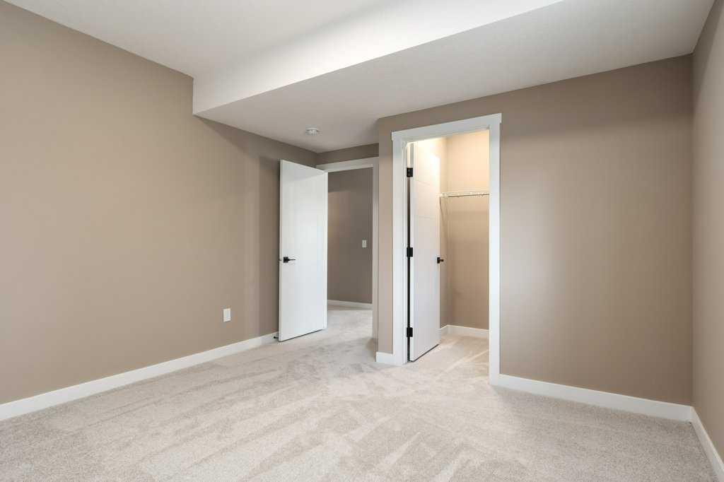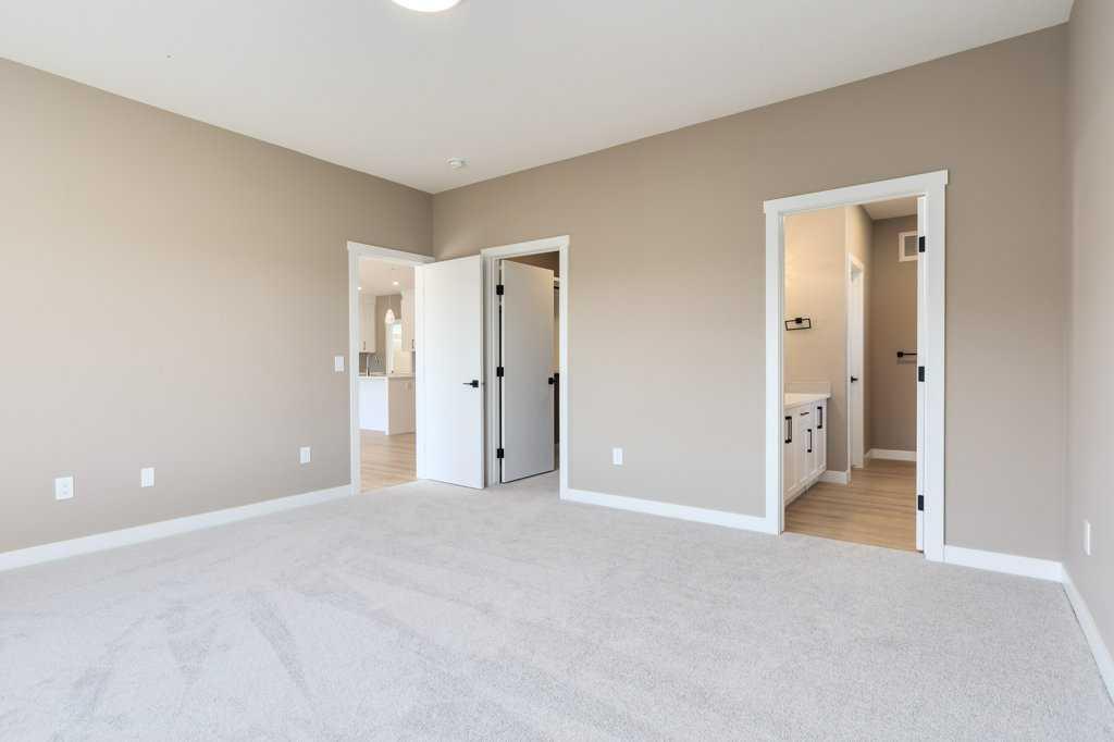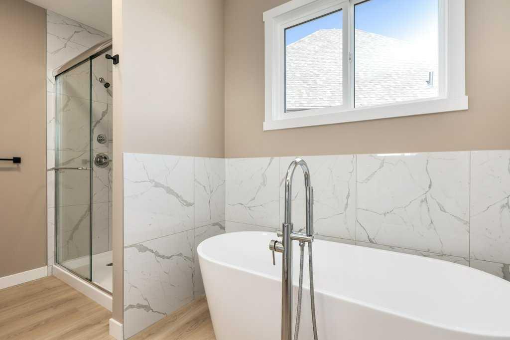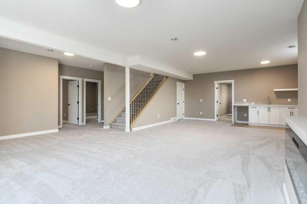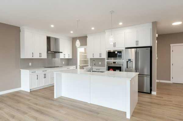 This is a brand new triple garage bungalow with a fully finished walkout basement. It is 1608 sq ft in a great area close to a beautiful waterway and park, and has premium finishes throughout. The main floor is a modern open plan with a wide entry hall, 9’ ceilings, high quality flooring, and a 25’ deck. The kitchen includes cabinets to the ceiling, quartz counters, under-mount sink, select tiles, and a large walk-in pantry. Also on the main floor is the spacious and open living / dining room, the primary bedroom, a laundry room, and a second bedroom or office. Deluxe appointments in the master suite include built in cabinetry in the walk-in closet, a double vanity, a freestanding soaker tub and a 6' shower. The lower level has three more spacious bedrooms and a very big family room with a built-in wet bar, a full bathroom and patio doors to a shady covered patio. All rooms in this home have lots of natural light, and there are many extras including a 8’ island in the kitchen, two fireplaces, and a Hardie board exterior.