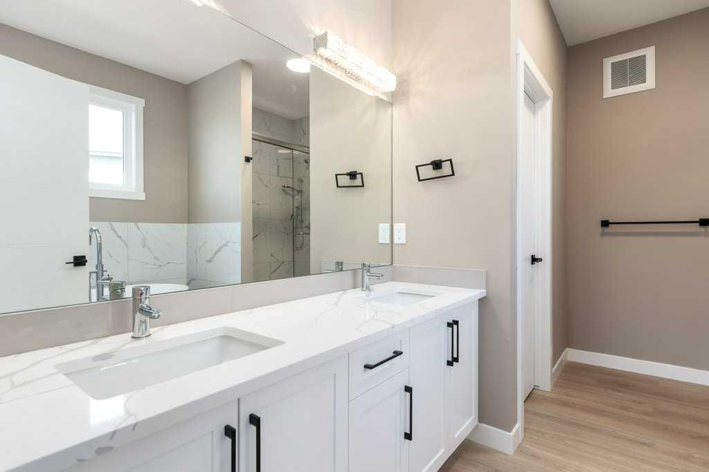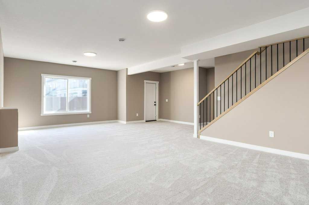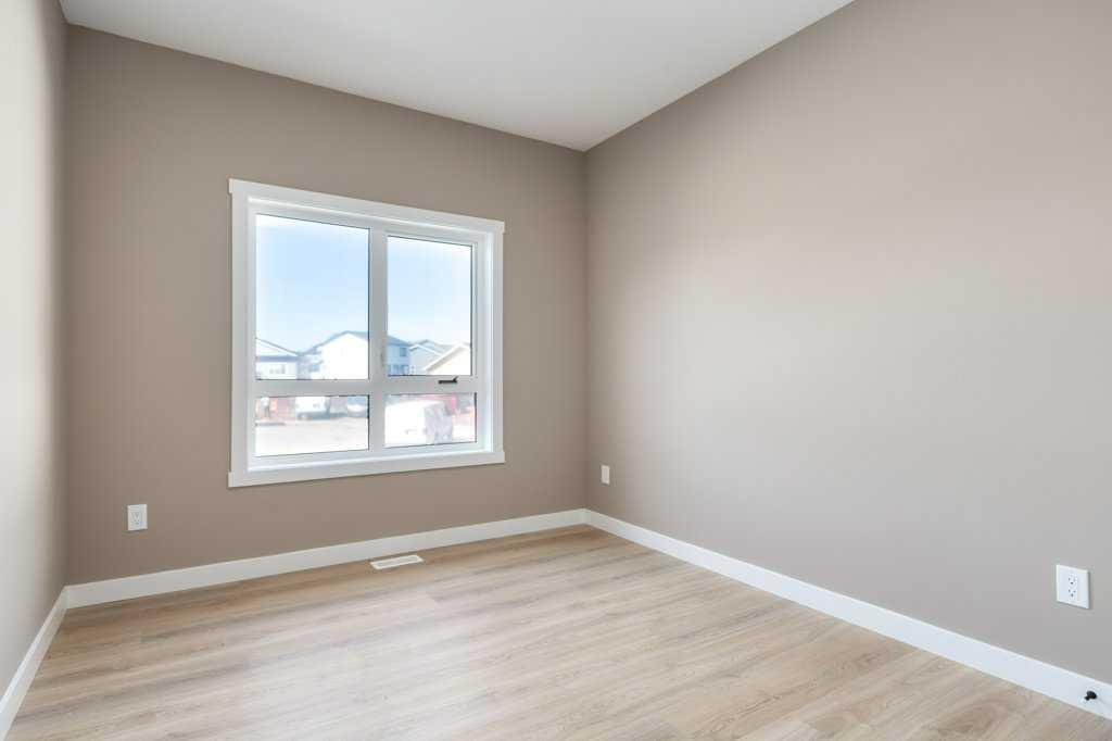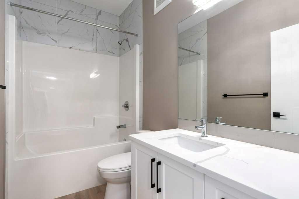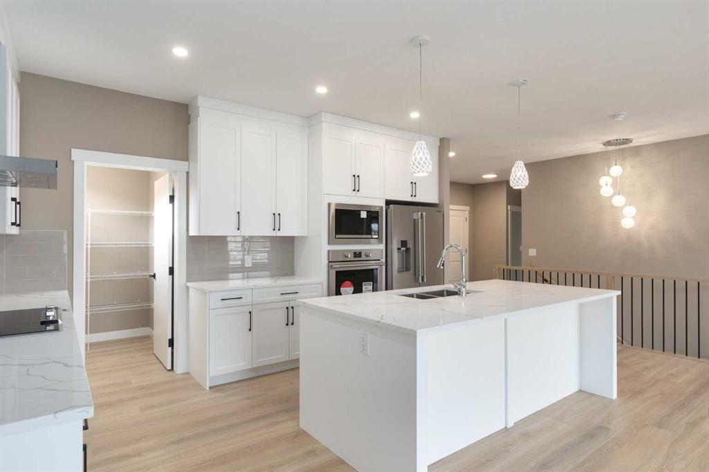 This is a brand new triple garage bungalow with a fully finished walkout basement. It is 1608 sq ft in a great area close to a beautiful waterway and park, and has premium finishes throughout. The main floor is a modern open plan with a wide entry hall, 9’ ceilings, high quality flooring, and a 25’ deck. The kitchen includes cabinets to the ceiling, quartz counters, under-mount sink, select tiles, and a large walk-in pantry. Also on the main floor is the spacious and open living / dining room, the primary bedroom, a laundry room, and a second bedroom or office. Deluxe appointments in the master suite include built in cabinetry in the walk-in closet, a double vanity, a freestanding soaker tub and a 6' shower. The lower level has three more spacious bedrooms and a very big family room with a built-in wet bar, a full bathroom and patio doors to a shady covered patio. All rooms in this home have lots of natural light, and there are many extras including a 8’ island in the kitchen, two fireplaces, and a Hardie board exterior.