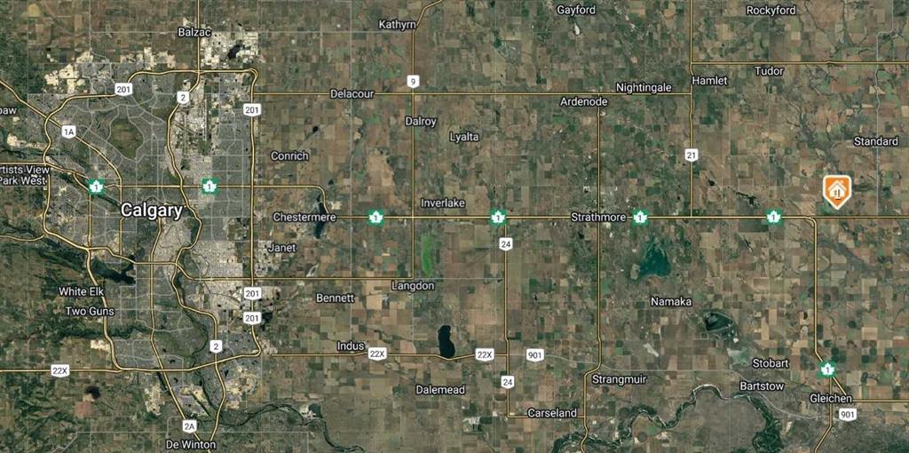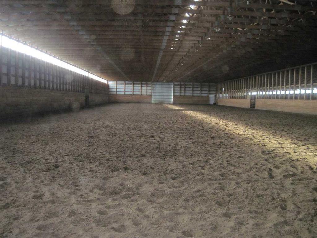 Lots of opportunity here to make this diamond in the rough come together to once again create a top notch horse training facility! This 146 ACRE property is only a short 10 minute drive East of Strathmore/ 35 minutes East of CALGARY and only 3 miles away from the new K-12 Wheatland Crossing School,and OFFERS 1) 240'X102'INDOOR RIDING ARENA with a tack room,wash rack,3 piece bathroom, and a small studio apartment. 2) ATTACHED BARN off of the arena with 8 large box stalls,tack room,sheoing area,feed room, and 220 wiring. 3) 1985 built modular bungalow with an addition and an oversized heated double attached garage. 4)A 711ft2 A-FRAME with 1 loft bedroom and a 3 piece bathrooom/kitchen/living room with a wood stove and in floor heat. 5) EXTENSIVE CORRAL/PADDOCK SYSTEM with 14 covered turnout pens with 7 waterers, as well as a chicken coop and tool shed. 6) 2 drilled water wells,3 septic systems, 4 dugouts, a small lake and the Western irrigation canal runs through the property(no water rights) . There are nice views and riding paths along the canal and a 1/2 mile private driveway to the buildings that helps insure privacy and livestock/pets security. Lots of work/tlc is required.