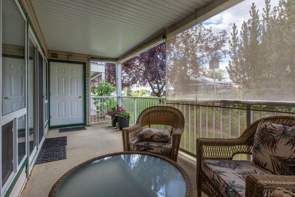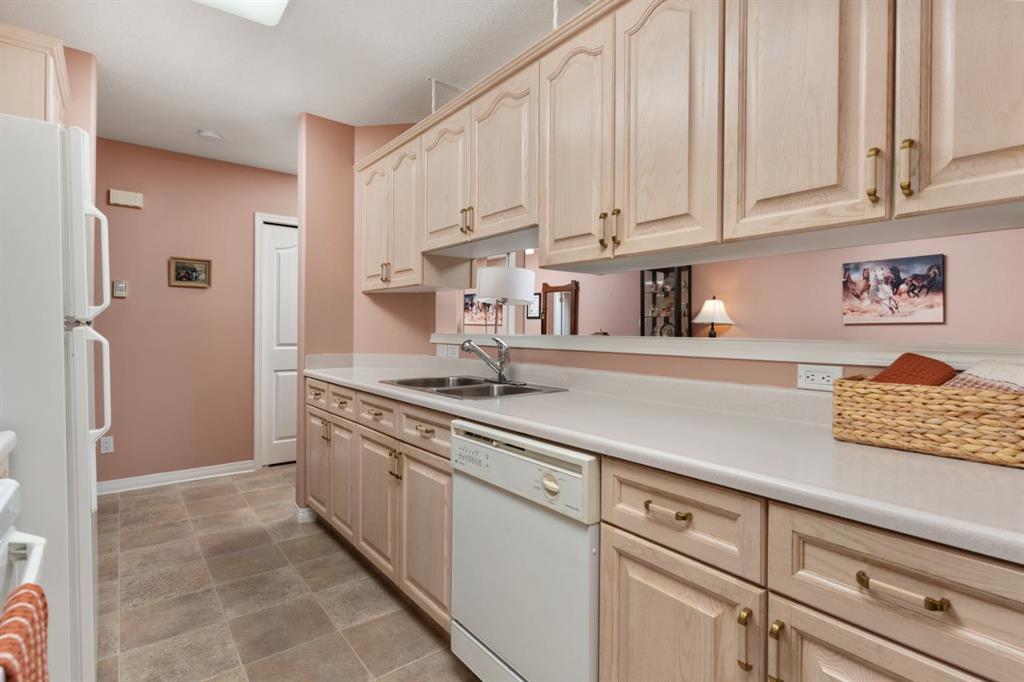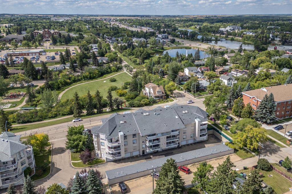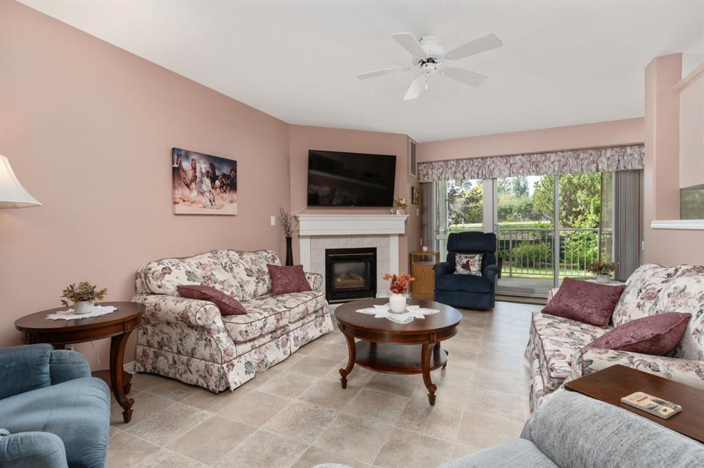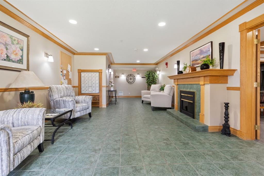 Welcome to this bright and inviting 2-bedroom, 2-bathroom main floor end unit condo, ideally located just across from scenic parks and miles of walking trails, and only steps away from the vibrant heart of downtown Camrose. This unit feels more like a private retreat than a condo, thanks to its lush, garden-like setting. Step through sliding deck doors from the cozy living room-complete with a gas fireplace and classic mantle-onto your covered, private deck. Surrounded by mature shrubs, trees, and an optional privacy screen, this outdoor space feels like your very own secret garden. The kitchen is well laid out with plenty of cabinets and counter space, perfect for baking, cooking, and entertaining. The open dining area offers flexible space whether you're hosting a dinner party or enjoying a quiet evening at home. Down the hall, you'll find a spacious primary bedroom with a large window, walk-in closet, and its own 3-piece ensuite. The second bedroom, perfect for guests or a home office, features corner windows with views of greenery, offering a calm, peaceful ambiance. A full 4-piece main bathroom and in-suite laundry with additional storage complete the interior. An added bonus: this unit is just steps from the titled attached garage, making it incredibly convenient and accessible. The building is professionally managed and features a strong, welcoming community. Take part in social events like music nights, coffee mornings, dinners, and games in the party room, or enjoy the quiet privacy of your own space. The choice is yours. Whether you're downsizing, looking for a peaceful home base, or a low-maintenance lifestyle close to everything, this condo offers a rare blend of comfort, nature, community, and convenience.