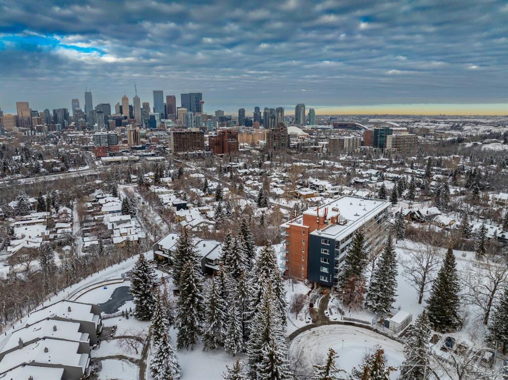 Uninterrupted panoramic views of Calgary’s downtown skyline define this recently renovated two-bedroom, one-bathroom end unit on the 6th floor of the renowned Renfrew House. Renovated in 2016, the transformation went far beyond aesthetics. The unit was completely rebuilt to modern standards with new windows, electrical wiring and panel, updated plumbing lines, enhanced soundproofing, and hardwired CAT 6e networking throughout for seamless connectivity. Inside, mid-century modern design meets contemporary sophistication. Commercial-grade Coswick hardwood floors, dimmable LED lighting with designer fixtures, and Lutron controls create a polished ambiance, while unique touches—like the restored original milk delivery door and custom quartz-topped radiator covers—preserve timeless character. The kitchen is a culinary showpiece, boasting built-in Thermador and Bosch appliances including an induction cooktop, custom soft-close cabinetry, and a striking Italian chevron Mutina stone backsplash lit by LED under-cabinet lighting. A built-in electric fireplace enhances the dining area, while the living room is anchored by a walnut-paneled TV feature wall framed by sweeping city views. Custom closet systems maximize storage throughout, while the spa-inspired bathroom offers a walnut vanity, quartz counters, Grohe and Kohler fixtures, and a dedicated makeup station. The primary bedroom provides elegant, functional closet solutions, and the spacious second bedroom is perfect for guests or a home office. The home includes underground parking and a storage unit, all within 13 acres of park-like grounds atop the hill—an unmatched setting combining green space, privacy, and city convenience. Book your private showing today.