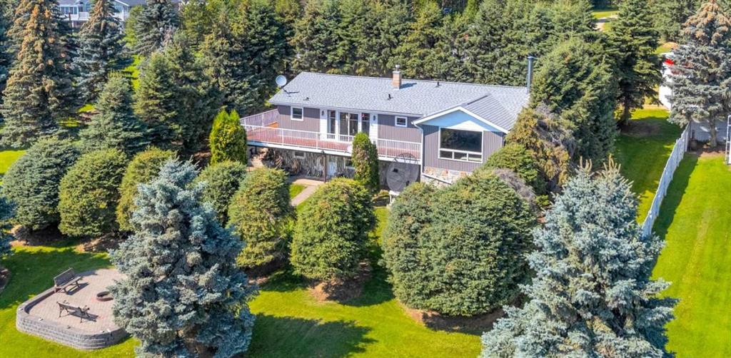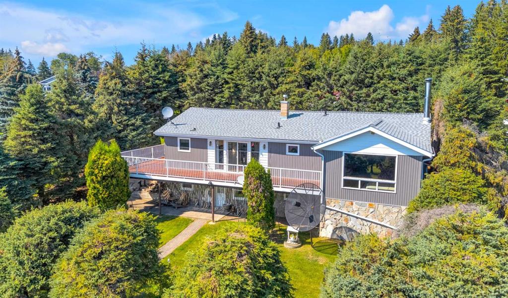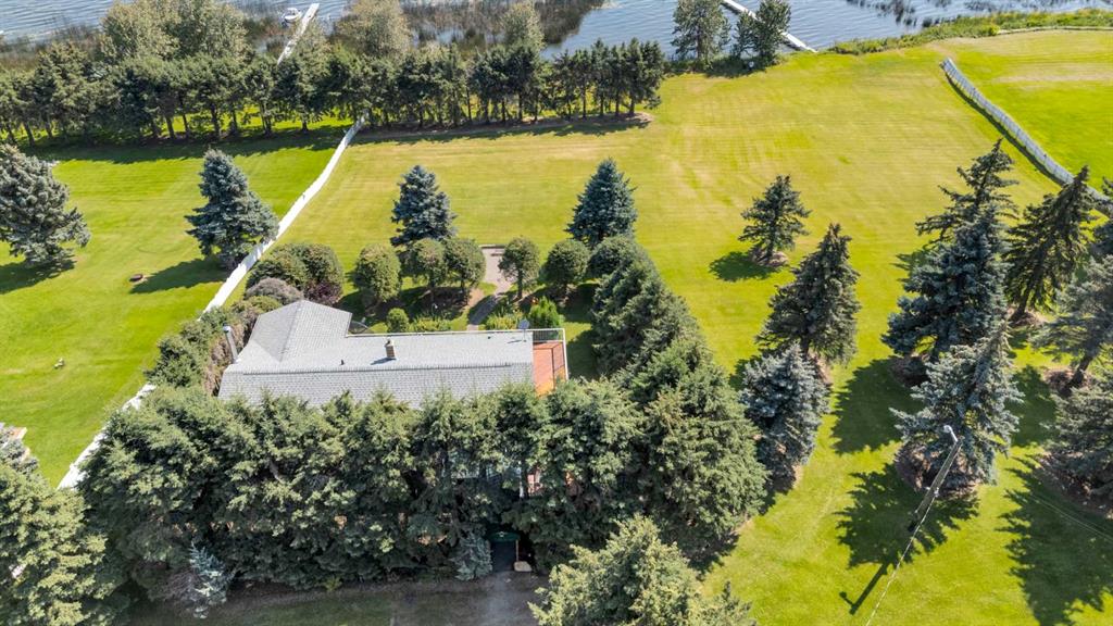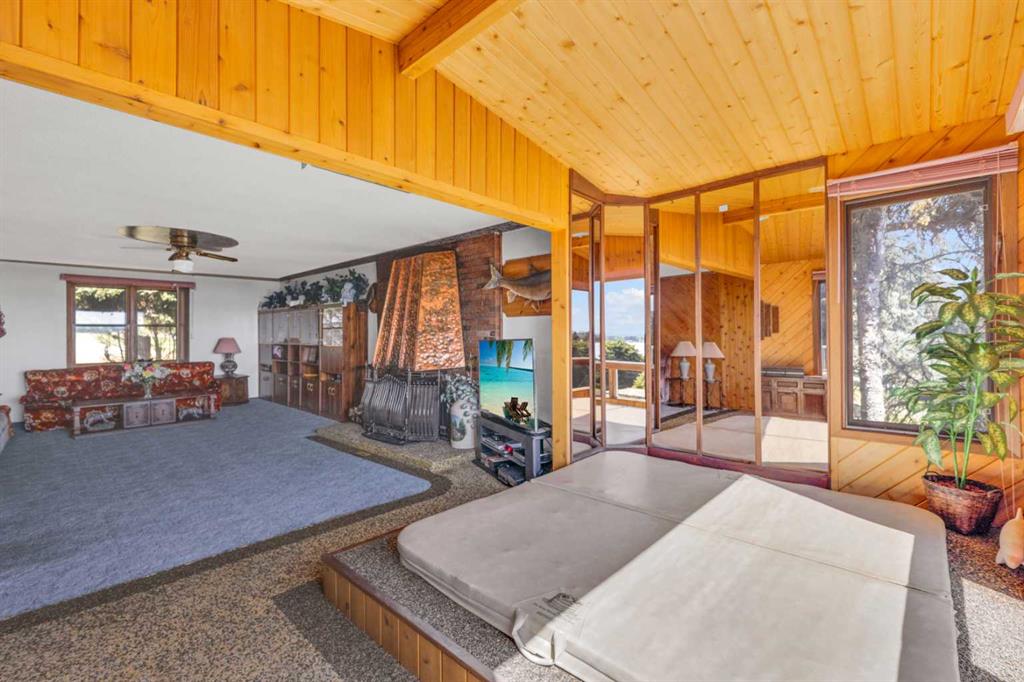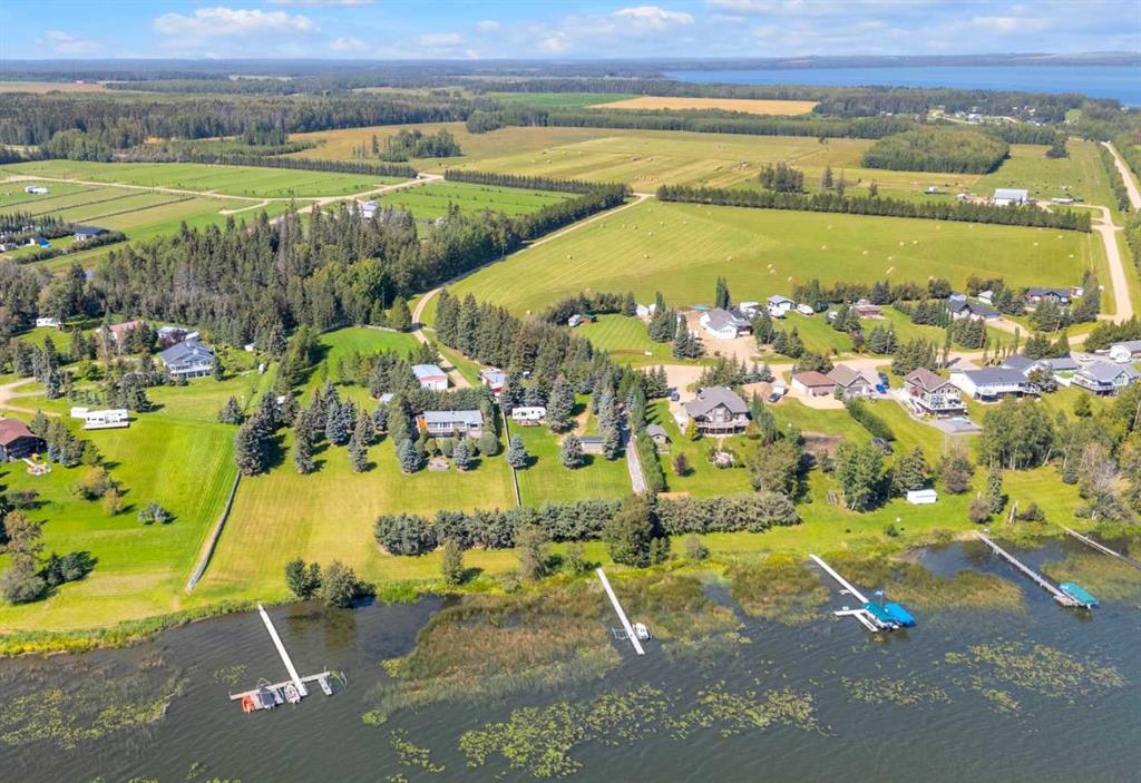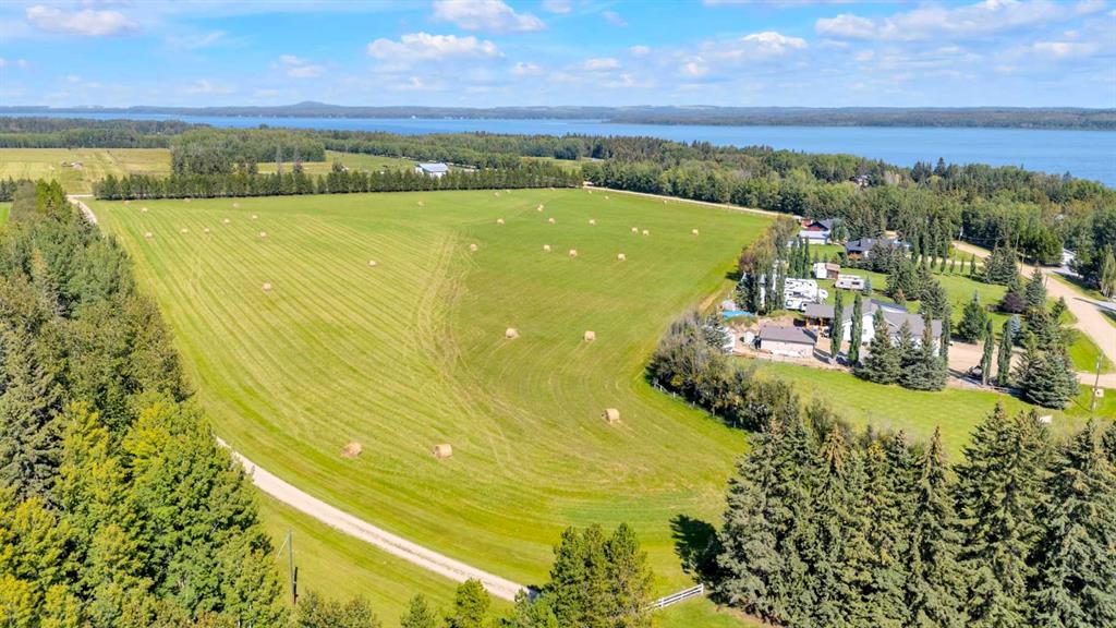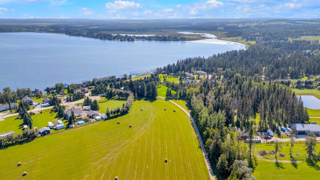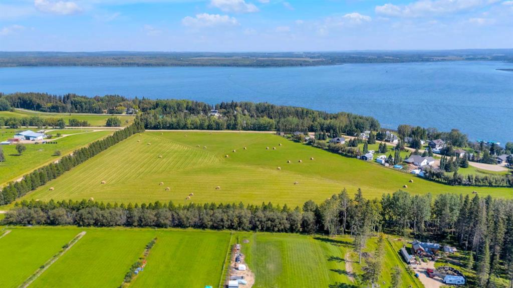 Rich in history, this grandeur lakeside acreage is amoung the last of its kind! The waterfront views offer breathtaking sunsets and morning sunrises you cannot wait to wake up to. Wide open skies above the custom designed fire pit area elevate your star gaze while mature landscaping and farm land surrounds you in privacy. Spanning across 250 feet of shoreline access, let your dreams sore! Step onto the wrap around deck and into the main level where the kitchen and dining room take full advantage of southeast facing lake views. Cozy up in the east wing where the hot tub overlooks the lake and the fireplace connects the spacious living room. Two bedrooms and 5pc bathroom complete the main floor. Downstairs, the character of this 1960s farm home shines. With room to develop as you like, the walk out basement would make for a great games room, wet bar area or hobby space. Currently used for generous storage, it also features a bathroom, laundry and bedroom. Step outside and nestle into the covered patio area. Listen to the sounds of birds sing and gentle crash of waves along the docks. Thoughtful landscaping highlights the historic roots where Hiland Spruce Estates originated; boasting perfect blends of sun and shade. The NE corner of homesteading acres even features an adorable school house, rustic trapper’s cabin and well built 24’ x 14’ shed. The large 32’ x 46’ shop is a mechanic’s dream; heated with full size furnace, insulated, concrete pad, windows and 220 power. An expansive machinery shop with more than enough room to park all the vehicles, equipment and toys; features 30 amp RV power and 220v as well! The heightened addition also offers excellent dry storage. Home updates over the years include septic field, water well, shingles and vinyl siding, plumbing, electrical, furnace and remodeled design to its time of the early 90s. Over 27 acres boasting lake front views with flexibility to enjoy as your very own lakeside retreat or a rare investment portfolio addition – spectacular opportunity awaits!