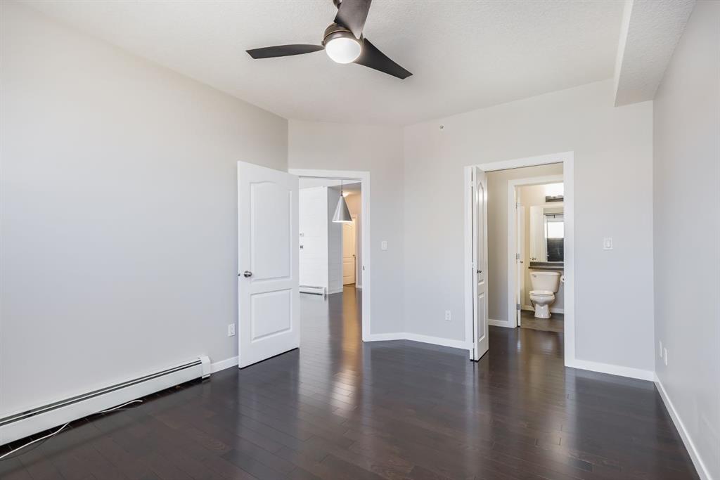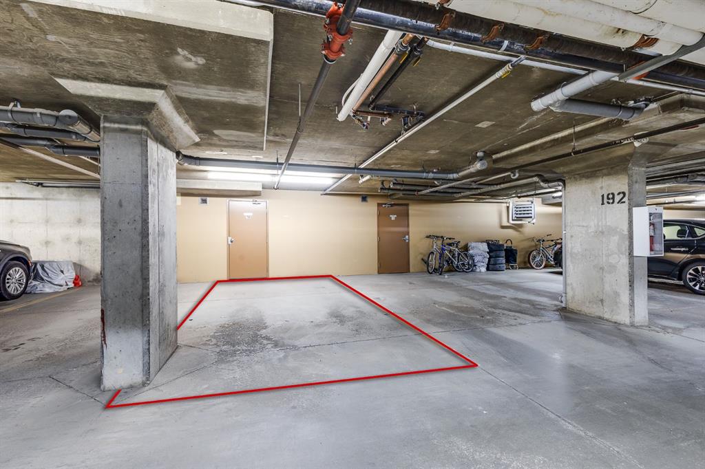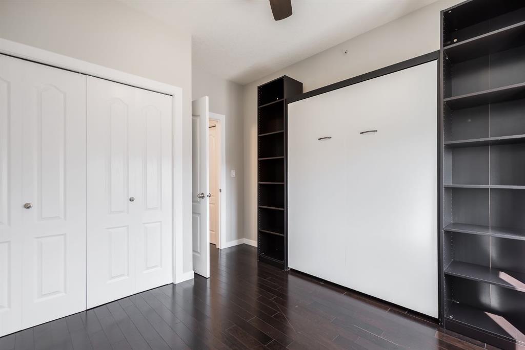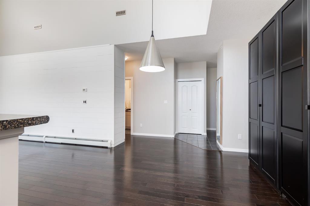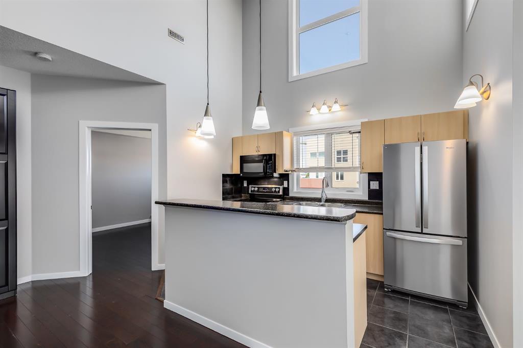 NEW PRICE NOV 3rd ** RARE OPPORTUNITY to own this Gorgeous Top Floor, Corner Unit with Soaring Cathedral Ceilings, Large Private Deck, and has an Underground Parking Stall. ** This Fantastic 2 Bedroom, 2 Bathroom Condo has 960 sqft of Amazing Living Space and is Ready for a QUICK POSSESSION. When you enter this Condo, you will immediately notice the Private Foyer that has a Large Storage Room off the entry. The HARDWOOD FLOORS welcome you to the Main area that has the EXPANSIVE 18' HIGH CATHEDRAL CEILING that allows lots of Natural Light from the Extra Windows. The Living Room has a great Shiplap Wall and Opens to the Oversized Deck that is private and has great space for your Patio Furniture. The Kitchen has a Large Island and Newer Stainless Steel Appliances, and opens to the Dining Area that has a Built in Wall Unit for extra storage. The Primary Bedroom is 14'1" x 11'3" and has a Walk through Closet to the 4 pc Ensuite. Bedroom 2 is 10'3" x 12'1", is located on the opposite end of the Condo and includes a Murphy Bed for your Guests with the 4 pc Main Bathroom steps away. There is also a Laundry Room. The Condo includes an Underground Parking Stall. This Great Complex is located beside Genesis Place which is perfect for Lifestyle Living if you are active and want swim, skate, work out in the Gym, or partake in the many classes provided. It is also close to Transportation, and Dining. Condo fees include all your utilities except electricity. Pets are allowed with Board Approval.