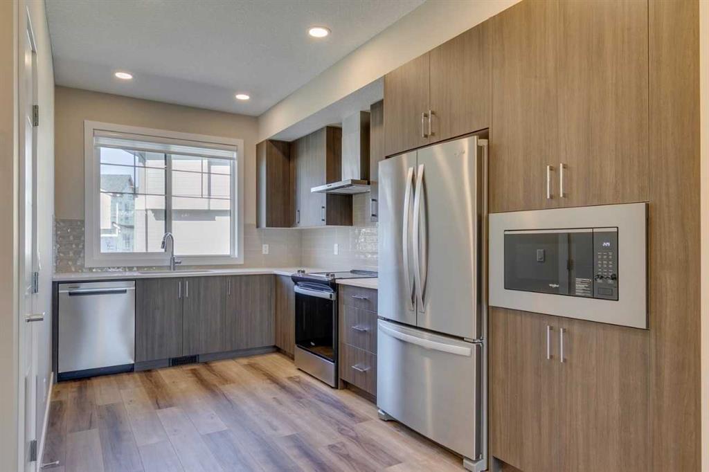 Welcome to Chelsea Court and the impressive "Regent" townhome by Trico Homes, one of Calgary’s premier local builders. This thoughtfully designed residence features 2 bedrooms, 2.5 bathrooms, and over 1,301 square feet of well-planned living space. On the entry level, you'll find a versatile closed flex room with a closet and an oversized one-car attached garage. The main floor offers a private front deck with a gas line, perfect for enjoying views of the green spaces and walkways. Inside, the open-concept layout is highlighted by 9-foot ceilings, four flush-mounted LED lights in the great room, and a modern kitchen equipped with quartz countertops and semi-built-in stainless-steel appliances. Additional features include a rough-in for air conditioning and zebra blinds on all windows to ensure comfort throughout the year. Upstairs, the owner’s bedroom includes a spacious walk-in closet and a private 4-piece ensuite. Photos are representative