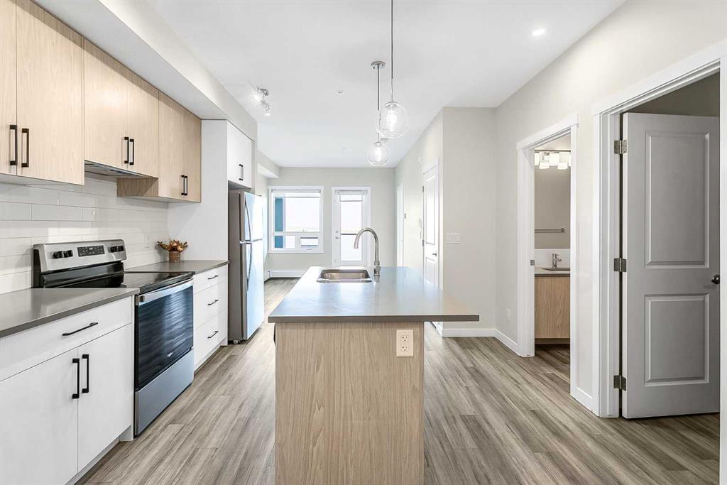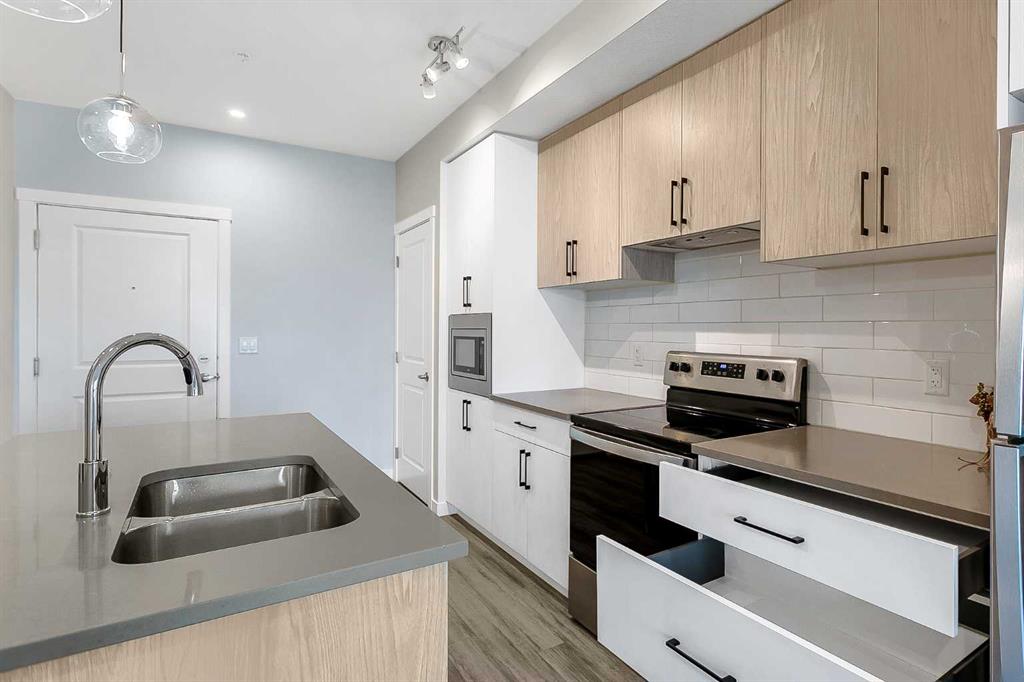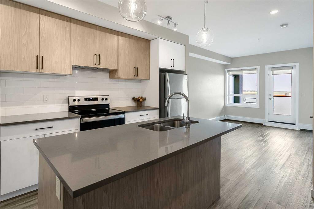 Lovely two bedroom apartment located in the Q2 building of Sage Hill Quarters. The location is second to none for convenience - walk to groceries, dining, child care, drug stores, just to name a few. This apartment condo features two bedrooms, two full bathrooms, plenty of living space, underground parking and titled storage. The east facing balcony is private and floods the apartment with early morning sun. The end unit is situated close to the elevators for easy access and with the stairwell on the south side only shares one common wall. Modern fixtures and finishings give the apartment an open airy feeling. Light, bright and inviting kitchen features plenty to storage space, soft close cabinets and quartz countertops for easy maintenance. The primary bedroom features huge windows, a large walk in closet, and a private ensuite. The secondary bedroom is large with a closet for extra storage and easy access to the fully appointed main bathroom. Plenty of living space will make this condo a cozy, beautiful space to live. Sage Hill is close to the airport and easy access main feeder roads make this location a fantastic option.