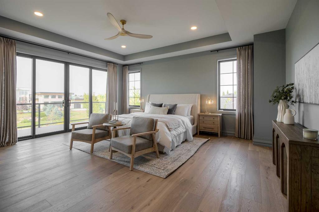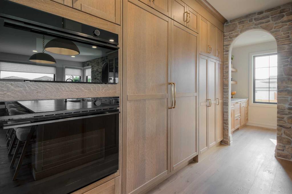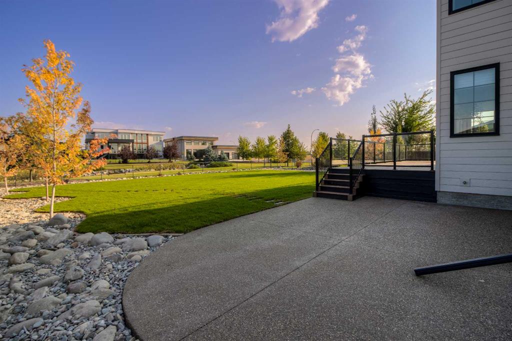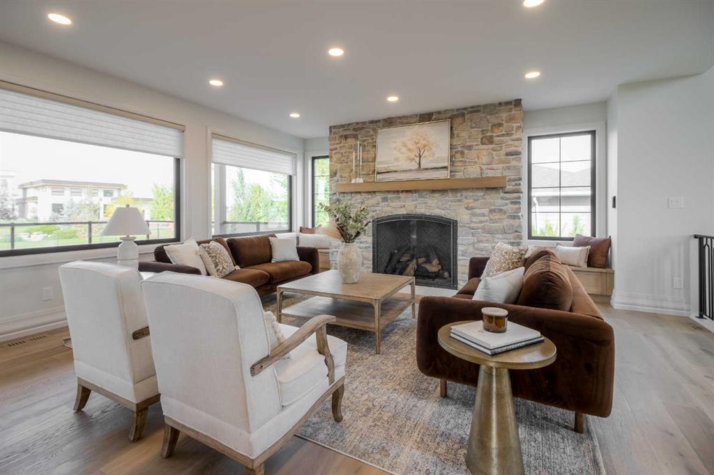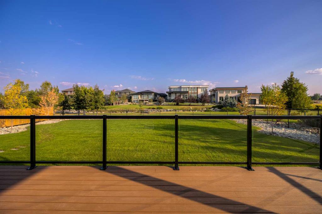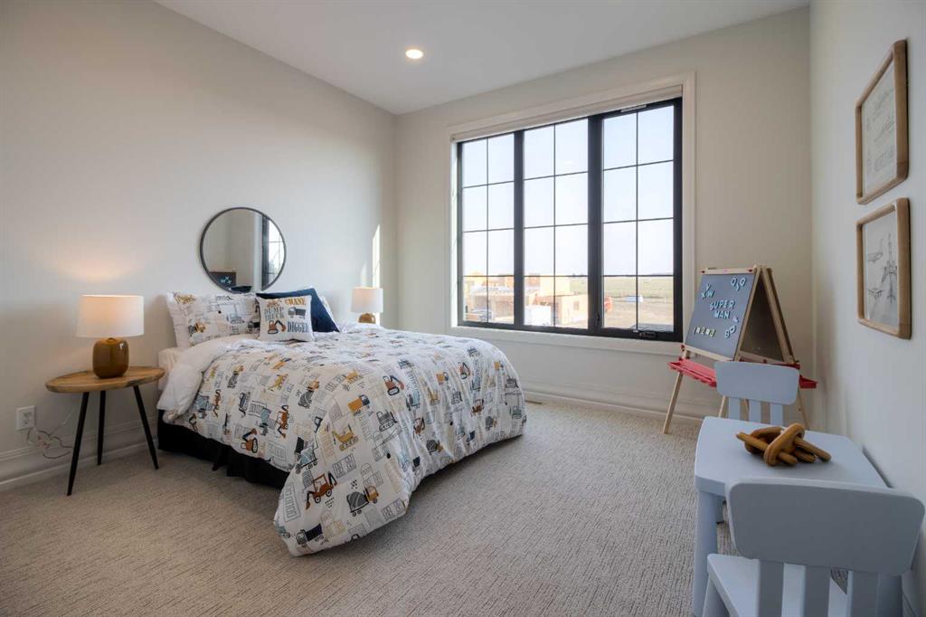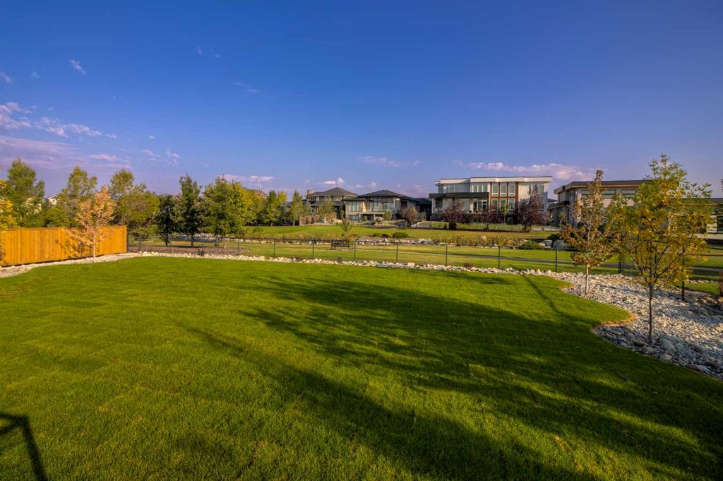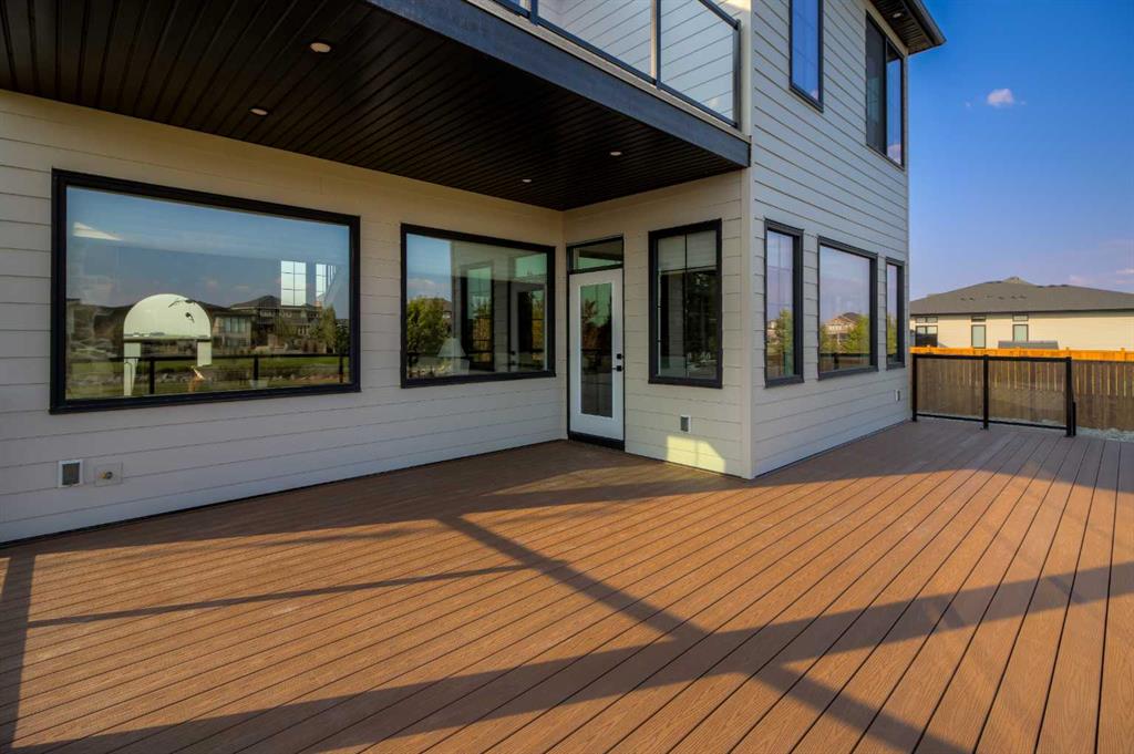 Welcome to the Meadow by Stranville Living Master Builder, located in the premier estate living community of Prairie Arbour Estates. This elegant two storey home boasts 4,417 square feet of developed area spread over three spacious levels in one of most thoughtful layouts you're likely to see. Where do we start? The French country exterior combines natural tones in acrylic stucco, fiber cement siding, and stone work with bold roof lines and dark contrasting windows. Large panes of high efficient glass envelope the home providing significant volumes of natural light and tranquil views of the huge yard and of Prairie Arbour's pond and walking paths. Fresh landscaping throughout the 1/3rd acre lot includes several trees, irrigated sod, exposed aggregate sidewalks, and a playful stone pathway to the park; all surrounded by a brand new privacy fence with two gates. Heading inside the home, the front entry foyer towers up 16' where a dramatic chandelier sets the tone for what lies ahead. Up a few stairs into the family room, you immediately get a feel for the expansive main floor with clear views to the kitchen, dining room, and out to the back yard and the 576 square foot composite deck. The kitchen is bathed in white oak cabinetry with gold accents, and includes a premium appliance package by Fisher & Paykel, consisting of a paneled double fridge-freezer combo, gas cooktop with flat top, and wall mounted microwave and oven. More storage and counter space can be found adjacent the kitchen in the butler's pantry, which is finished in the same beautiful Davinci Leathered Quartzite as the kitchen. The large dining area easily seats 8-10 guests and is surrounded by glass and Hunter Douglas window coverings when privacy is on the menu. An executive style corner office that completes the main floor is drenched in dark tones and is accented by built-in shelving and even more windows. The second floor is the heartbeat of this terrific family home. The massive primary suite has an amazing private balcony overlooking the backyard and park, perfect for early mornings or late nights. Warm your feet on the heated floors of the primary ensuite bathroom, which is fitted with a lengthy double sink vanity with illuminated mirrors, a large custom tiled shower, and a sultry soaker tub. Two more large auxiliary bedrooms and a corner media room maximize the use of space on the second level. This caliber of home requires full development and Stranville Living really wanted to show what could be done with the 1,358 square feet available in the basement. Tune your game and tee up on a premium golf simulator located beside a large family room, full 4-piece bathroom, another auxiliary bedroom, and a wet bar. I could list all of the upgrades in this home, but I'd rather you see it than read it. To fully appreciate what this home offers, you need to spend some time in it. There's nothing like NEW!