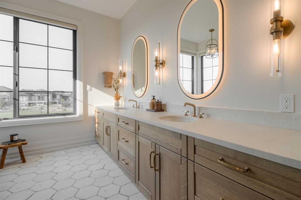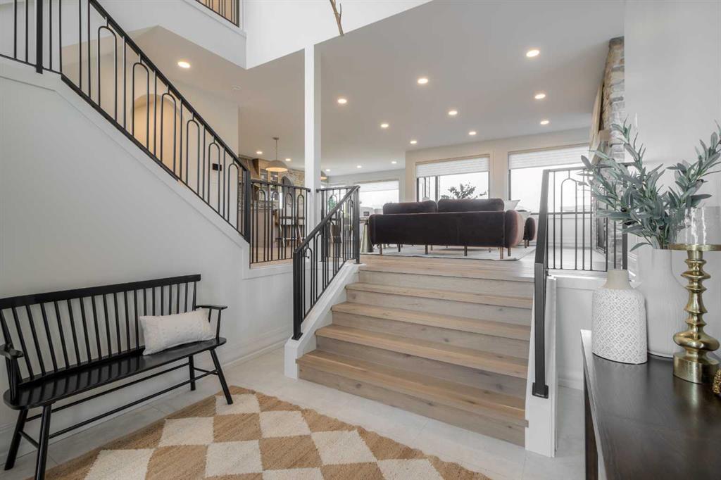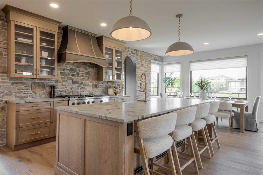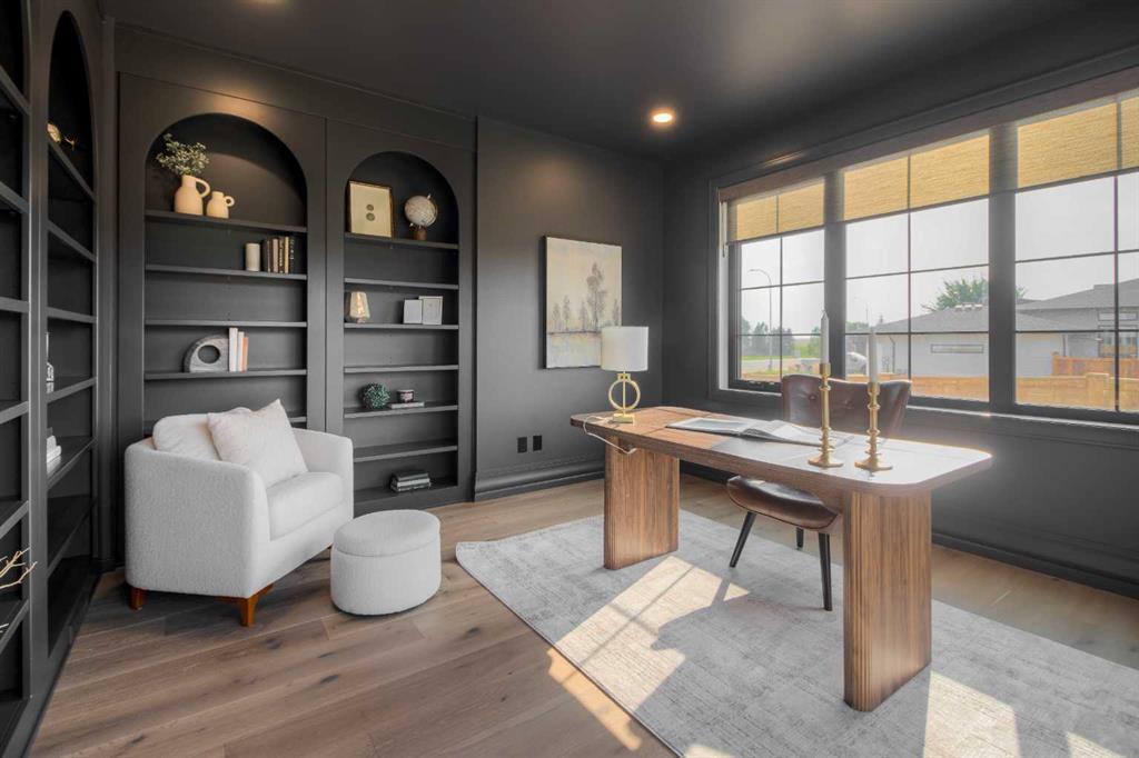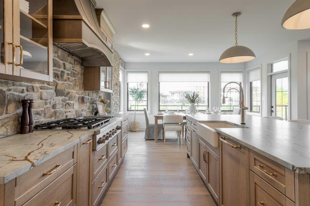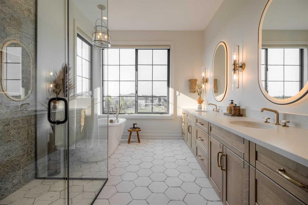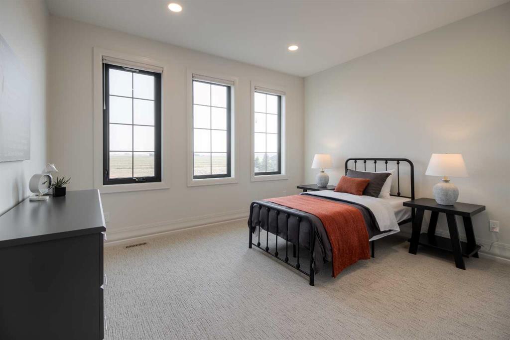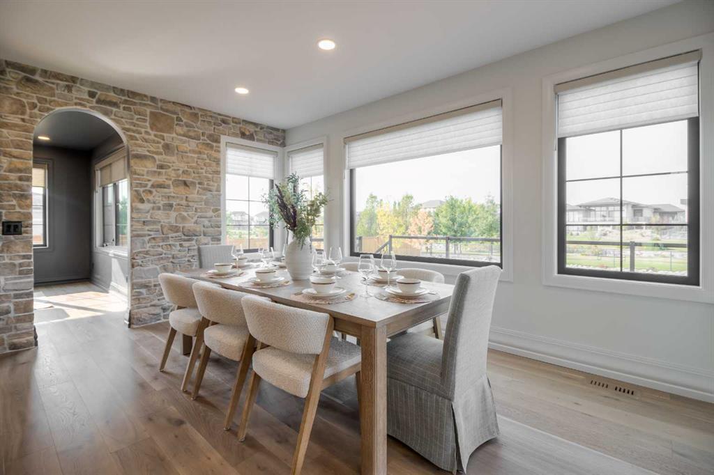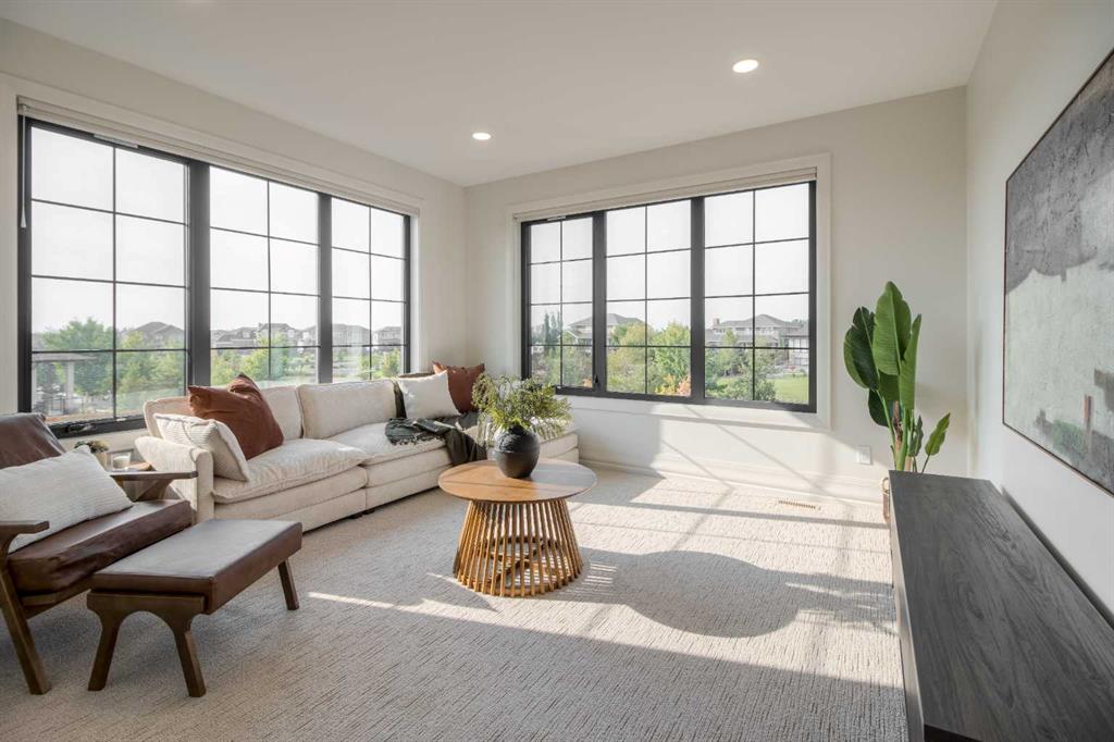 Welcome to the Meadow by Stranville Living Master Builder, located in the premier estate living community of Prairie Arbour Estates. This elegant two storey home boasts 4,417 square feet of developed area spread over three spacious levels in one of most thoughtful layouts you're likely to see. Where do we start? The French country exterior combines natural tones in acrylic stucco, fiber cement siding, and stone work with bold roof lines and dark contrasting windows. Large panes of high efficient glass envelope the home providing significant volumes of natural light and tranquil views of the huge yard and of Prairie Arbour's pond and walking paths. Fresh landscaping throughout the 1/3rd acre lot includes several trees, irrigated sod, exposed aggregate sidewalks, and a playful stone pathway to the park; all surrounded by a brand new privacy fence with two gates. Heading inside the home, the front entry foyer towers up 16' where a dramatic chandelier sets the tone for what lies ahead. Up a few stairs into the family room, you immediately get a feel for the expansive main floor with clear views to the kitchen, dining room, and out to the back yard and the 576 square foot composite deck. The kitchen is bathed in white oak cabinetry with gold accents, and includes a premium appliance package by Fisher & Paykel, consisting of a paneled double fridge-freezer combo, gas cooktop with flat top, and wall mounted microwave and oven. More storage and counter space can be found adjacent the kitchen in the butler's pantry, which is finished in the same beautiful Davinci Leathered Quartzite as the kitchen. The large dining area easily seats 8-10 guests and is surrounded by glass and Hunter Douglas window coverings when privacy is on the menu. An executive style corner office that completes the main floor is drenched in dark tones and is accented by built-in shelving and even more windows. The second floor is the heartbeat of this terrific family home. The massive primary suite has an amazing private balcony overlooking the backyard and park, perfect for early mornings or late nights. Warm your feet on the heated floors of the primary ensuite bathroom, which is fitted with a lengthy double sink vanity with illuminated mirrors, a large custom tiled shower, and a sultry soaker tub. Two more large auxiliary bedrooms and a corner media room maximize the use of space on the second level. This caliber of home requires full development and Stranville Living really wanted to show what could be done with the 1,358 square feet available in the basement. Tune your game and tee up on a premium golf simulator located beside a large family room, full 4-piece bathroom, another auxiliary bedroom, and a wet bar. I could list all of the upgrades in this home, but I'd rather you see it than read it. To fully appreciate what this home offers, you need to spend some time in it. There's nothing like NEW!