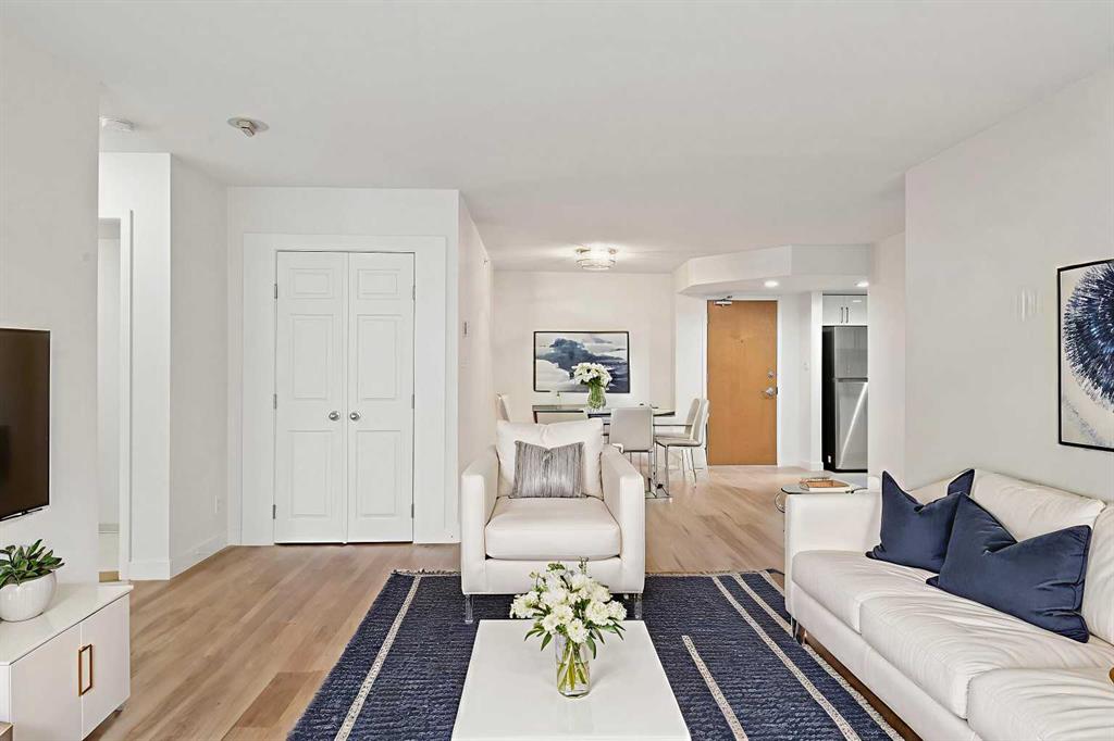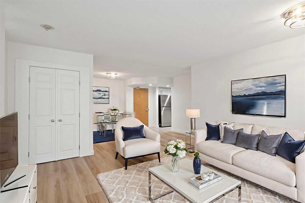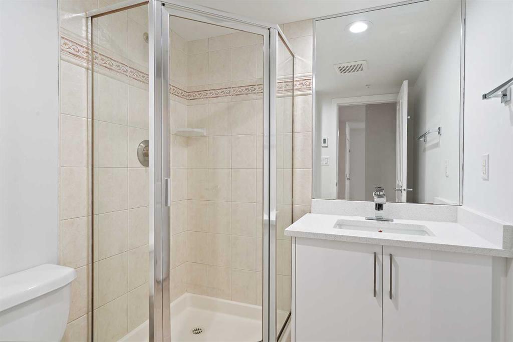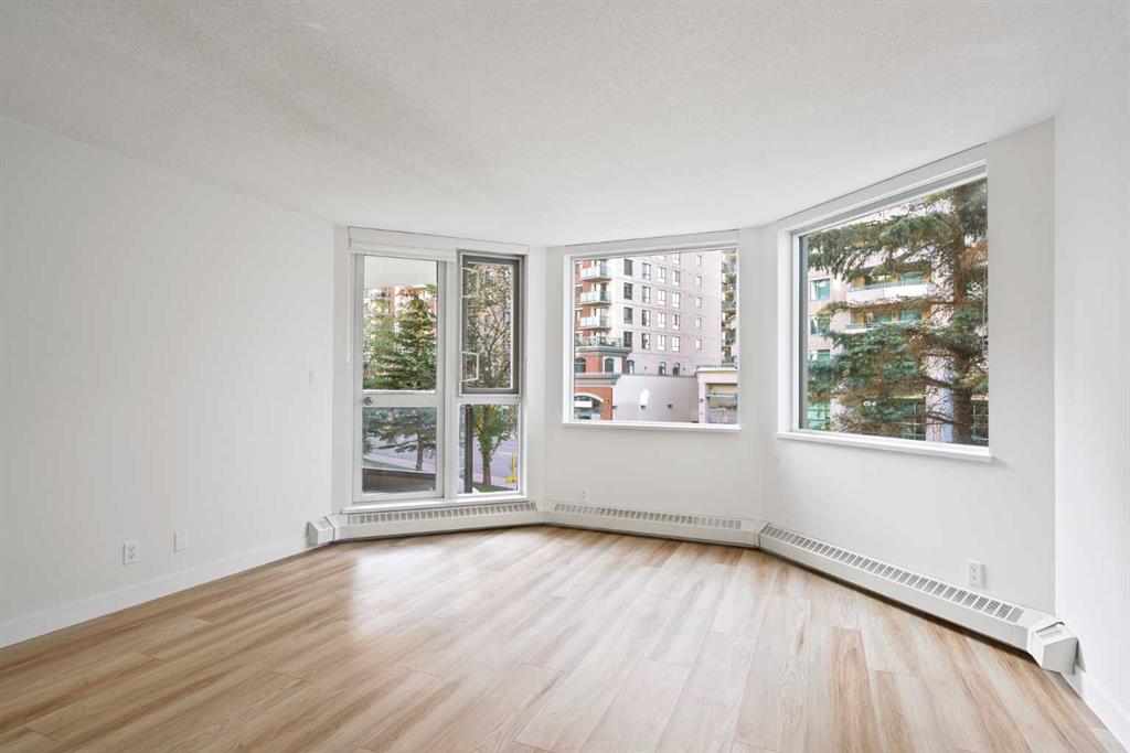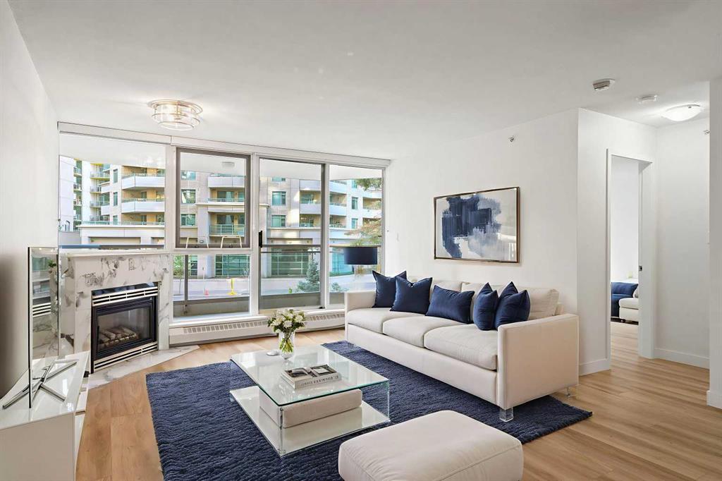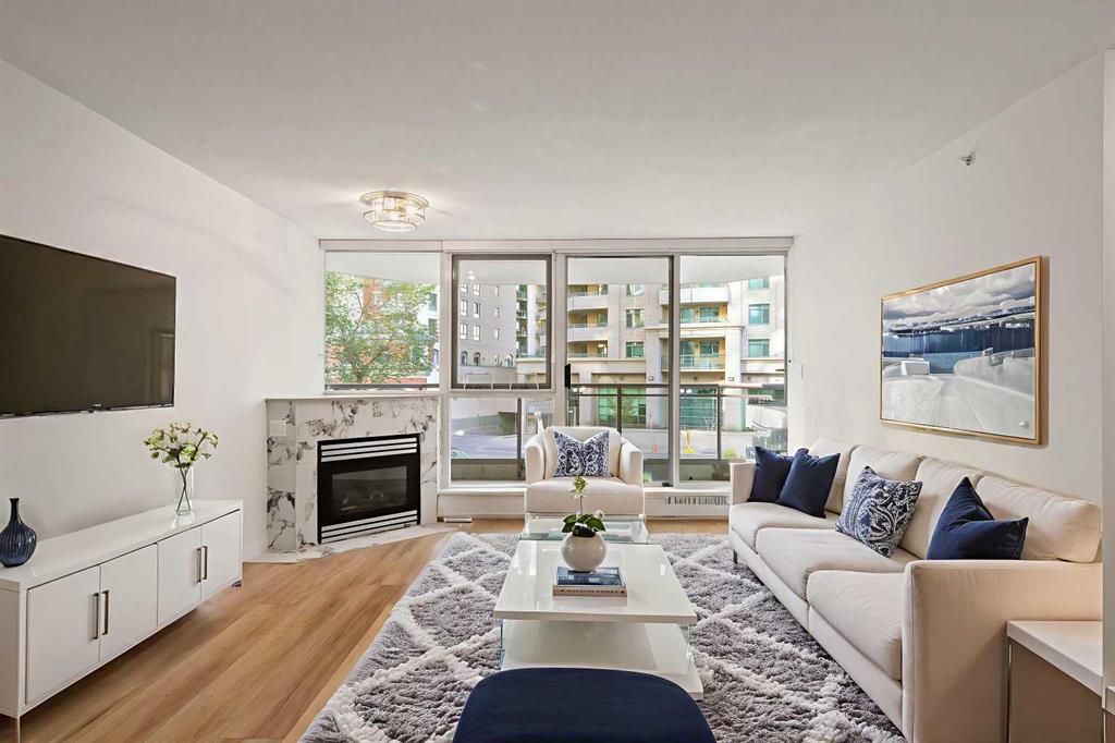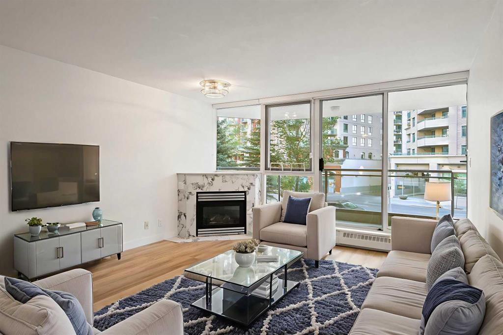 Ideally located in the quiet west end of downtown, this renovated 2-bedroom, 2-bathroom unit in The Marquis offers nearly 1,000 sq ft of bright, open-concept living space. Just steps from the Bow River pathways and only 2 minutes to the C-Train (within the free fare zone). Features include granite countertops, new stainless steel appliances, vinyl plank flooring, a gas fireplace, and a south-facing, tree-lined balcony. The oversized primary bedroom includes a full ensuite and direct balcony access. The second bedroom is situated near the second full bathroom, ideal for guests or roommates. Additional conveniences include quick stair access (bypassing elevator wait times) and close proximity to the titled underground parking stall. Building amenities include a fitness center, yoga studio, party room, landscaped courtyard, secure bike storage, and visitor parking. Pet-friendly building (with board approval; under 20 lbs). Walkable location close to Kensington, river trails, cafes, restaurants, and downtown amenities.
