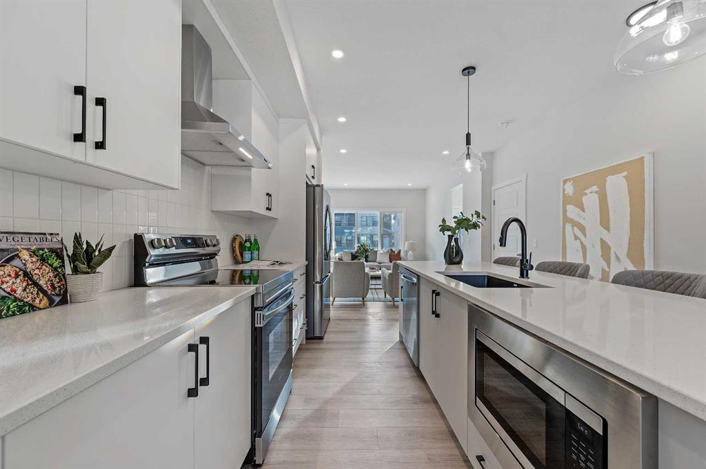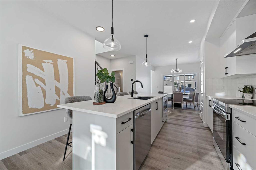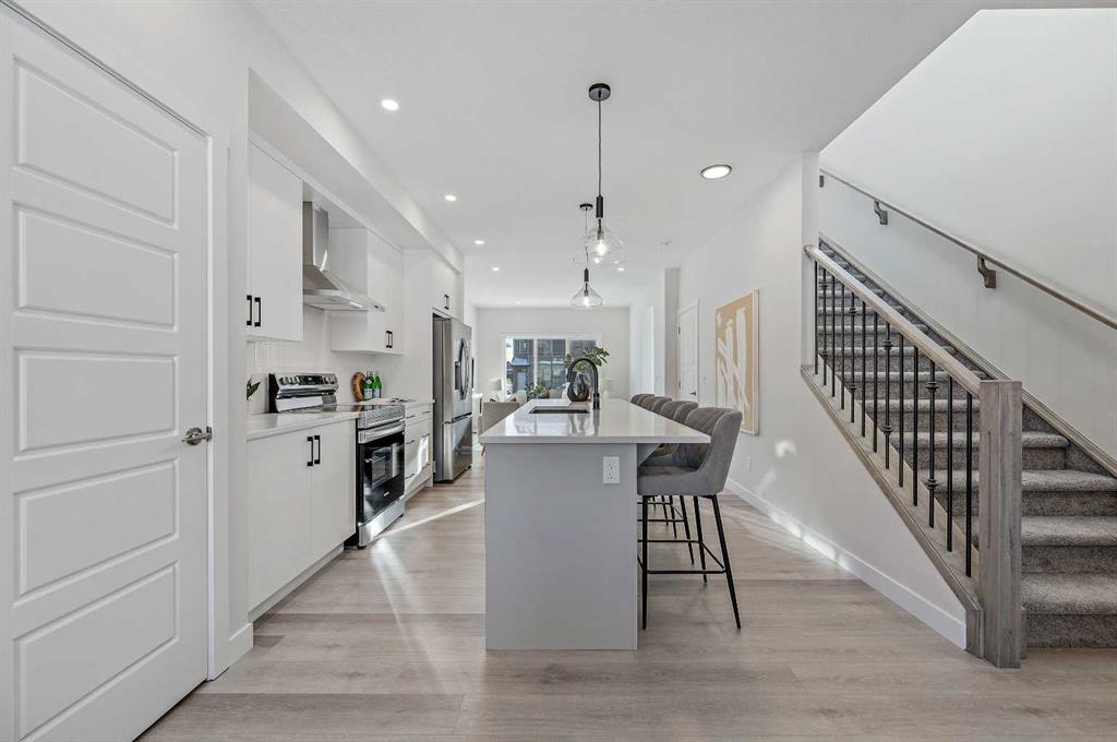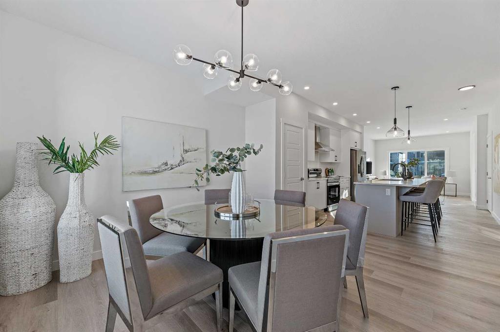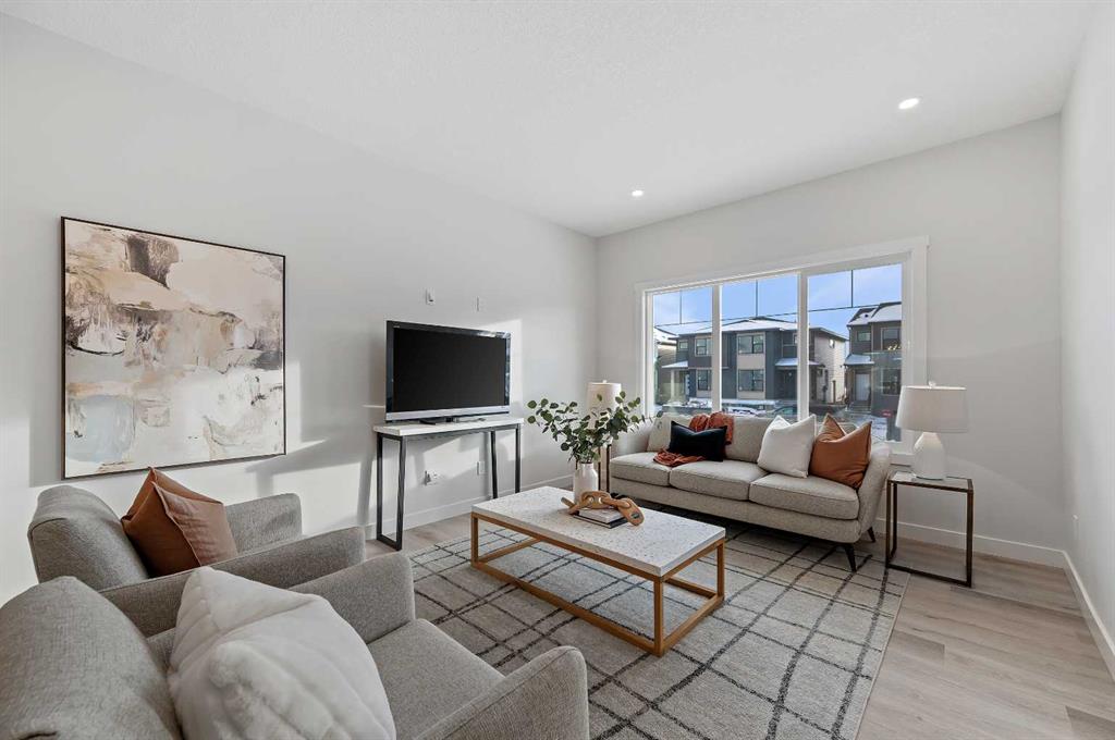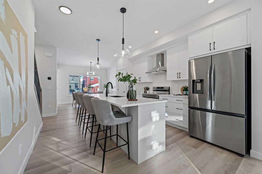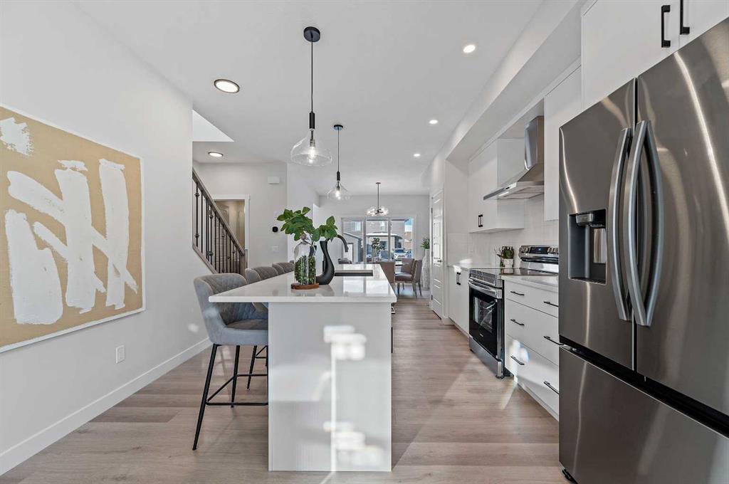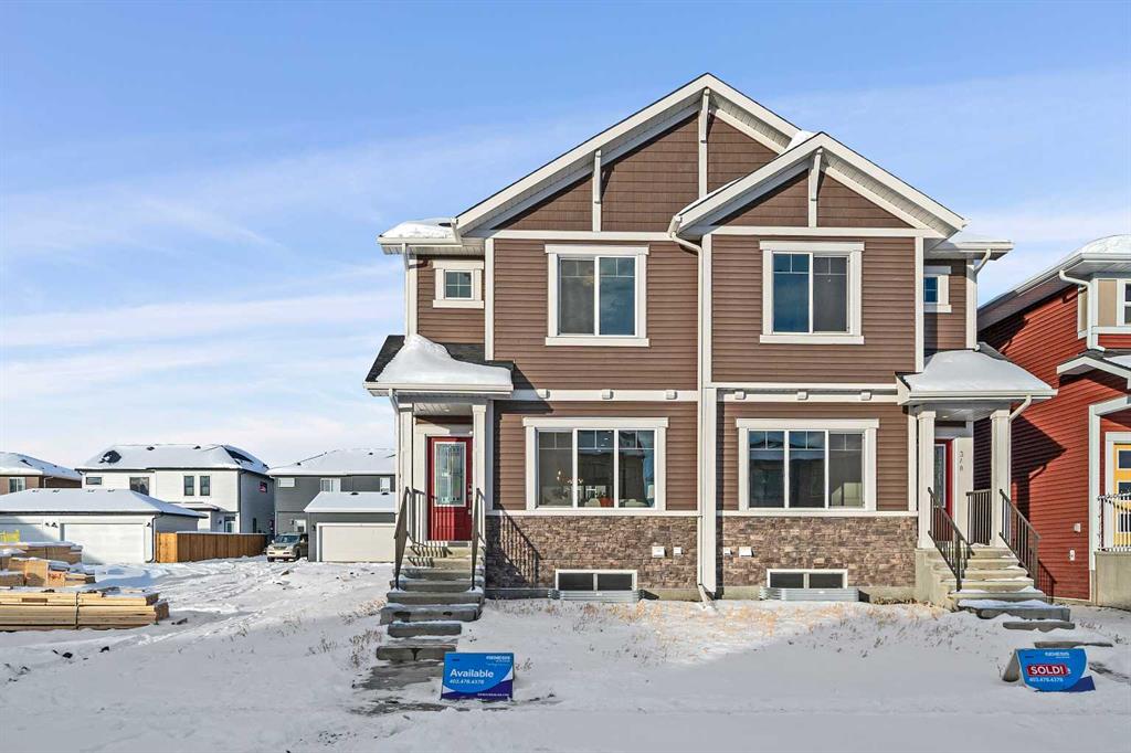 Welcome to 344 Fireside Drive in the family-friendly community of Fireside, Cochrane. This thoughtfully designed two-story duplex offers bright open-concept living and modern finishes throughout. The main floor features 9’ ceilings, luxury vinyl plank flooring, and a spacious kitchen with quartz countertops, full-height cabinetry, stainless steel appliances, a built-in microwave, and a large island with seating and ample storage. The living room is located at the front of the home with large windows that bring in natural light, creating a welcoming space for everyday living and entertaining. A half bath and stylish entryway complete this level. Upstairs offers three bedrooms, two full bathrooms and a convenient laundry space. The primary suite includes a walk-in closet and a private ensuite with a double vanity. Two additional bedrooms and a full bath provide space for family or guests, and a hallway linen closet adds extra storage. The basement includes rough-ins and plenty of open space. This home also features a side entry, 9’ foundation, upgraded railing, a gas line to the kitchen range and a gas line for BBQ. Exterior details include a Craftsman-inspired elevation with stone accents, a concrete front landing and a double parking pad out back. Fireside is a vibrant community with two schools, extensive parks and pathways, and local shops and services. It also offers quick access to the Rocky Mountains, downtown Cochrane and an easy commute into Calgary. Area size was calculated by applying the RMS to the blueprints provided by the builder.