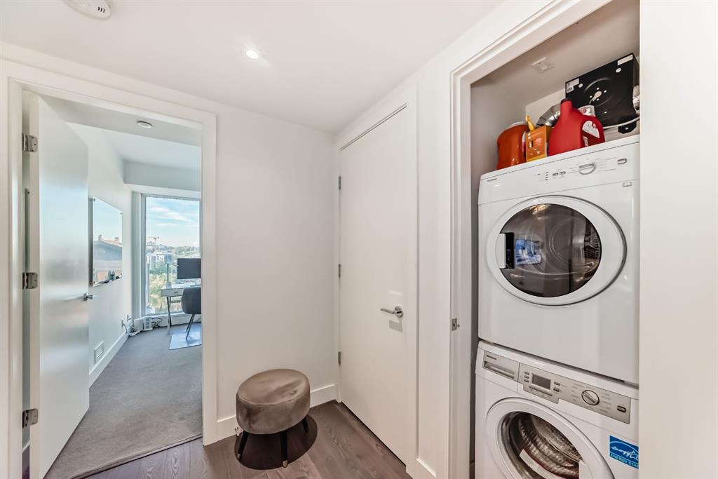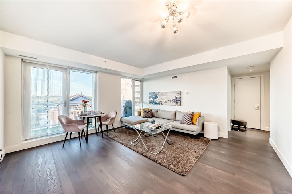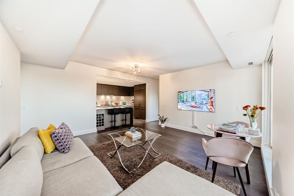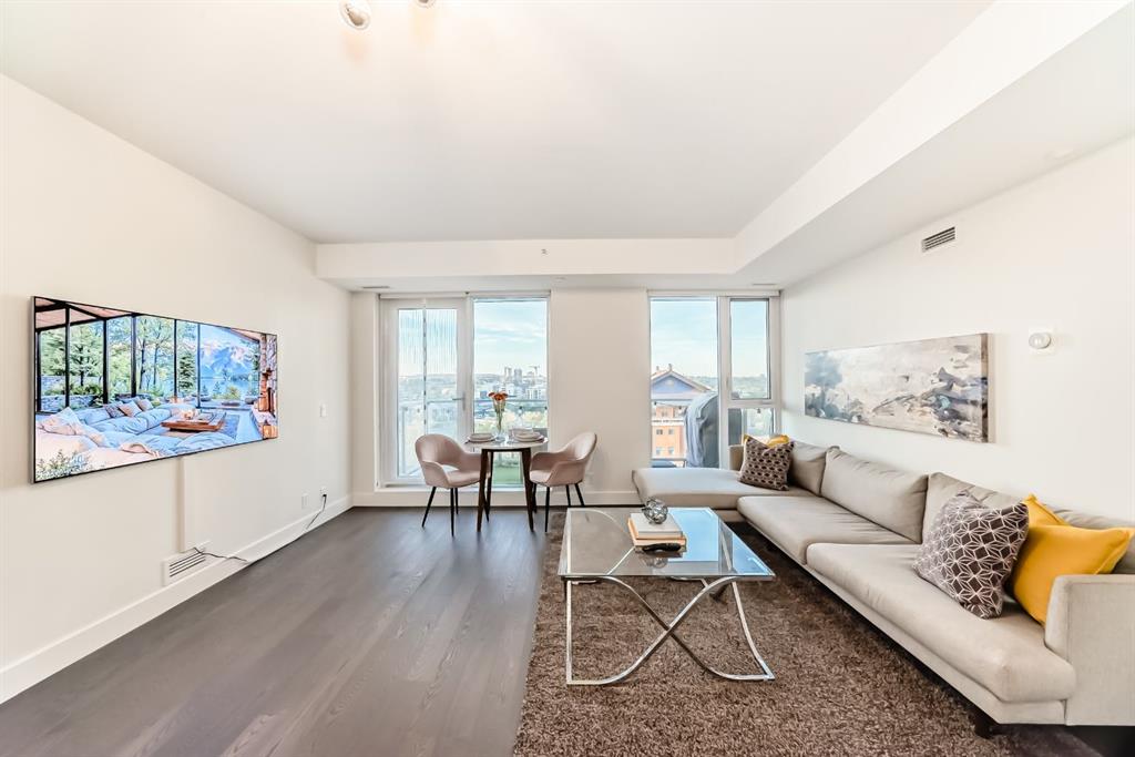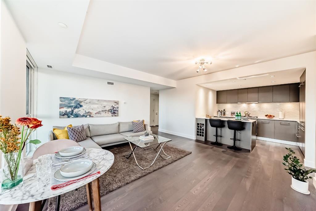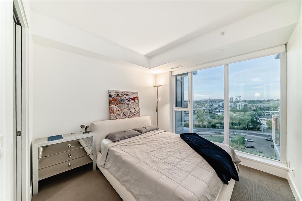 Welcome to this breathtaking 2-bedroom, 2-bathroom residence featuring an award-winning floor plan and unbeatable views from every corner. Step onto your west-facing balcony and take in stunning sunsets overlooking the Bow River and mountains. Inside, you’ll find upgraded engineered hardwood floors and a chef-inspired kitchen complete with a panelled fridge, built-in oven, microwave, and a massive island—perfect for entertaining. The spacious living room includes a cozy nook, while the primary suite offers a generous walk-in closet and a luxurious ensuite with double vanity, soaker tub, and standing shower. The secondary bedroom is ideal for kids, guests, or a home office, with the second bathroom upgraded to a full standing tiled shower. This quiet, non-smoking, pet-free unit is in immaculate condition and comes with in-suite laundry, a titled underground parking stall, and a titled storage unit. Building amenities include: 24hr concierge & security Dog wash station & bike workshop in the parkade 11 visitor parking stalls Daily professional maintenance & cleaning Fitness centre and elegant lobby Mostly resident-owned units (no short-term/Airbnb rentals allowed) Located just a 3-minute walk to the Bow River pathways and 5 minutes to the Downtown West-Kerby C-Train station, you’ll enjoy quick access to downtown, dining, shopping, and parks. This is the perfect blend of luxury, lifestyle, and location.