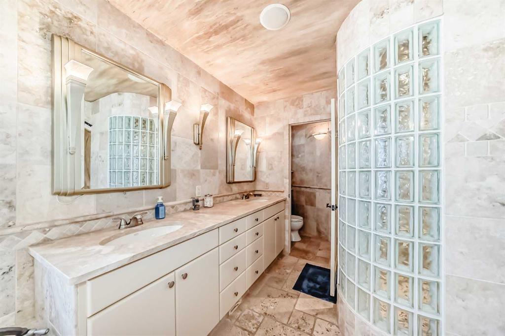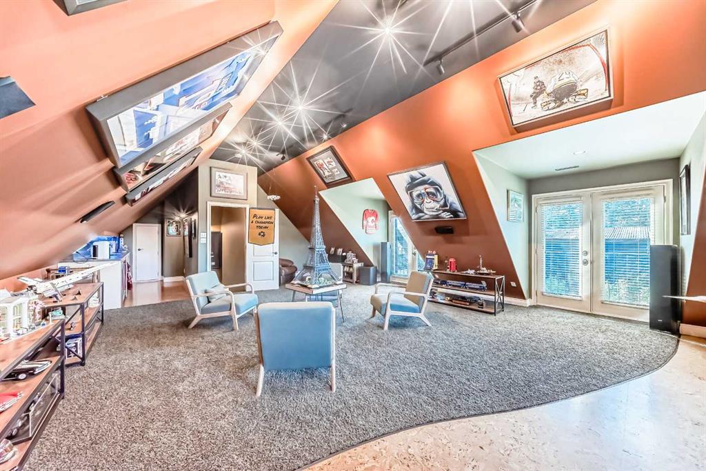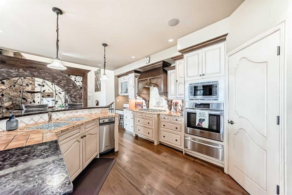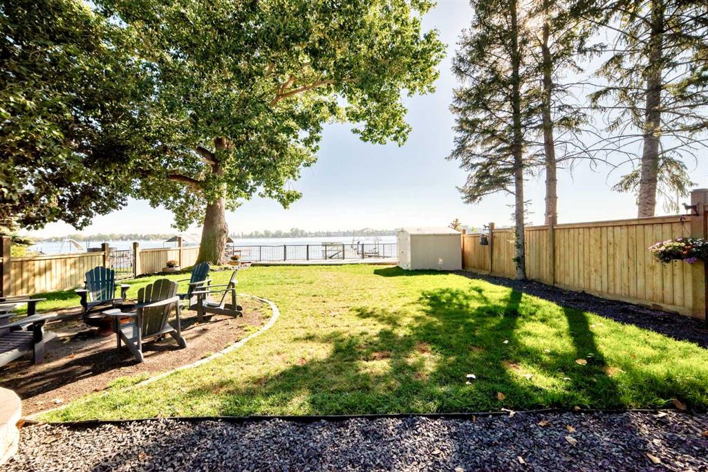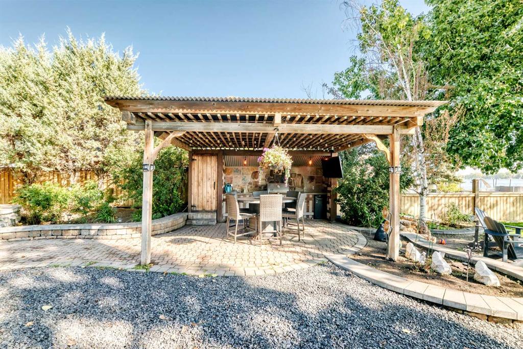 Luxury Lakeside Living in Chestermere! Experience custom-designed elegance in this immaculate home, perfectly situated on Chestermere Lake. Built in 2003, this residence boasts European flair and an array of high-end upgrades throughout its three finished levels. Step inside to discover travertine and hardwood flooring, 12-foot ceilings, and unique craftsmanship in every room. The gourmet kitchen is a chef's dream, featuring custom cabinetry, granite countertops, a huge working island with an eating bar, and upgraded stainless steel appliances. It seamlessly flows into the dining room and great room, both offering picturesque views of the beautifully landscaped yard, outdoor kitchen, stone patio, and the lake. The main level has in-floor heating and includes a den, a convenient half bath, and a bedroom with a 3-piece ensuite and walk-in closet. A striking tiered waterfall divides the family room and kitchen, complementing the one-of-a-kind stone fireplace. Upstairs, the expansive master suite is a true retreat with open ceilings, a fireplace, large windows showcasing lake views, a walk-in closet, and a luxurious 5-piece ensuite with a corner tub, European shower, and two sinks. A large bonus room over the garage offers vaulted ceilings, cabinets, and a sink, perfect for entertainment or a home office. The ultimate "man's dream" garage is insulated, drywalled, heated, and includes running hot water and a bathroom, it also has in-floor heating. . Additional features include an energy-efficient furnace, central air conditioning, an underground sprinkler system, and wiring for CAD 5 and a speaker system throughout.There is a new boiler system as well as Gemstone lighting on the exterior. Enjoy exceptional outdoor living with direct lake access, dock and boat lift, and a beautifully fenced and treed lot. This home is a must-see, showing 10 out of 10! With 3,646 square feet of above-grade living space, this property combines luxury, comfort, and breathtaking lakeside views.