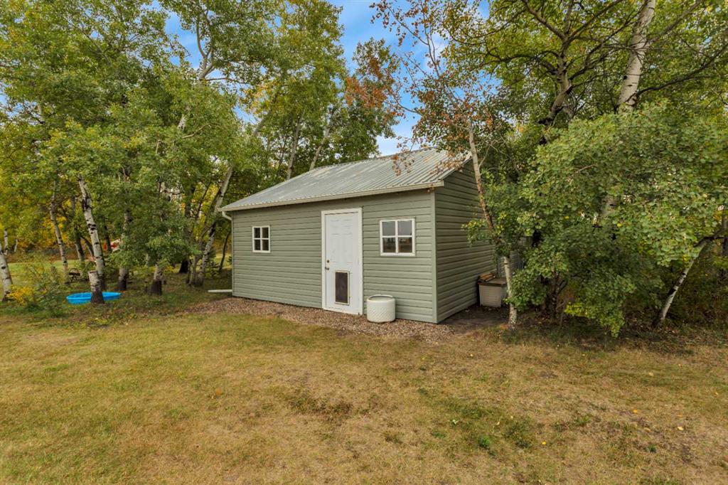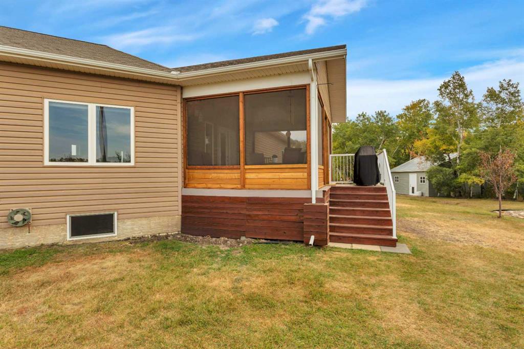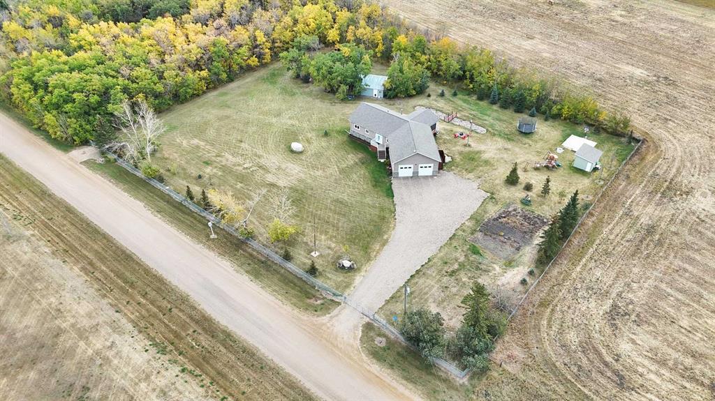 Just 3 minutes east of Stettler, this 2-acre family acreage offers the perfect balance of country privacy and town convenience. From the moment you arrive, pride of ownership is clear - not only in the home, but across every corner of the property. Outdoors, it’s all about space to play, relax, and gather. A fully finished powered playhouse, mini basketball court, play structure, garden space, and firepit retreat create endless opportunities for family connection. The property is fully fenced and gated with dual entrances, offering both privacy and practicality. Mature trees, new plantings, and natural brush with mowed pathways bring a secret-garden feel, while a rock bed and bridge feature, expansive lawn, screened-in porch, separate workshop, and garden shed complete the outdoor retreat. With municipal water to the home and well water for all exterior use, the acreage is as functional as it is beautiful. Inside, the main floor welcomes you with bright, open living spaces designed for ease and comfort. The modern kitchen with island and pantry flow seamlessly into the dining are and living room with high ceilings and a cozy wood-burning fireplace, not to mention access to your screened in deck and yard. The primary suite includes a walk-in closet and private 3-piece ensuite, while an additional bedroom and main bathroom provide convenience for family life. Main-floor laundry adds to everyday practicality as well. Downstairs, the fully finished basement expands the living space with two more bedrooms, an additional bathroom, and a large open family/rec area - perfect for movie nights, kids’ play, or hosting friends. Built in 2009, this home was constructed with an ICF (Insulated Concrete Form) foundation, providing exceptional strength, durability, and year-round comfort. Paired with a geothermal heating and cooling system that regulates temperatures efficiently - keeping utility costs lower while offering a consistent, eco-friendly climate. Together, these features ensure a home that’s not only modern and welcoming, but also built for long-term sustainability. This acreage is designed for family living, memories, and more - not just a property, but a place to grow, gather, and create a lifestyle you’ll treasure for years to come.