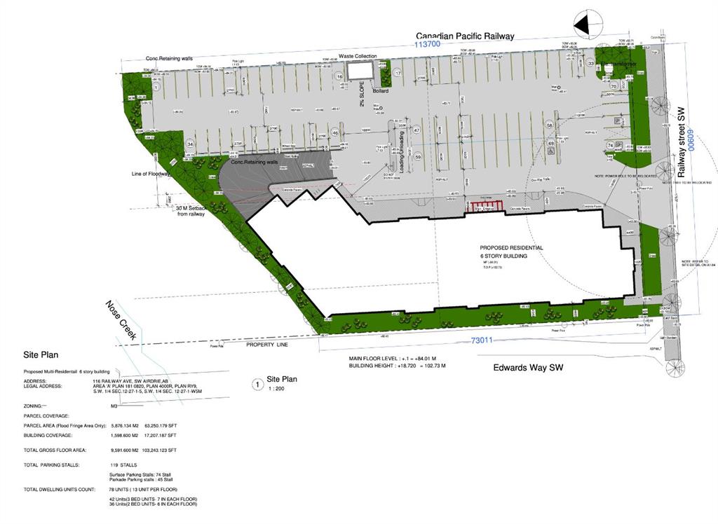 2.34 Acres of Vacant M-3 Zoned Land Prime multi-use site with an approved Development Permit for 78 residential units. Ideally located just east of Sobeys on Railway Avenue, surrounded by completed multifamily developments. A rare opportunity to launch your own construction project in a rapidly growing area.