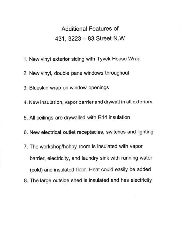 This charming home in the popular Greenwood Village community comes with numerous upgrades! It features a spacious eat-in kitchen with stunning knotty pine cabinetry, attractive laminate flooring, and two fireplaces that keep the space cozy during winter, complemented by a refurbished gas furnace rarely used by the current owner. The home offers a large living room, a great dining area in the kitchen, a generously sized primary bedroom, and a roomy second bedroom, making it a comfortable place to live. Upgrades include new exterior vinyl siding with Tyvek House Wrap, upgraded insulation, new drywall throughout, double-pane vinyl windows, new electrical outlets, switches, and lighting. There's also a fantastic workshop/hobby room with insulation, electricity, running water, and an insulated floor, easily accessible from inside the home. The large shed is also insulated and has electricity. The private backyard is perfect for BBQs, family gatherings, and gardening, with ample additional storage. Conveniently located across the alley from the new Farmer's Market, this affordable home offers easy access to the mountains and is just minutes from the ski hill at Calgary Olympic Park.