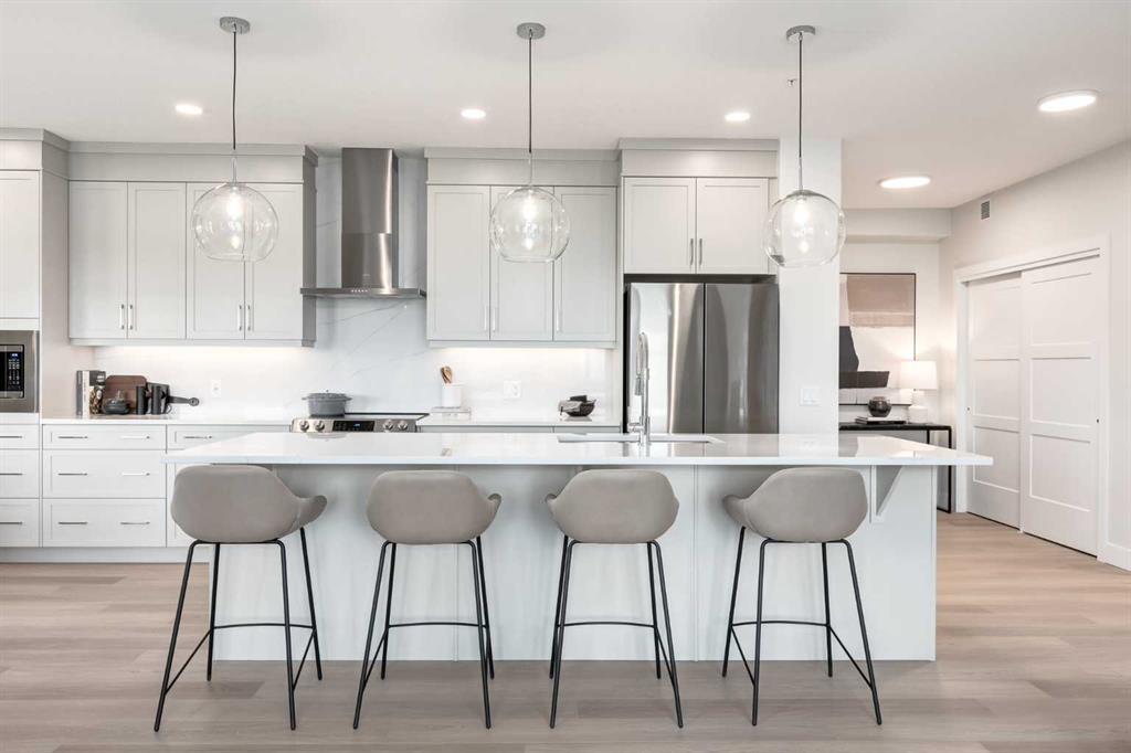 16 West is an impeccably designed boutique condominium by Cove Properties, one of Calgary’s most respected multifamily builders recognized for their unwavering commitment to quality craftsmanship. Bringing its signature spacious, single-level living to the forefront in Greenwich, Cove ensures there’s no need to compromise on space. Homes at 16 West range up to 1,469 sq. ft., offering the perfect fit for those looking to downsize, upsize, or rightsize their lifestyle. Cove believes Calgarians deserve more room to live. No more “shoebox” condos, these homes are designed to hold your furniture, your art, and your memories. Beyond generous layouts, 16 West features an enhanced sound attenuation program, delivering one of the quietest wood-framed condo living experiences in Calgary. Your new home is set on one of Greenwich’s finest locations, perched atop an exceptional site with mountain, downtown, and WinSport views. The Greenwich shopping district and Farmers’ Market are just a five-minute walk away, and downtown Calgary is only a quick ten-minute drive. Your new MANHATTAN unit, located on the third floor, offers 1,308 sq. ft. (RMS measurement) and 1,469 sq. ft. (architectural measurement) of beautifully designed, single-level living space. This home truly feels like a bungalow in the sky, featuring 2 large bedrooms, a spacious den/office, and 2 full bathrooms. Your home comes complete with a chef-inspired kitchen, spa-style bathrooms, in-suite laundry, custom cabinetry, designer-selected tile, quartz countertops, premium fixtures/finishes, and stainless steel appliances. The MANHATTAN also boasts a large private corner patio with 180-degree views of the WinSport ski slopes, environmental reserve, and the Alberta skyline. Also available are the Lexington B (1,340 sq. ft. architectural measurement) and Liberty (1,304 sq. ft. architectural measurement) floor plans, each offering exceptional living space, larger than most traditional bungalows. Please ask your agent for details on these additional units. 16 West offers a selection of 1 bed, 1 bed + den, 2 bed, and 2 bed + den homes ranging from 564 sq. ft. to 1,469 sq. ft. All floor plans include one titled underground parking stall, along with spacious private patios equipped w/ gas lines for BBQ season. There are 4 designer selection packages to choose from and a plethora of upgrades including but not limited to AC, luxury hard surface flooring, fireplaces and so much more. The Building is not built yet. Construction is tentatively scheduled to begin in Q2/Q3 2026, with completion and possession anticipated in Q3/Q4 2027. Final legal plans and property taxes are yet to be confirmed. RMS based on architectural plans. Photos shown are from Cove Properties’ previous show suites & do not represent the exact units. This is a limited opportunity to secure one of our spacious “bungalow-in-the-sky” homes. Contact your agent today to arrange a visit to our sales centre to review all floor plans, pricing, finishes & upgrades.