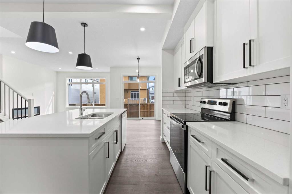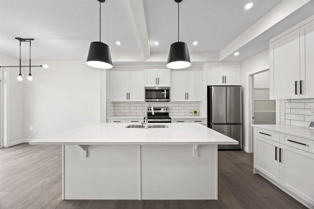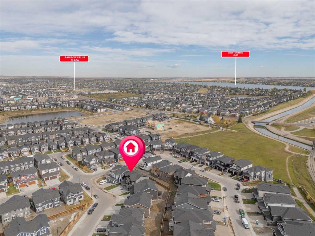 BRAND NEW SEMI DETACHED | LOADED WITH UPGRADES | SEPARATE ENTRANCE. Welcome to this brand new semi-detached home with a front double attached garage, perfectly located in the desirable community of Waterford. Designed with style and functionality in mind, this home boasts numerous upgrades throughout. Step inside to a bright, open foyer leading to the main floor, featuring 9-foot ceilings and beautiful engineered hardwood throughout. The open-concept kitchen showcases quartz countertops, stainless steel appliances, upgraded light fixtures, and painted cabinetry to ceiling height. It flows seamlessly into the spacious living room with an electric fireplace and dining area overlooking the large backyard — ideal for summer BBQs and outdoor entertaining. A convenient 2-piece bathroom completes the main level. Upstairs, the home offers three generously sized bedrooms, each with ample natural light and closet space. The primary suite is a true retreat, featuring a spacious walk-in closet and a luxurious ensuite with dual vanities. The additional bedrooms are perfect for family, guests, or a home office, and share a well-appointed 4-piece bathroom. Completing the upper level is a full-size laundry room for ultimate convenience. The unfinished basement includes a separate side entrance, providing flexibility for a future living space, guest suite, or investment opportunity. Tucked away on a quiet street, this home is just minutes from all the amenities Chestermere offers, including schools, parks, shopping, and the lake