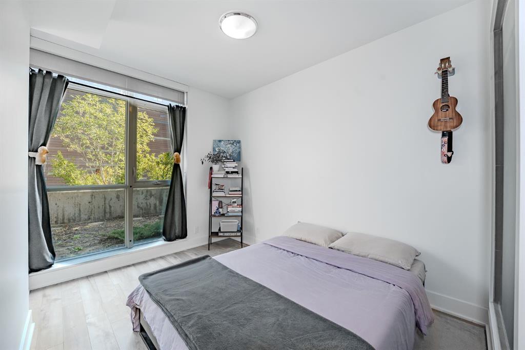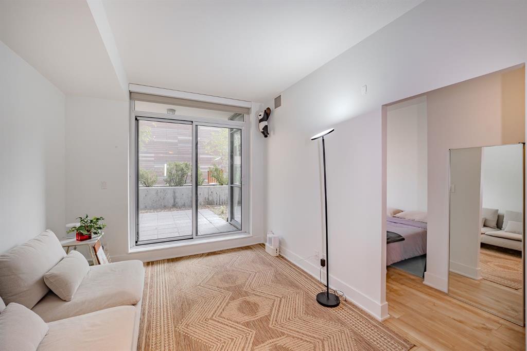 Welcome to the First, a modern condo in the heart of Calgary’s East Village. This one-bedroom, one-and-a-half-bath home offers a smart layout with beautiful finishes and plenty of natural light. Large windows fill the space with sunshine, and the private balcony overlooks a quiet courtyard, giving you a peaceful spot to enjoy your morning coffee or relax in the evening. The entryway opens into a practical foyer with a half bath for guests and a tucked-away laundry area. The kitchen stands out with stainless steel appliances, quartz countertops, a built-in oven, and soft-close cabinets. The island adds extra prep space and makes it easy to entertain or enjoy casual meals. The living area feels bright and open, flowing nicely into the bedroom. Behind a sliding barn door, you will find a large walk-in closet and a stylish ensuite with a glass rainfall shower that feels like your own private spa. You will also have central air conditioning, a titled underground parking stall, and a large storage locker for convenience. The building offers great amenities, including a fitness center, yoga room, party lounge with a kitchen and bar, sky club with a pool table, business meeting room, and a rooftop patio with BBQs. Located steps from the Bow River pathways, the Simmons Building, the Central Library, and plenty of shops and restaurants, this is a perfect spot for anyone who wants to enjoy city living with comfort and style. Whether you are an investor, professional, or student, this home offers the ideal mix of convenience, design, and location.