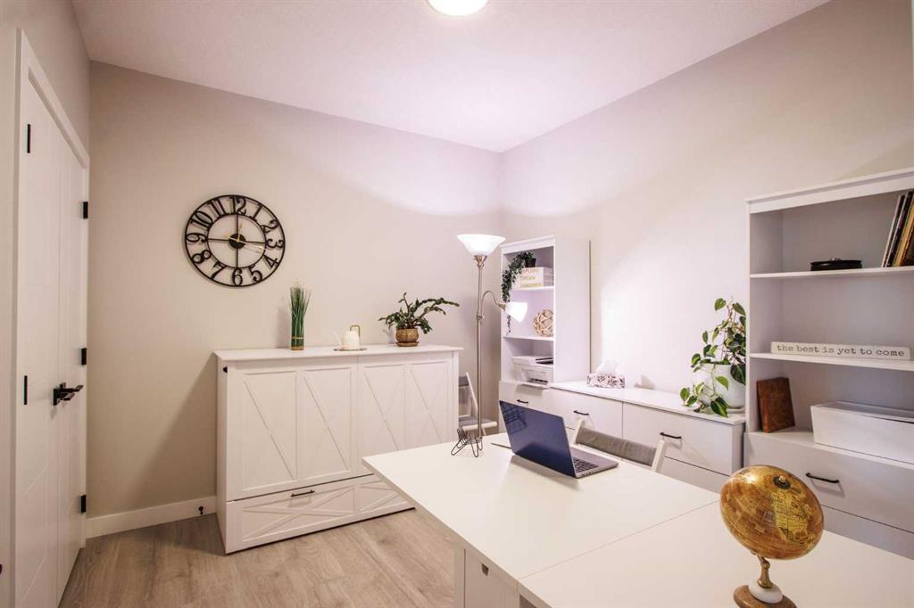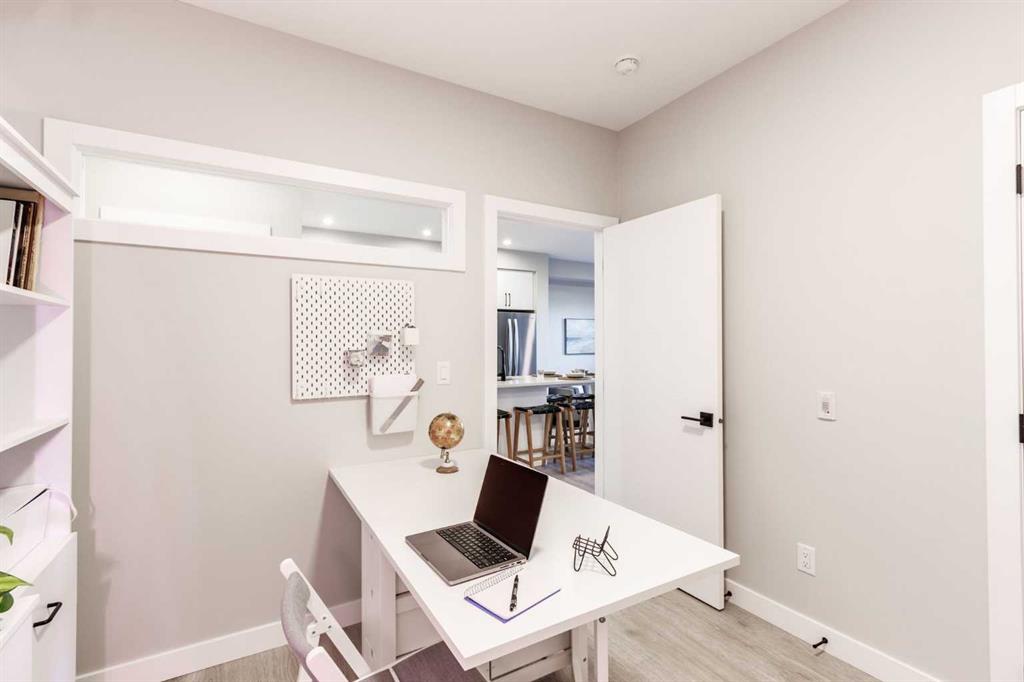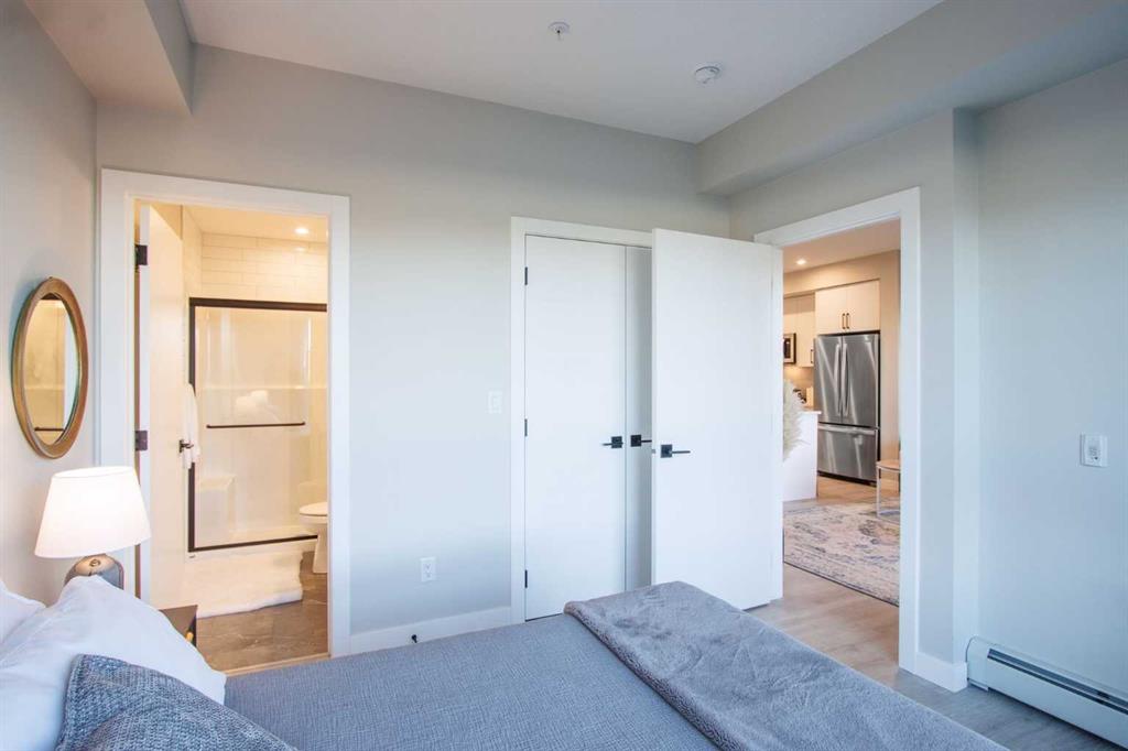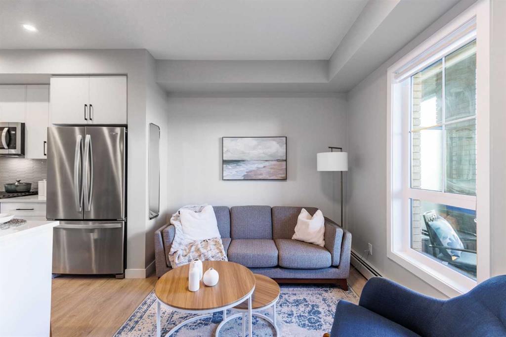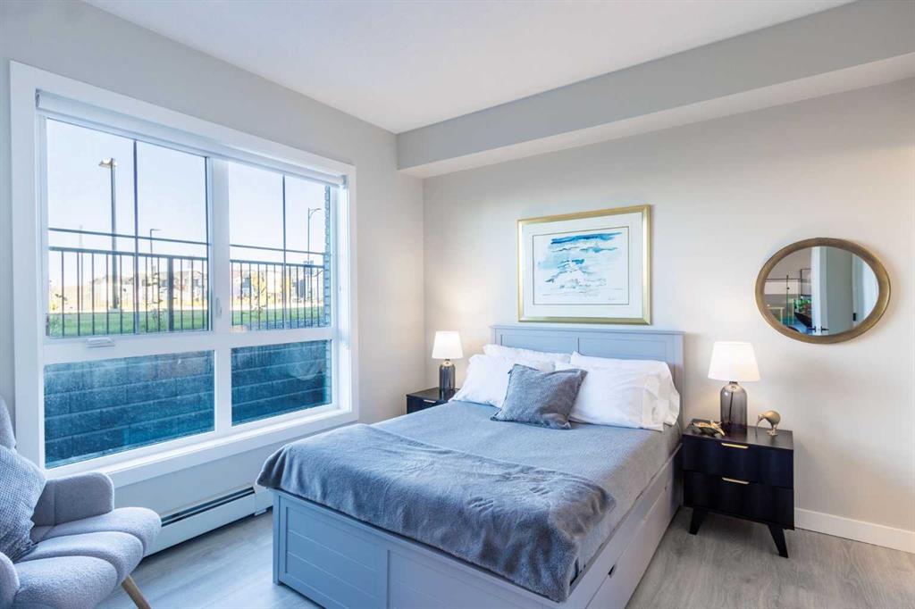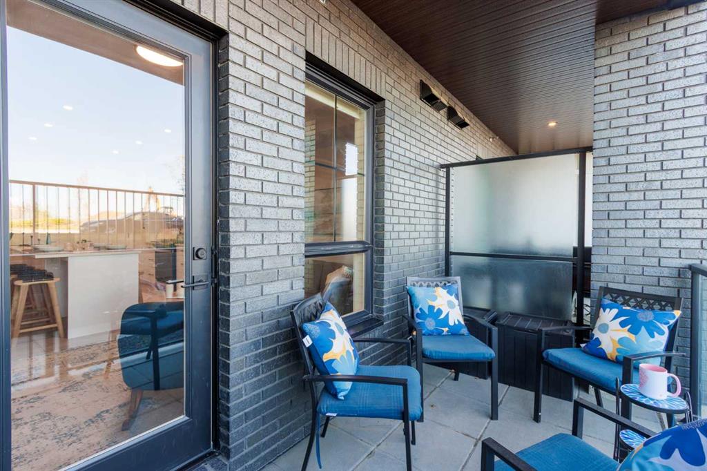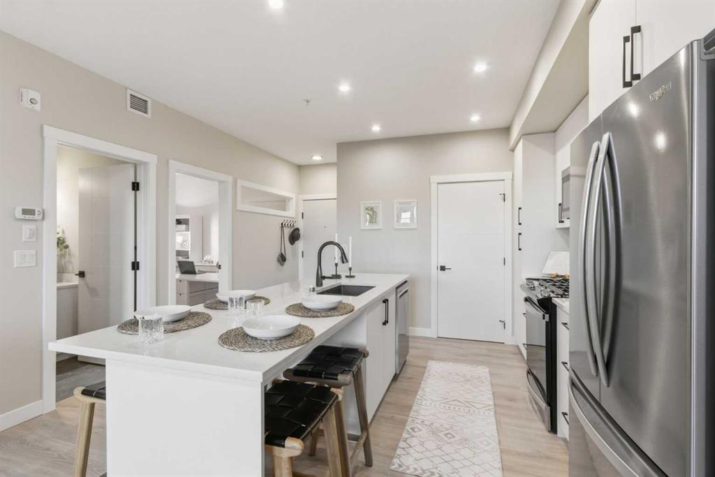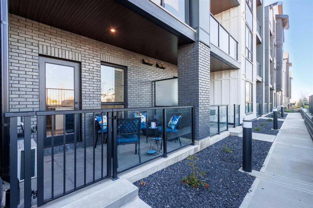 Welcome to Lawrie Park, located on north side of Okotoks. This beautifully upgraded condo, built in 2024 and well cared for, is move-in ready. What makes this home truly special is the extra door to the gated patio, with street access across the road to the off-leash dog park. Enjoy having your own front door while still benefiting from low-maintenance condo living with snow removal, lawn care, and exterior upkeep are all taken care of. With only condo fees, taxes, power, and TV to consider, this is an excellent low-cost, lock-and-leave option, ideal for travellers, new home buyers, busy professionals, or anyone seeking simplicity without sacrifice. Inside, the open-concept design showcases 9-ft ceilings, large windows, and a modern aesthetic. The upgraded white kitchen features a gas stove, upgraded quartz island with built-in dining, extra drawers for storage, and a third drawer in the dishwasher. The condo has the black upgrade package with black door handles and hinges and bathroom fixtures; there are no rugs, just durable laminate flooring throughout. The living area flows directly to the private patio, which offers excellent privacy while sheer drapes allow natural light while maintaining discretion inside. The spacious primary suite includes an ensuite with a walk-in shower. The second bedroom is flexible—ideal for guests, hobbies, or as an office. Additional features include air conditioning, in-suite laundry, a heated underground parking stall (always a warm vehicle in winter), and a storage locker. Lawrie Park provides a true sense of community, with a private basketball court, community gardens, and gathering spaces. The surrounding Wedderburn neighbourhood includes walking paths, a pond, playground, pump track, off leash dog park and easy access to D’Arcy Crossing with Safeway, Starbucks, PetValu, Shoppers Drug Mart. Calgary is just 15 minutes away, making commuting simple and convenient. With modern upgrades, pet-friendly living, and immediate possession, this home combines the benefits of condo ownership with the comfort of your own private outdoor entrance. Move in and enjoy everything Lawrie Park offers.